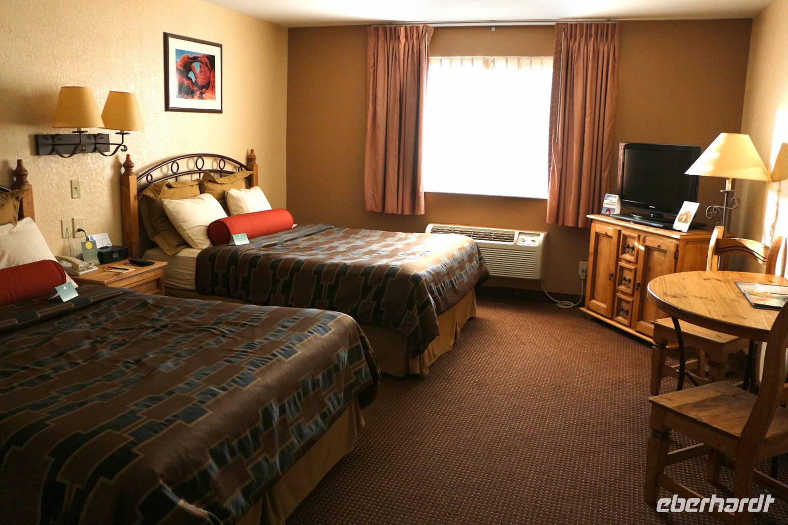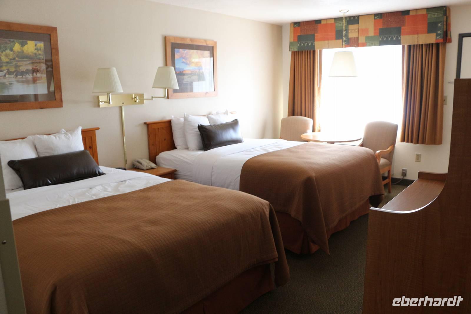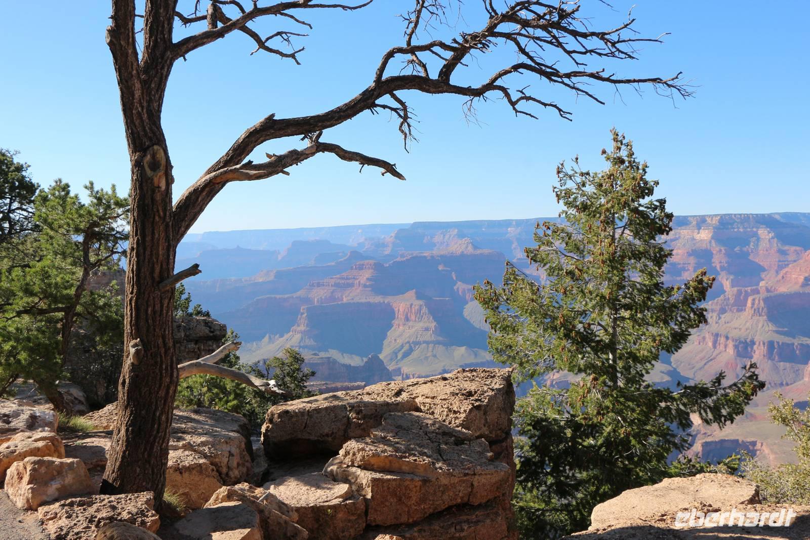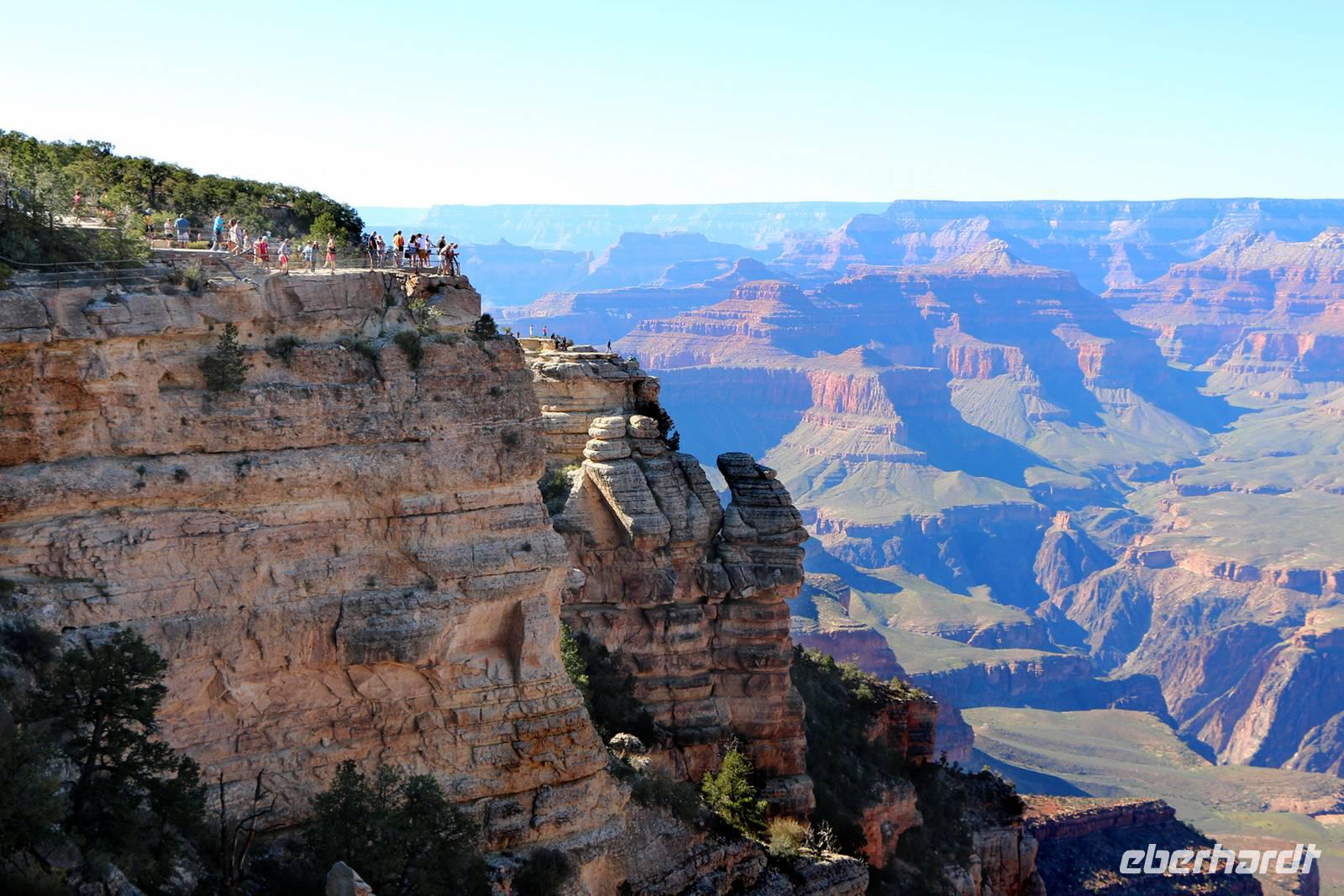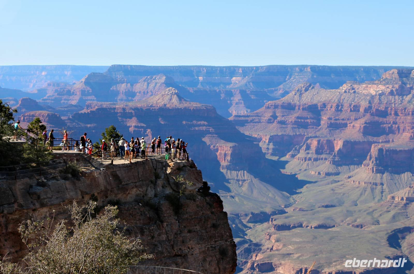 Nach dem beeindruckenden Rundflug fahren wir mit dem Bus zum Aussichtspunkt Mather Point am Rand des Canyons. Von hier starten wir eine vier Kilometer lange Wanderung entlang der Abbruchkante. Der Weg ist gut befestigt bzw. asphaltiert ohne große Steigungen und bietet tolle Ausblicke in den Grand Canyon. Unterwegs kann man mit Glück auch Felsenhörnchen und Kondore beobachten oder man lässt die Stille und Weite des Canyons einfach einmal auf sich wirken. Bei schönem Wetter und genug Zeit ist diese Wanderung absolut empfehlenswert! Unser Hotel liegt direkt am Nationalpark, so dass wir hier nur kurze Wege fahren müssen und am nächsten Morgen noch einen Abstecher zum Canyon machen können. Unweit des Hotels sehen wir sogar einige Wapiti-Hirsche. Nach einem sehr guten Buffet lassen wir den Abend an der Hotelbar ausklingen.