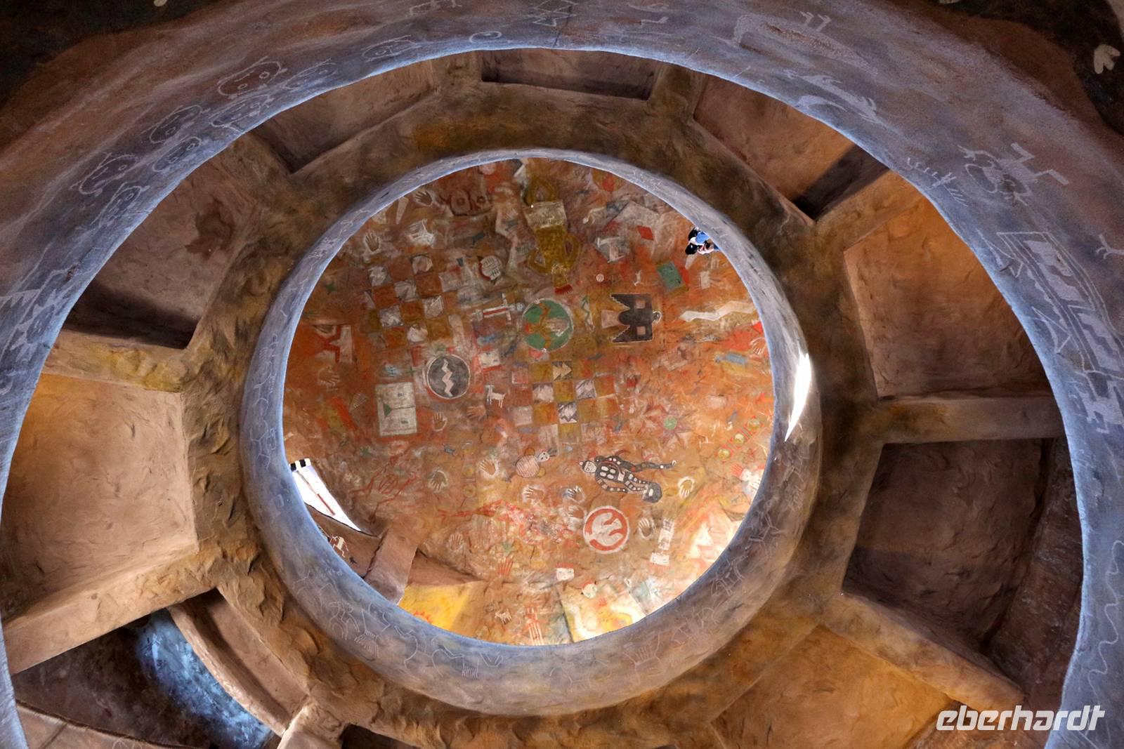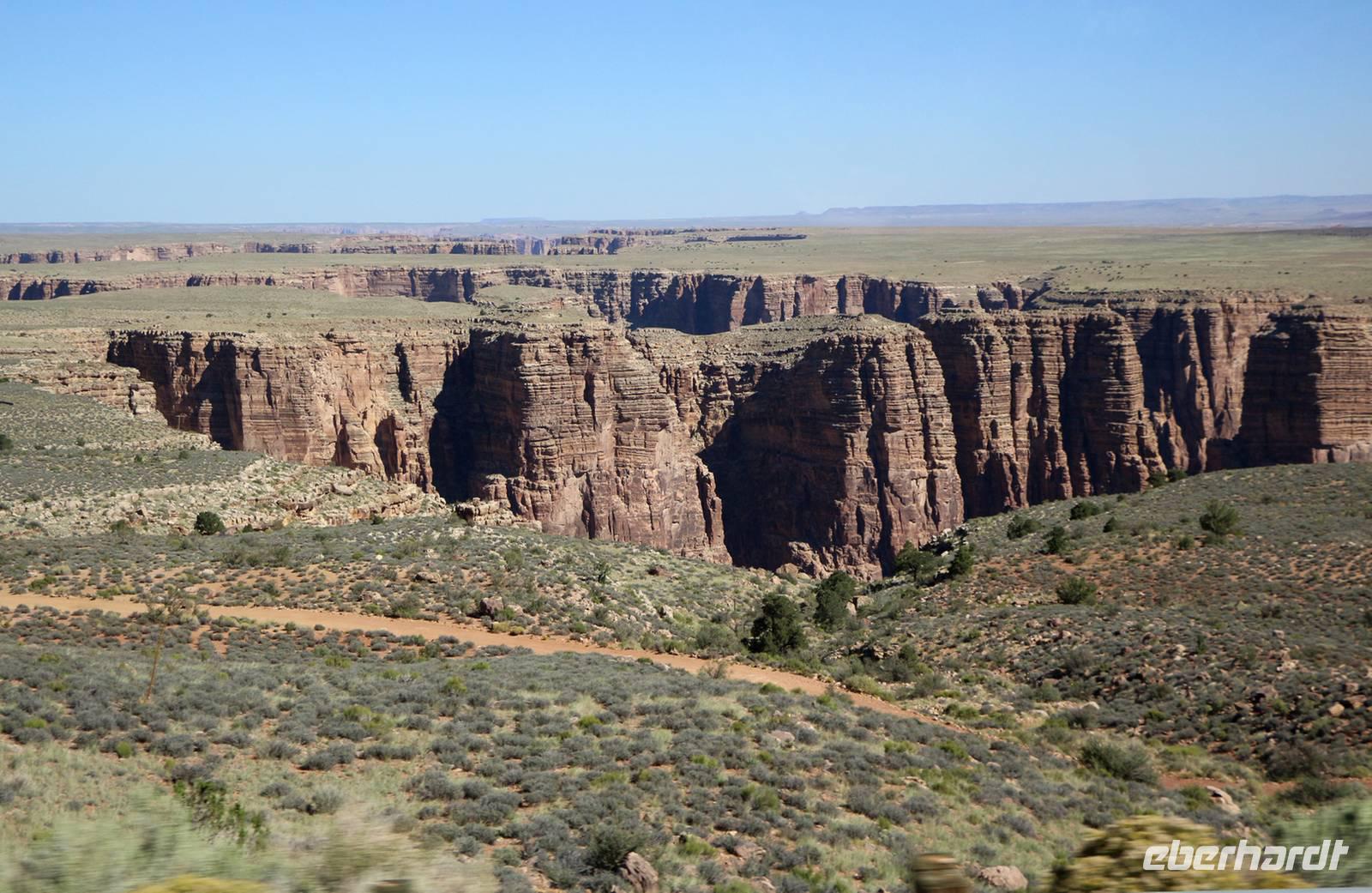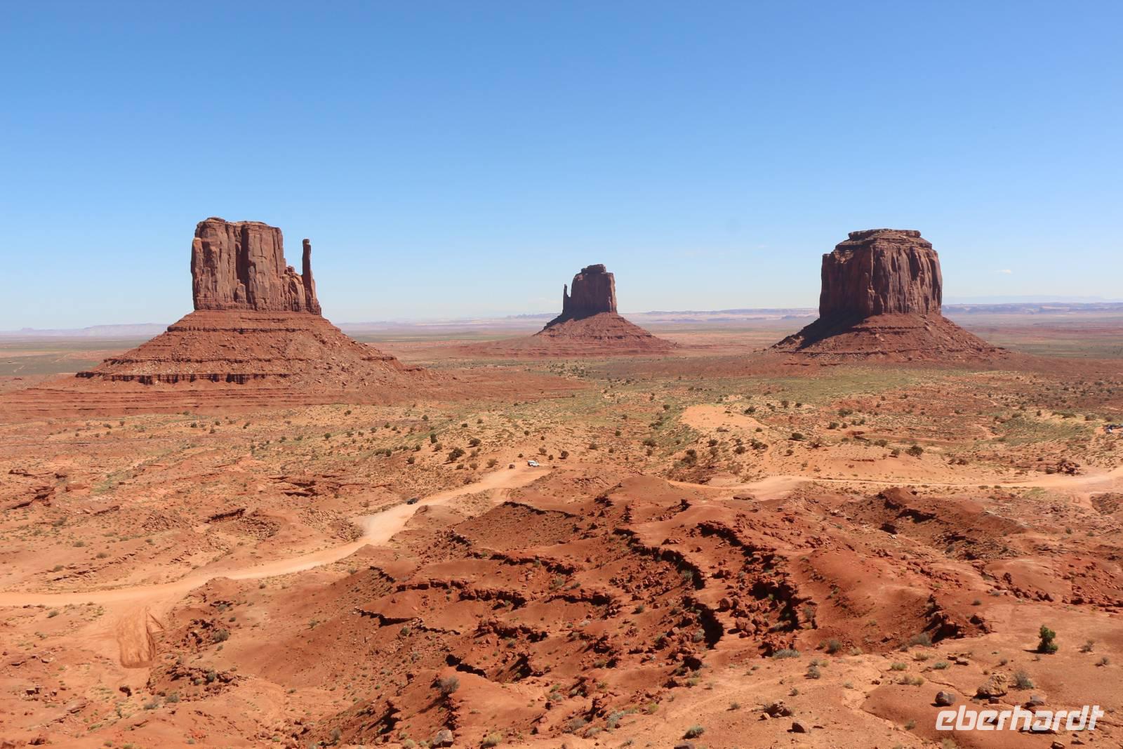 Noch einmal legen wir einen Fotostopp am östlichen Rand des Grand Canyon, am Desert View Point, ein. Hier gibt es einen rekonstruierten Wachturm der Hopi-Indianer, den man kostenfrei hinauf steigen kann. Im Inneren kann man typische Wandmalereien der Indianer sehen. Von oben werfen wir einen letzten Blick in den Grand Canyon bei Morgenlicht, bevor wir weiter reisen in Richtung Nordosten. Durch das Gebiet der Navajo-Indianer, die heute natürlich auch modern mit Auto und Supermarkt leben, erreichen wir das bekannte Monument Valley - das Tal der Monumente. Diese Monumente sind einzeln stehende Felsenreste des großen Colorado Plateaus, das einst das ganze Gebiet bedeckte. Durch Erosion wurden große Teile des Plateaus abgetragen und übrig blieben die skurril geformten Felsen, die bei den Indianern alle mit einem eigenen Namen wie Eule, Daumen, drei Schwestern usw. versehen sind.