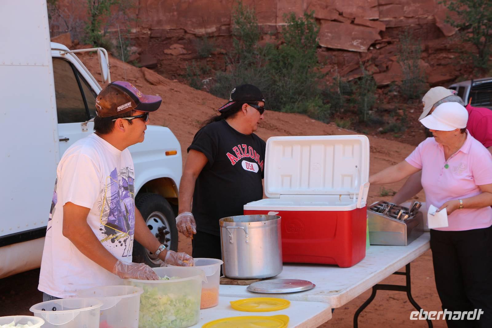 Die roten Tafelberge dienten schon bei zahlreichen Dreharbeiten als Kulisse. Bei uns sind sie vor allem durch Westernfilme und die Marlboro-Werbung als Inbegriff des "Wilden Westens" bekannt. Hier können wir auch zwei der traditionellen Lehm-Rundhäuser der Navajo besichtigen, in denen sie früher gelebt haben. Mit zwei Navajo-Indianern geht es dann auf eine Jeeptour durch das Monument Valley. Die Jeeps sind mit einem Sonnendach überspannt, sonst aber rundum offen, was bei Temperaturen um 35 bis 40 °C ganz angenehm ist. Nur gegen den feinen roten Sandstaub sollte man sich mit einem Tuch oder einer leichten Windjacke schützen. Bei einer Rundfahrt stoppen wir an verschiedenen Aussichtspunkten: dem John Ford Point (bekannt aus der Marlboro-Werbung), dem linken und rechten Handschuh und dem North Window. Überall wird auch Indianer-Schmuck verkauft. In der fast dreistündigen Tour ist auch eine Mittagspause enthalten, in der man für 6 USD ein Navajo-Taco-Essen dazu buchen kann. Dabei halten wir an einem Picknickplatz inmitten der beeindruckenden Felsenlandschaft und unsere Fahrer und weitere Navajos bereiten uns Navajo-Taco zu - ein fritiertes Fladenbrot mit Salat, roter Bohnensoße, Tomaten, Käse und Dip. Dazu gibt es kühle Getränke. Auf der Rückfahrt singen unsere Fahrer ein traditionelles Totemlied der Navajo-Indianer. Wir steigen wieder in unseren Reisebus und überqueren die Grenze zum Bundesstaat Utah. Da hier Mountain Time herrscht, stellen wir unsere Uhren um eine Stunde vor. Am Abend erreichen wir das Städtchen Moab, wo wir die nächsten zwei Tage übernachten. Unser Abendessen findet heute in der Moab Brewery statt - einer kleinen Bierbrauerei, in der man viele verschiedene Biersorten bestellen kann.