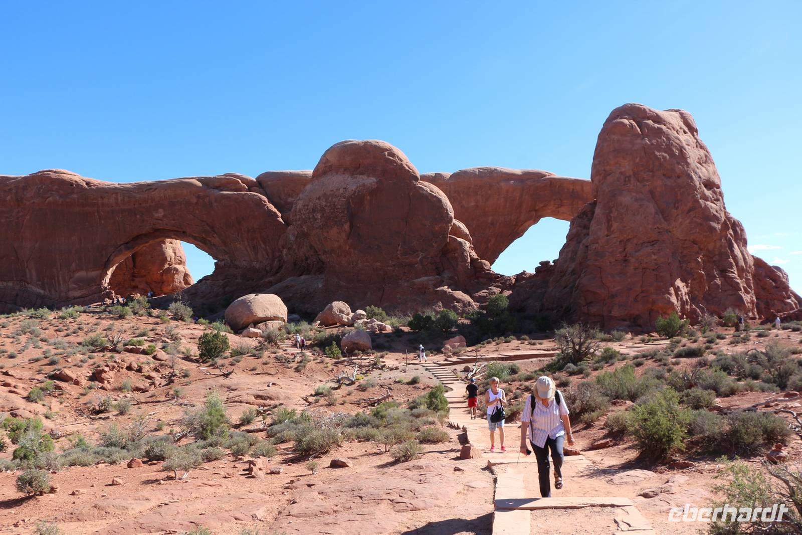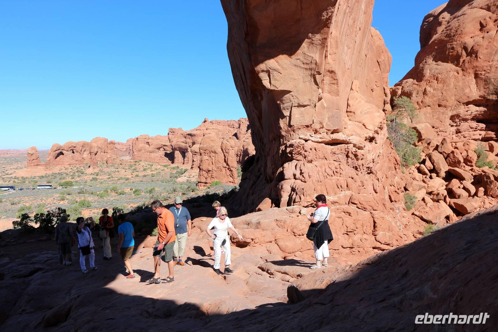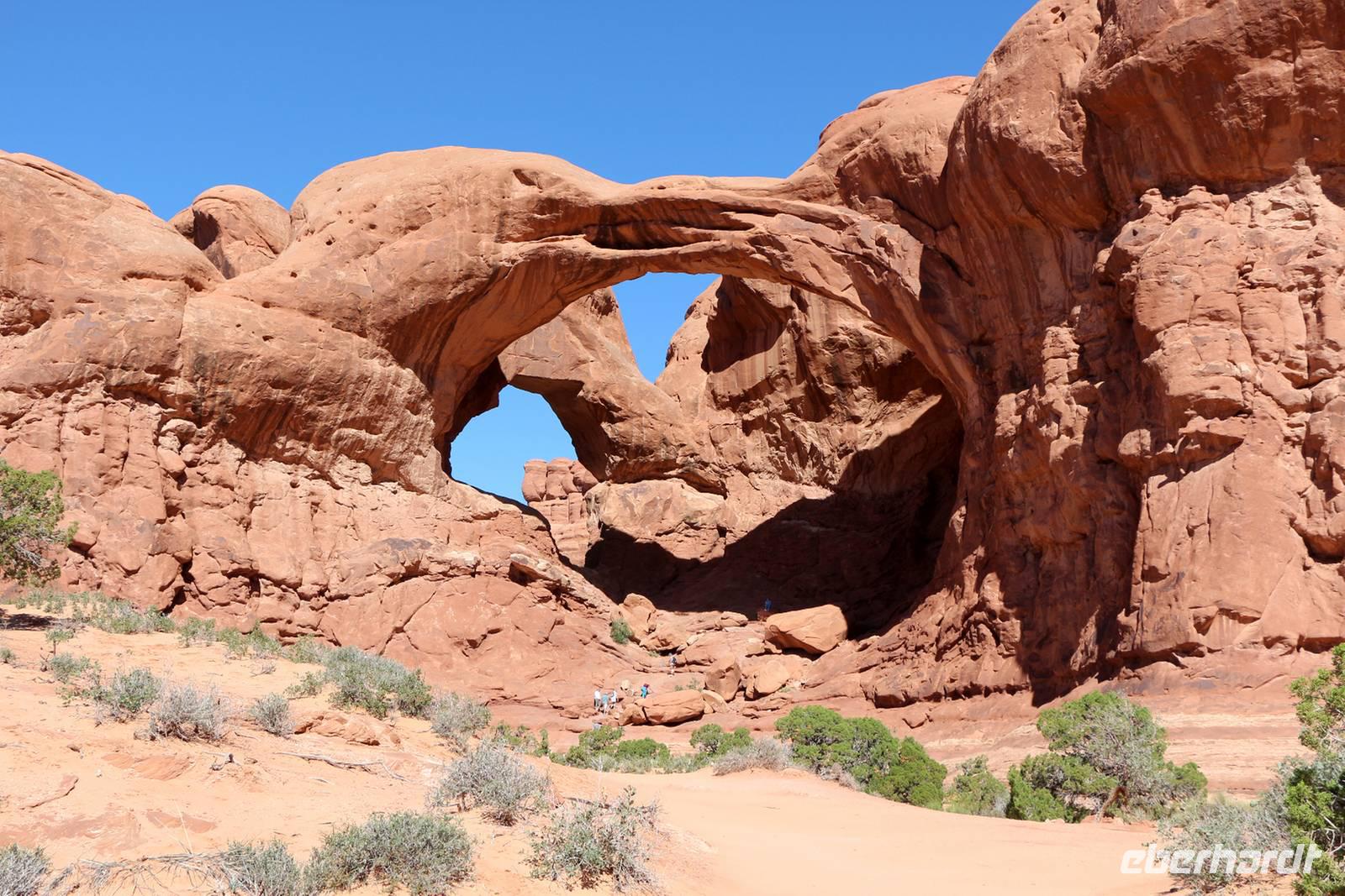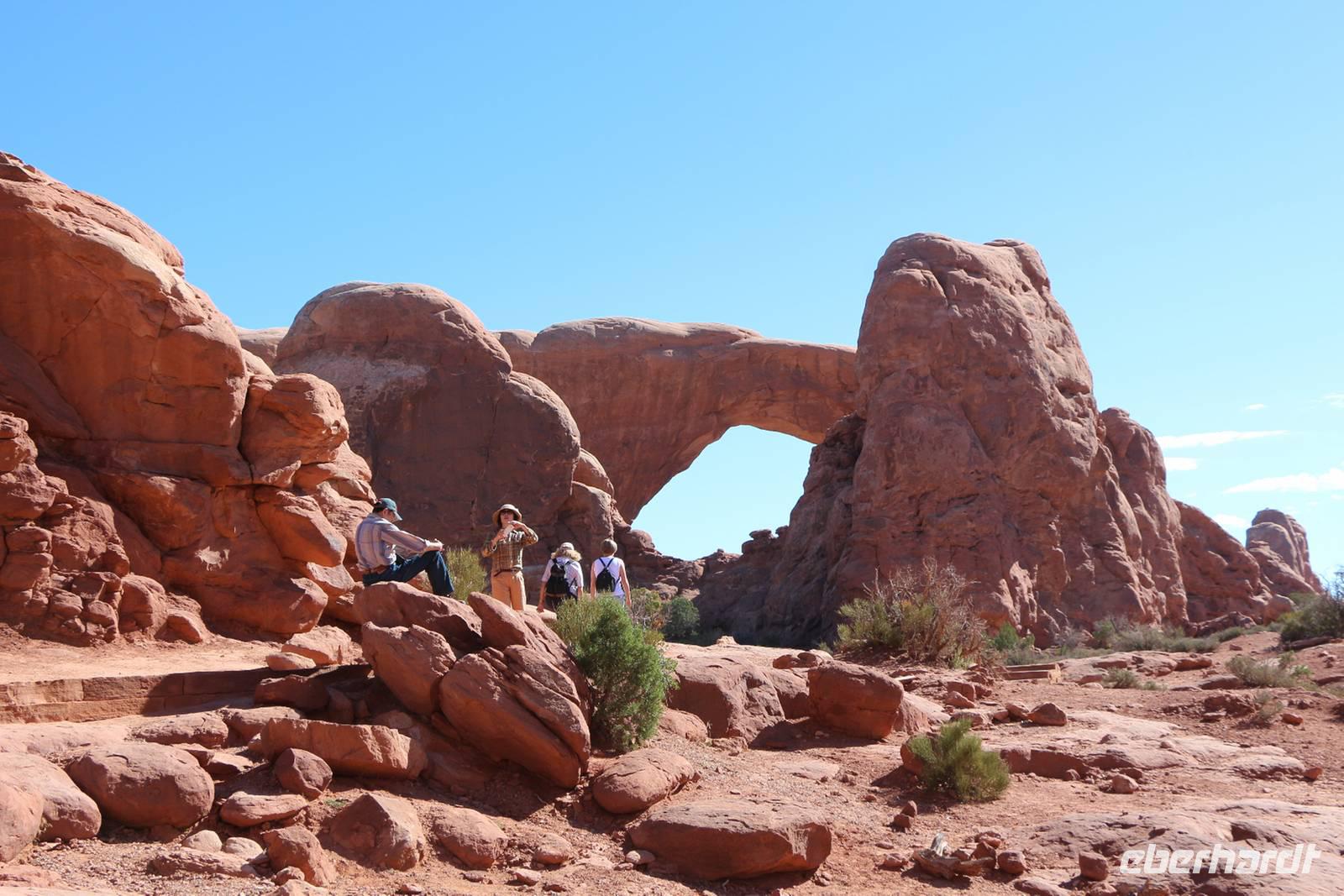 Nur etwa 30 Minuten Fahrtzeit von Moab entfernt, liegt der Arches Nationalpark, der den Namen wegen seiner beeindruckenden Felsentore trägt. Die Window Section ist der Teil, der die meisten großen Felsentore zur näheren Besichtigung bietet. Hier haben wir 1,5 Stunden Zeit, die Felsenlandschaft mit den großen Steinfenstern und Bögen bei Spaziergängen zu erkunden. Blauer Himmel, die Sonne und die roten Felsen bescheren uns jede Menge Fotomotive. Besonders sehenswert ist auch der Double Arch, ein Felsentor mit zwei Bögen hintereinander. Am kleinen Felsbogen Delicate Arch legen wir einen weiteren Fotostopp ein, bevor wir den Nationalpark verlassen und weiter in Richtung Canyonlands fahren.