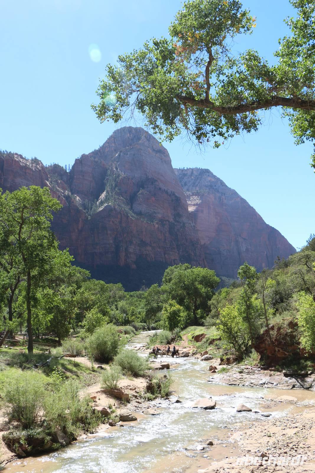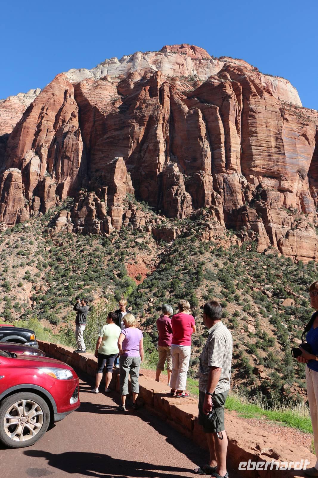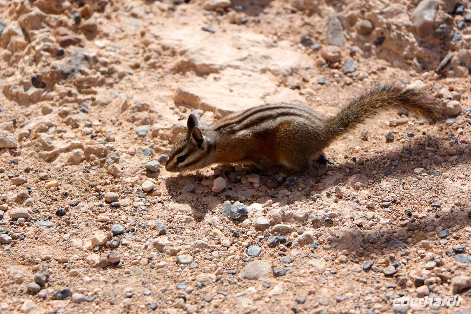 In der Nähe des Bryce Canyon legen wir am Morgen einen Fotostopp am Red Canyon ein. Die Felsformation "Salz- und Pfefferstreuer" leuchtet rot in der Morgensonne. Gegen Mittag erreichen wir den Zion Nationalpark ganz im Südwesten Utahs, der wieder mit ganz anderen Gesteinsformationen besticht. Wir halten am "Schachbrett-Felsen", auf dem sich horizontale und vertikale Linien wie auf einem Schachbrettmuster befinden. Unterwegs sehen wir sogar ein paar Dickhornschafe am Straßenrand. Durch einen Tunnel und Serpentinen geht es hinunter zum Zion Canyon Besucherzentrum, wo es einen Rastplatz mit Restaurant und Cafe gibt. Von hier kann man zu zahlreichen Wanderungen durch die Canyon-Landschaft aufbrechen. Wir haben Zeit für ein Mittagspicknick oder einen Spaziergang entlang der Wanderwege oder am Virgin River. Auch hier sollte man nach Tieren Ausschau halten, wir sehen Streifenhörnchen, Biberspuren und einen Maultierhirsch. Schließlich geht unsere Fahrt weiter in Richtung Las Vegas.