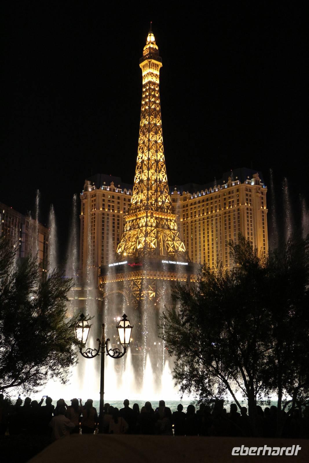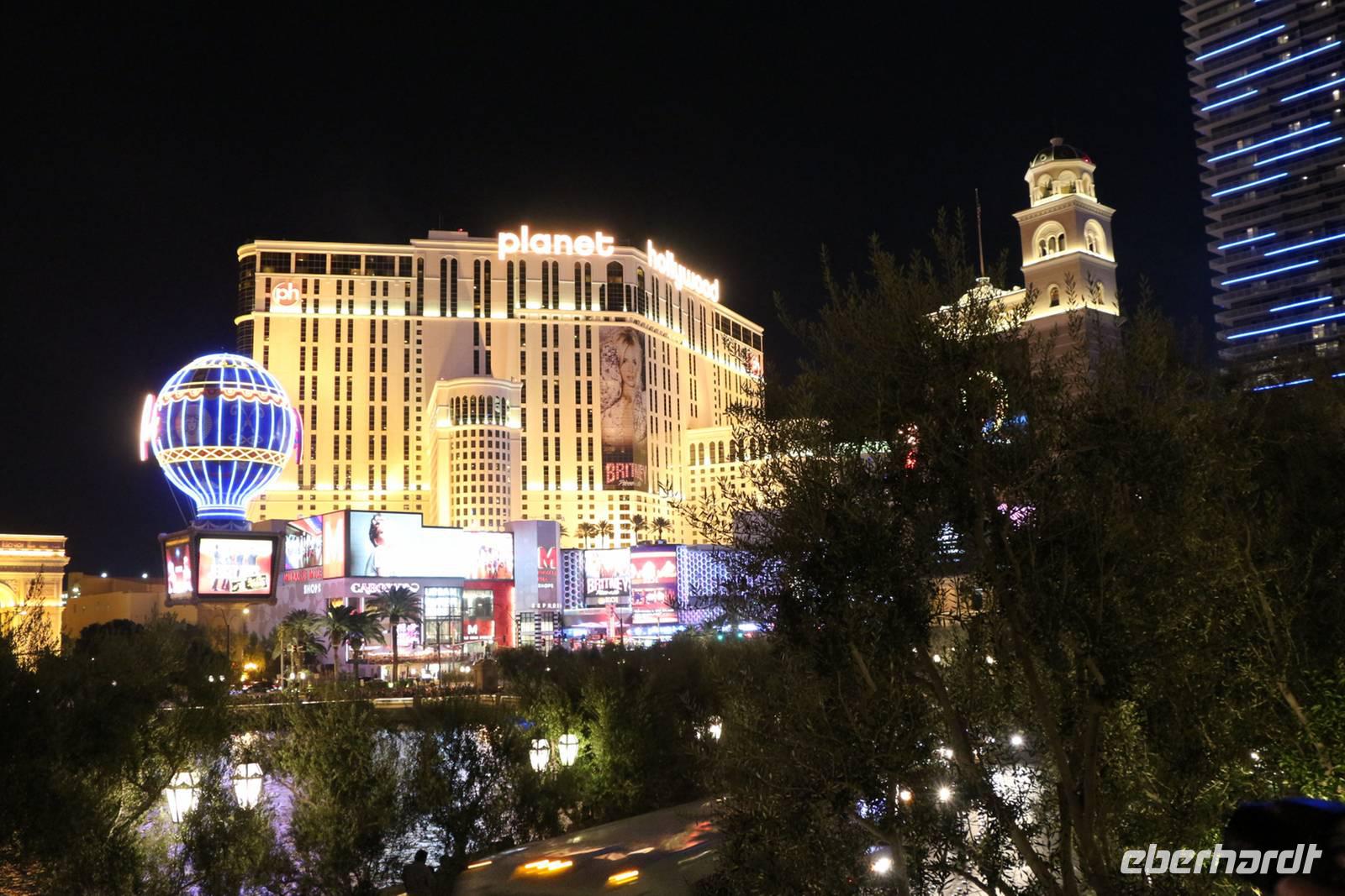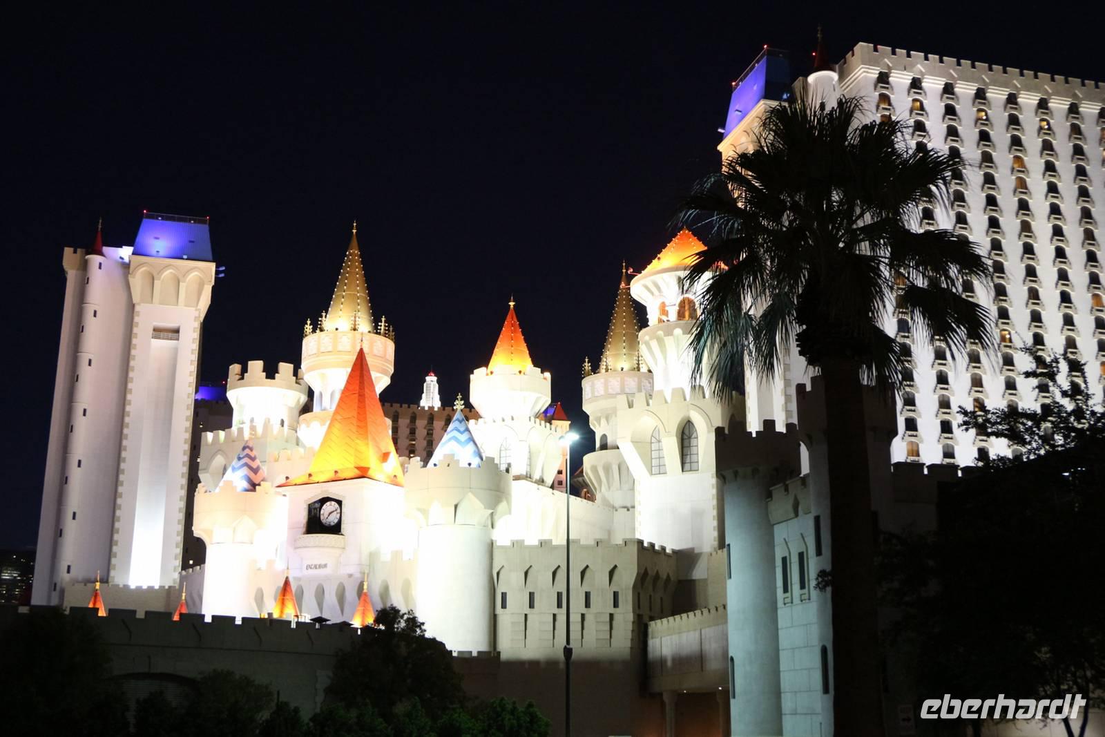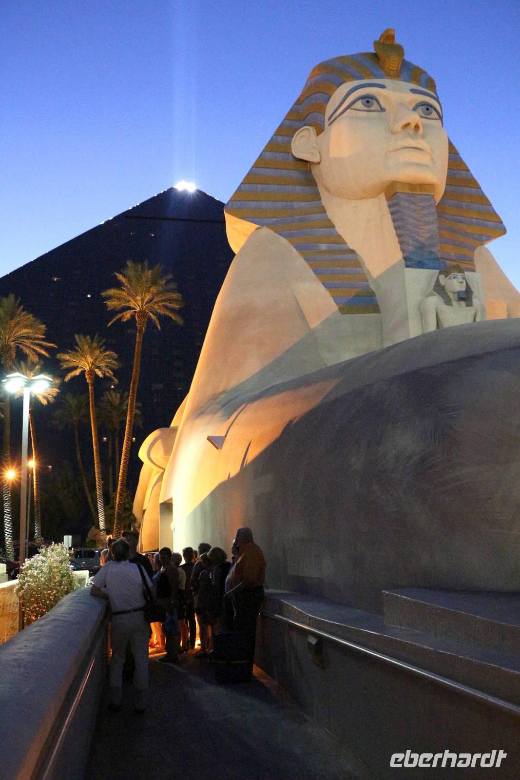Am späten Nachmittag erreichen wir eine der Städte, die niemals schläft: Las Vegas - das Kontrastprogramm zur ruhigen Natur der Nationalparks . Wir beziehen unsere Zimmer im Hotel "Luxor", einer riesigen Pyramide, die den Außmaßen der ägyptischen Cheops-Pyramide entspricht. Das ist das verrückte Amerika! Wie in allen Hotels von Las Vegas gibt es im Erdgeschoss ein großes Casino, in dem Spieler Tag und Nacht verbringen. Vor der Pyramide stehen sogar ein Obelisk und eine gewaltige Sphinx, durch die man das Hotel betritt. Nach unserem Abendessen vom reichhaltigen Buffet im Hotel treffen wir uns mit Reiseleiterin Janny zur abendlichen Stadtrundfahrt - der Las Vegas bei Nacht Tour. Nach den Erklärungen zur Architektur unseres eigenen Hotels "Luxor" steigen wir in den Bus und fahren den Las Vegas Boulevard hinauf, der auch Las Vegas Strip genannt wird. An ihm liegen alle die berühmten Hotels und Sehenswürdigkeiten der Stadt. Nächster Besichtigungspunkt ist das 5-Sterne-Hotel "Bellagio", das durch seine luxuriöse Lobby, den mit einem Blumenmeer bepflanzten Wintergarten und dem größten Schokoladenbrunnen der Welt beeindruckt. Das "Bellagio" ist für seine Wassershow berühmt, die jeden Abend am künstlichen See vor dem Hotel stattfindet. Das lassen wir uns nicht entgehen! Die Wasserspiele und Fontänen bewegen sich zur Musik vor der beleuchteten Kulisse des Las Vegas Strip.