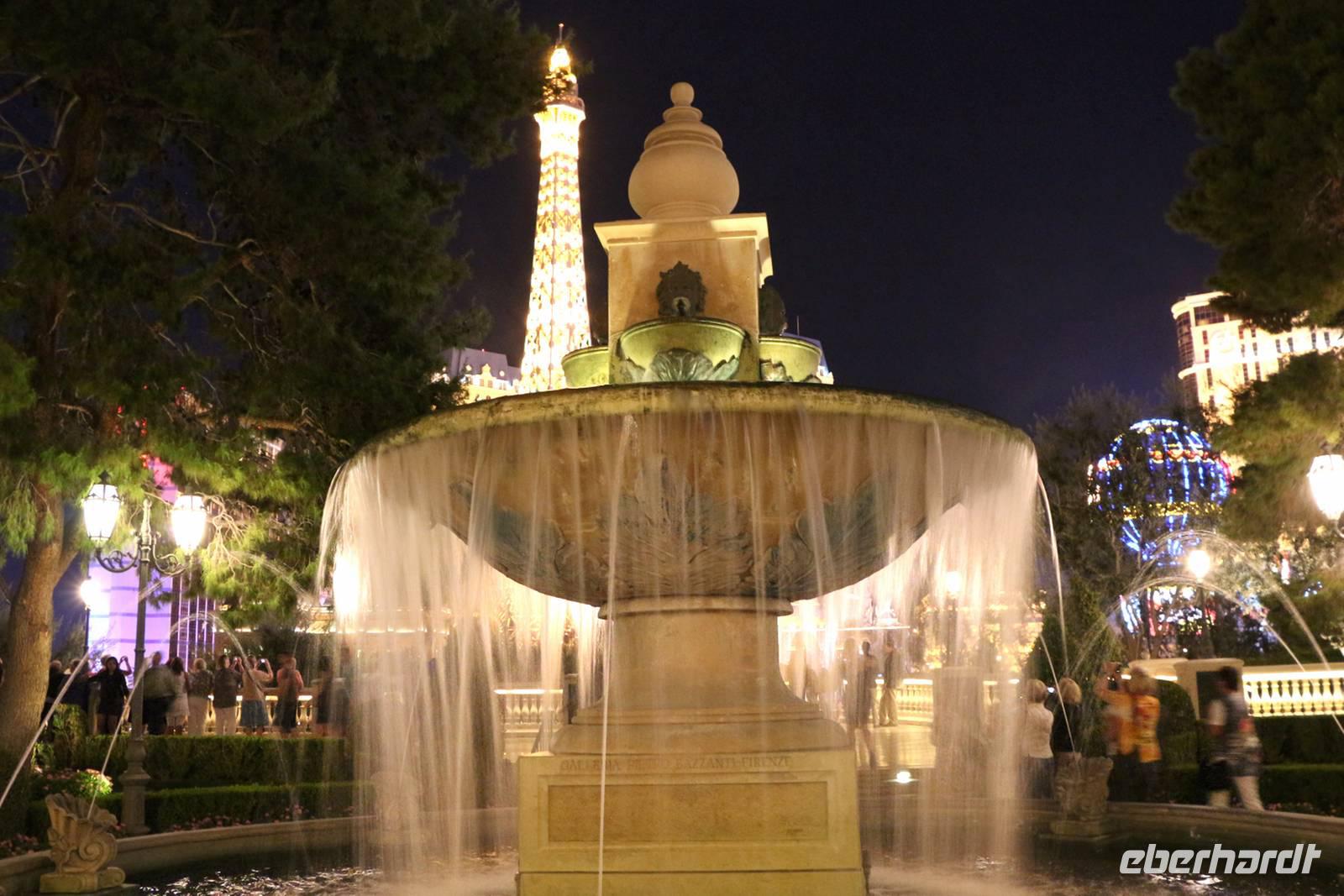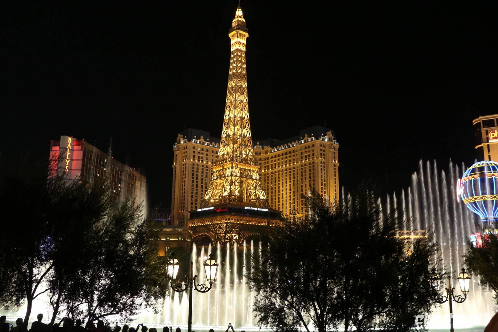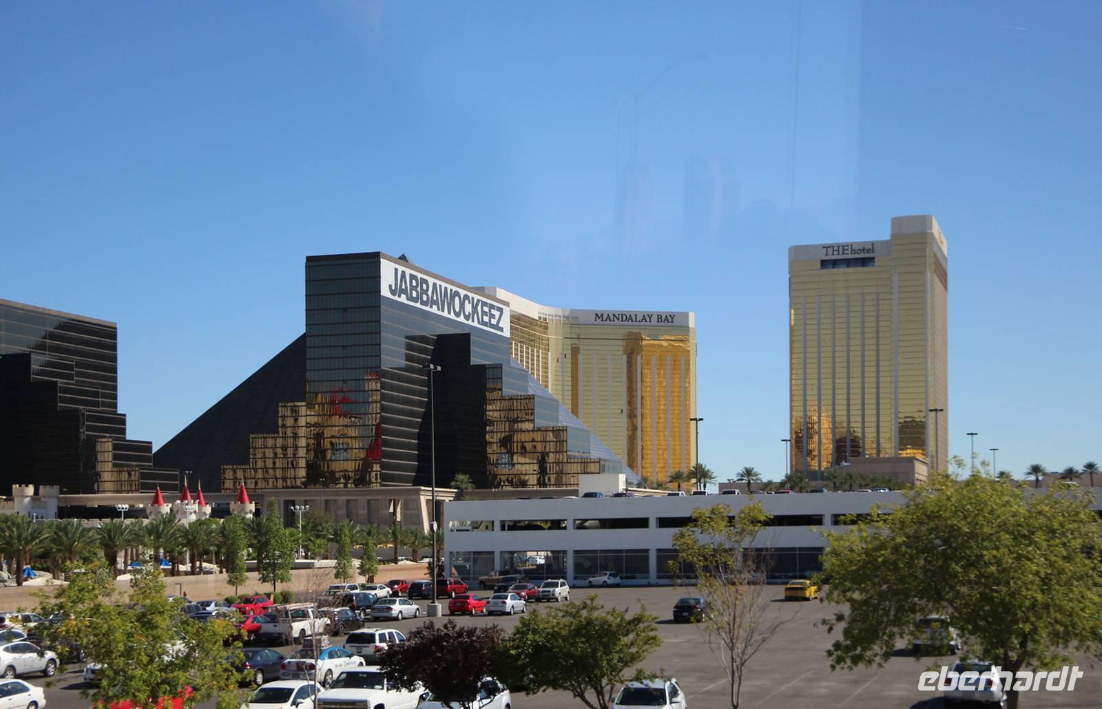 Am späten Nachmittag erreichen wir eine der Städte, die niemals schläft: Las Vegas - das Kontrastprogramm zur ruhigen Natur der Nationalparks . Wir beziehen unsere Zimmer im Hotel "Luxor", einer riesigen Pyramide, die den Außmaßen der ägyptischen Cheops-Pyramide entspricht. Das ist das verrückte Amerika! Wie in allen Hotels von Las Vegas gibt es im Erdgeschoss ein großes Casino, in dem Spieler Tag und Nacht verbringen. Vor der Pyramide stehen sogar ein Obelisk und eine gewaltige Sphinx, durch die man das Hotel betritt. Nach unserem Abendessen vom reichhaltigen Buffet im Hotel treffen wir uns mit Reiseleiterin Janny zur abendlichen Stadtrundfahrt - der Las Vegas bei Nacht Tour. Nach den Erklärungen zur Architektur unseres eigenen Hotels "Luxor" steigen wir in den Bus und fahren den Las Vegas Boulevard hinauf, der auch Las Vegas Strip genannt wird. An ihm liegen alle die berühmten Hotels und Sehenswürdigkeiten der Stadt. Nächster Besichtigungspunkt ist das 5-Sterne-Hotel "Bellagio", das durch seine luxuriöse Lobby, den mit einem Blumenmeer bepflanzten Wintergarten und dem größten Schokoladenbrunnen der Welt beeindruckt. Das "Bellagio" ist für seine Wassershow berühmt, die jeden Abend am künstlichen See vor dem Hotel stattfindet. Das lassen wir uns nicht entgehen! Die Wasserspiele und Fontänen bewegen sich zur Musik vor der beleuchteten Kulisse des Las Vegas Strip.