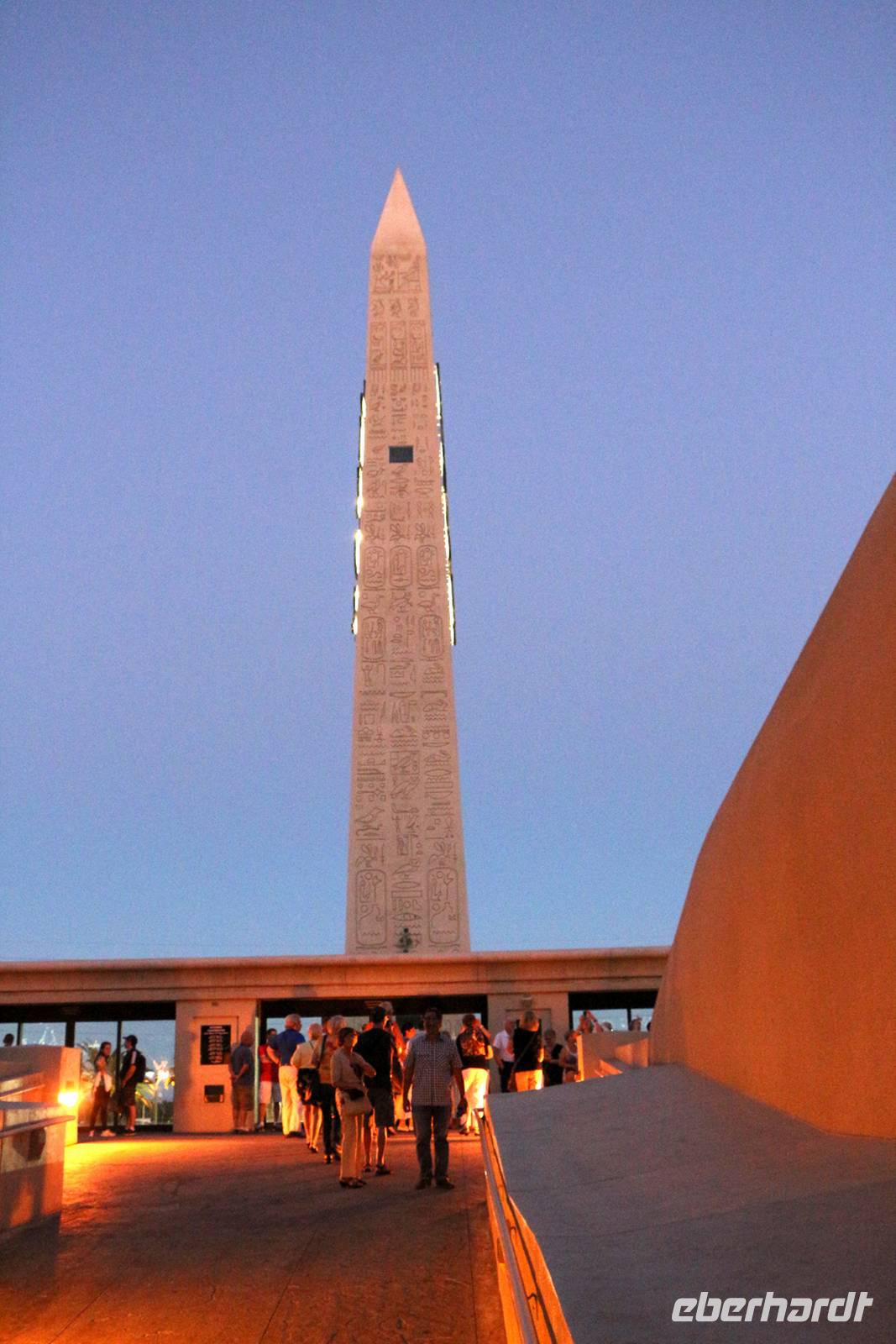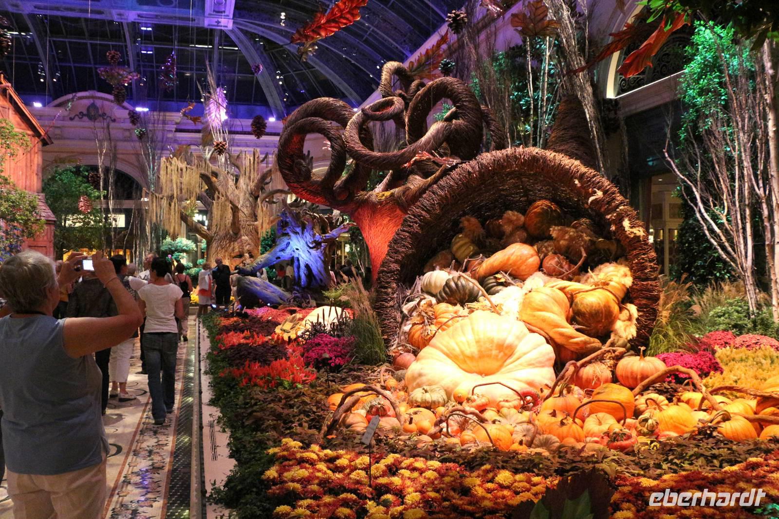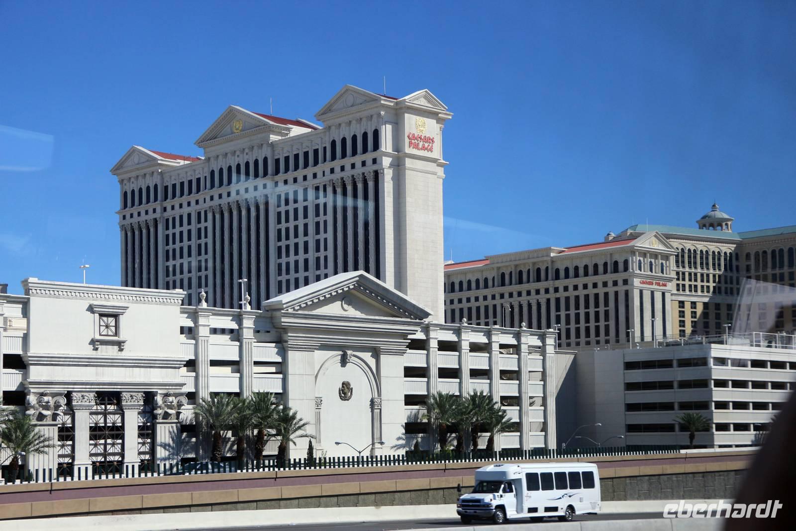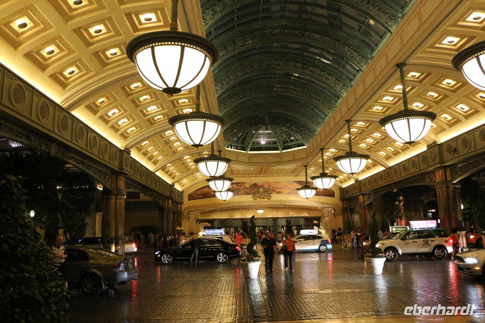 Am späten Nachmittag erreichen wir eine der Städte, die niemals schläft: Las Vegas - das Kontrastprogramm zur ruhigen Natur der Nationalparks . Wir beziehen unsere Zimmer im Hotel "Luxor", einer riesigen Pyramide, die den Außmaßen der ägyptischen Cheops-Pyramide entspricht. Das ist das verrückte Amerika! Wie in allen Hotels von Las Vegas gibt es im Erdgeschoss ein großes Casino, in dem Spieler Tag und Nacht verbringen. Vor der Pyramide stehen sogar ein Obelisk und eine gewaltige Sphinx, durch die man das Hotel betritt. Nach unserem Abendessen vom reichhaltigen Buffet im Hotel treffen wir uns mit Reiseleiterin Janny zur abendlichen Stadtrundfahrt - der Las Vegas bei Nacht Tour. Nach den Erklärungen zur Architektur unseres eigenen Hotels "Luxor" steigen wir in den Bus und fahren den Las Vegas Boulevard hinauf, der auch Las Vegas Strip genannt wird. An ihm liegen alle die berühmten Hotels und Sehenswürdigkeiten der Stadt. Nächster Besichtigungspunkt ist das 5-Sterne-Hotel "Bellagio", das durch seine luxuriöse Lobby, den mit einem Blumenmeer bepflanzten Wintergarten und dem größten Schokoladenbrunnen der Welt beeindruckt. Das "Bellagio" ist für seine Wassershow berühmt, die jeden Abend am künstlichen See vor dem Hotel stattfindet. Das lassen wir uns nicht entgehen! Die Wasserspiele und Fontänen bewegen sich zur Musik vor der beleuchteten Kulisse des Las Vegas Strip.