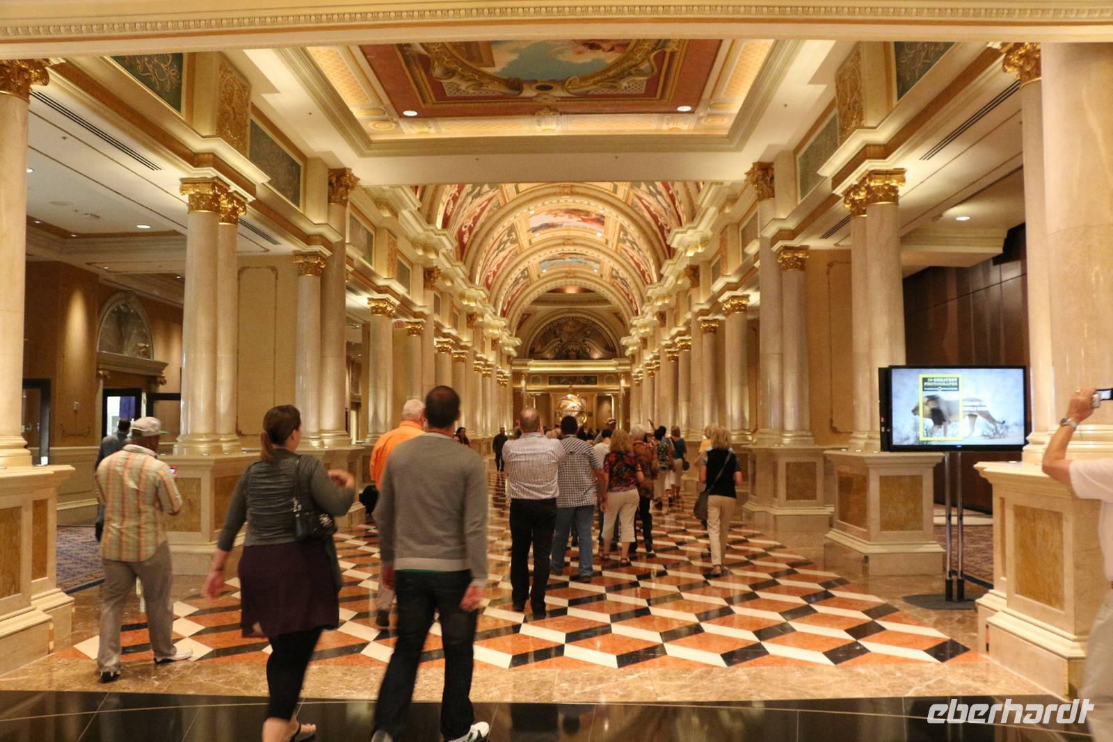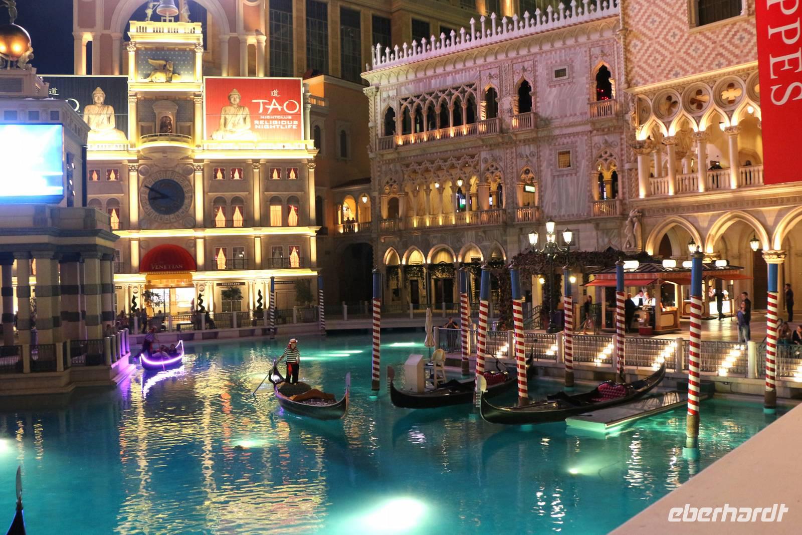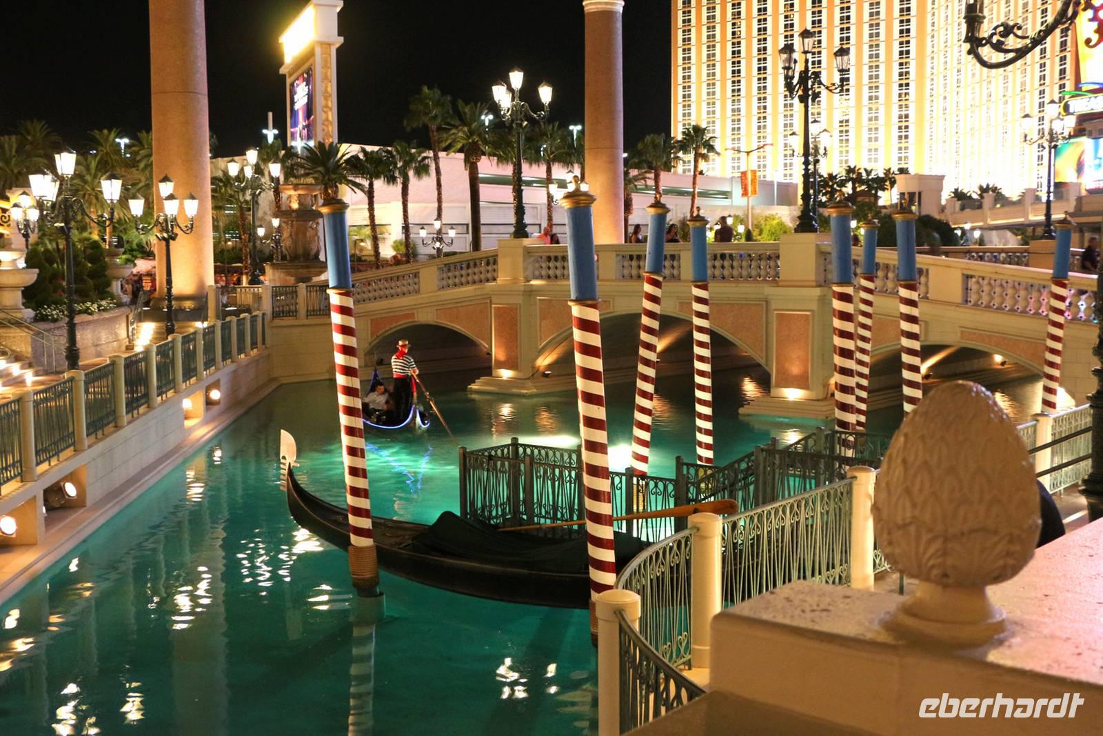 Nächster Halt ist die Hotelanlage des "Venetian". Zahlreiche italienische Wand- und Deckenmalereien schmücken das Innere des Hotels. Im Außenbereich ist die Kanalwelt von Venedig nachgebaut mit Rialtobrücke, Markusturm und Gondolieren, die Besucher durch die beleuchteten Kanäle schippern. Von hier beobachten wir auch den nachgestellten Vulkanausbruch vorm Hotel "Mirage". Wir fahren weiter durch das Hochzeitsviertel, in dem es die bekannten kleinen Hochzeitskapellen gibt.