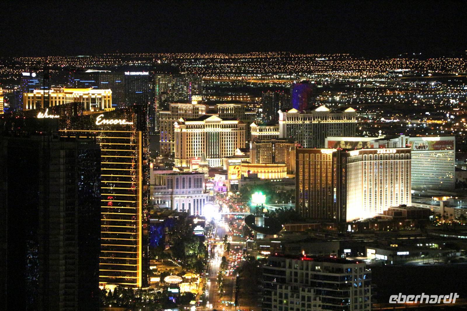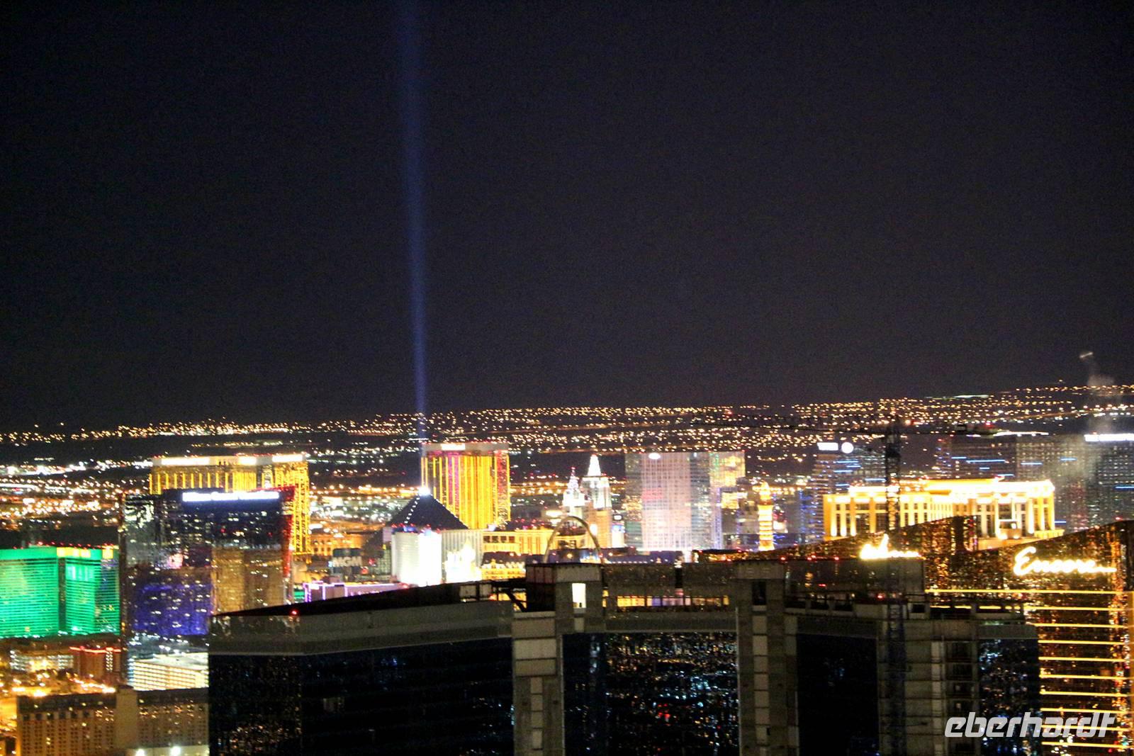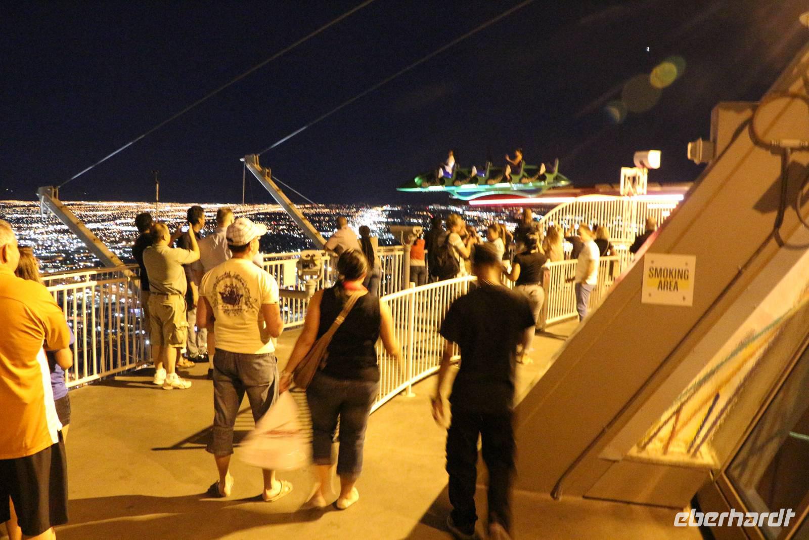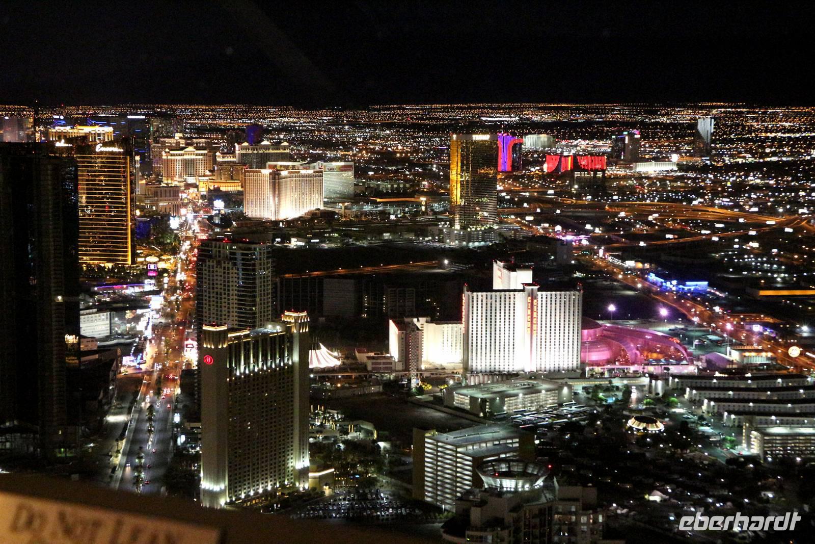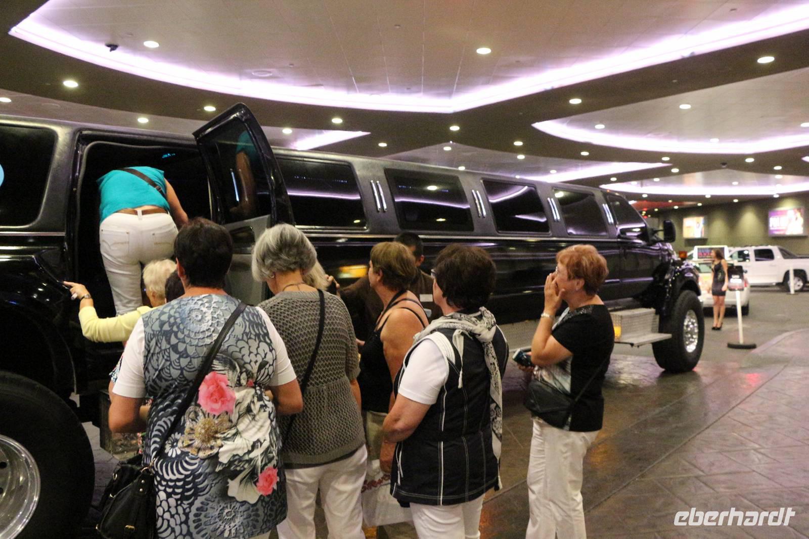 Danach kann man entweder mit dem Bus zurück zum Hotel fahren oder in meiner Begleitung fakultativ den Stratosphere Tower besuchen. Die Auffahrt auf den 350 Meter hohen Turm kostet 18 USD pro Person, wir bekommen als Gruppe aber einen großzügigen Rabatt. Von oben genießen wir einen tollen Ausblick auf das Lichtermeer von Las Vegas. Zurück zum Hotel geht es dann mit einem Taxi der Extraklasse - einer etwa 20 Meter langen Jeep-Limousine .