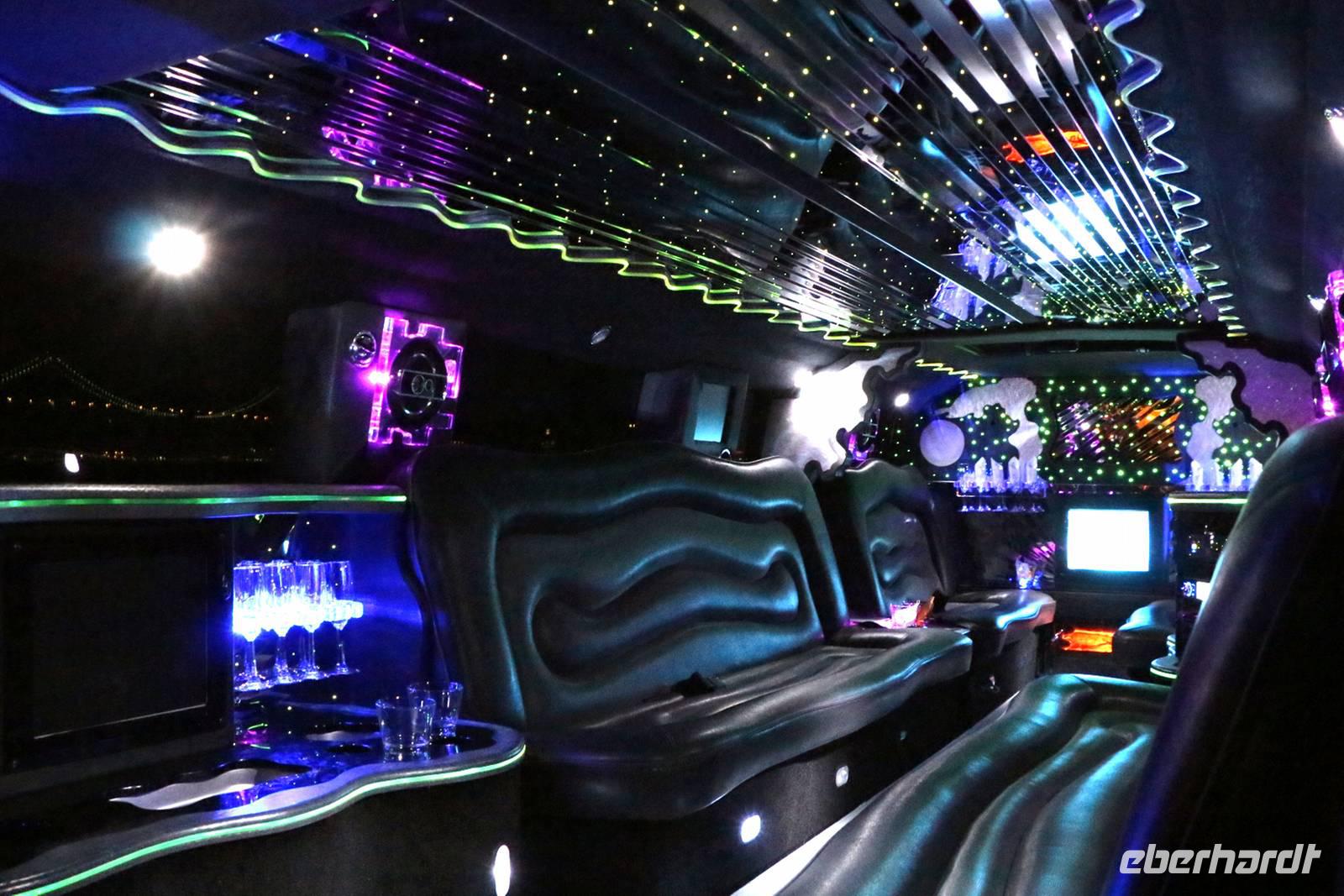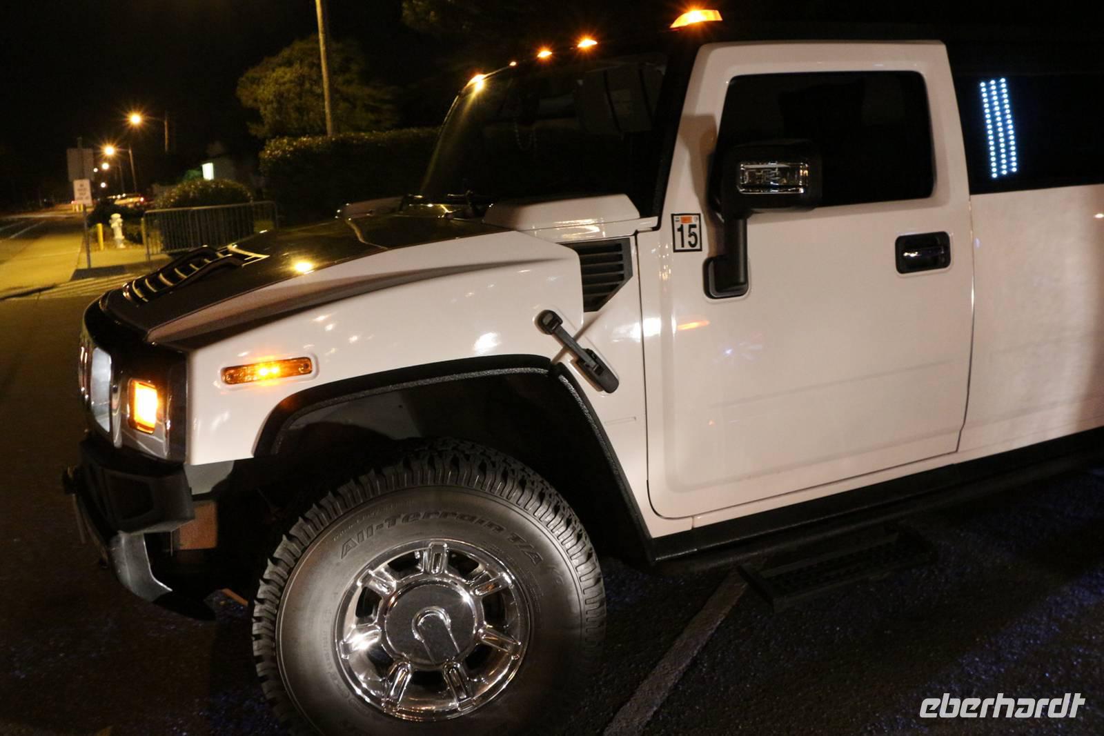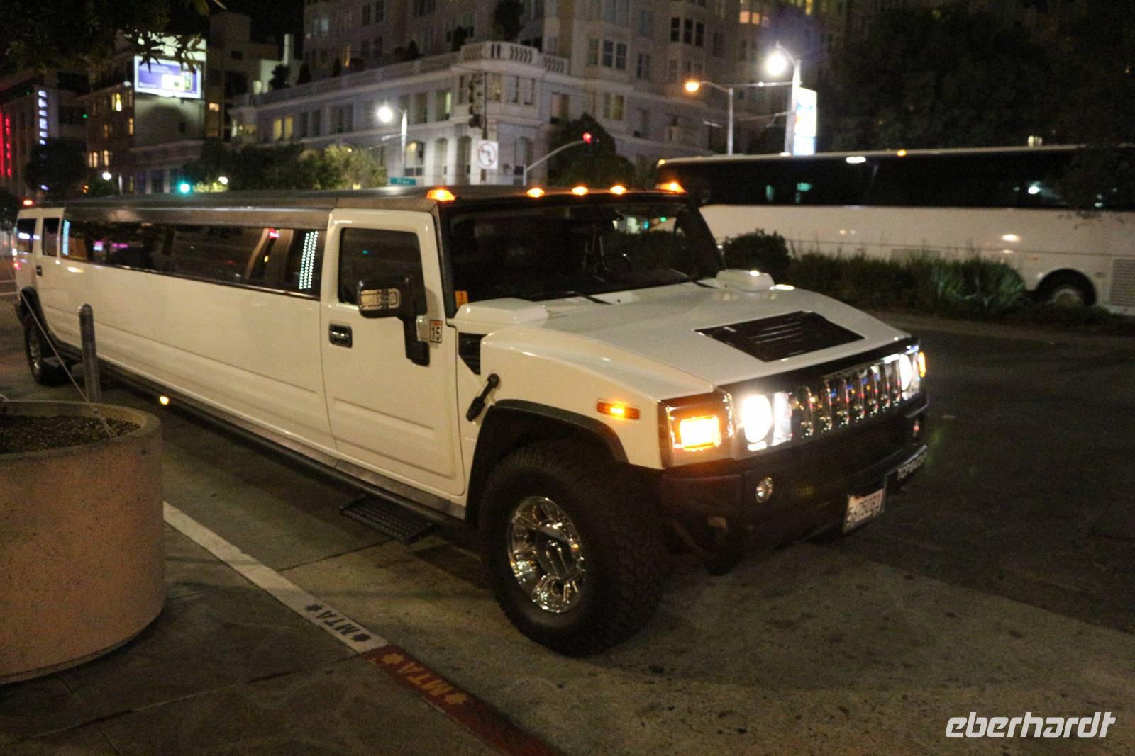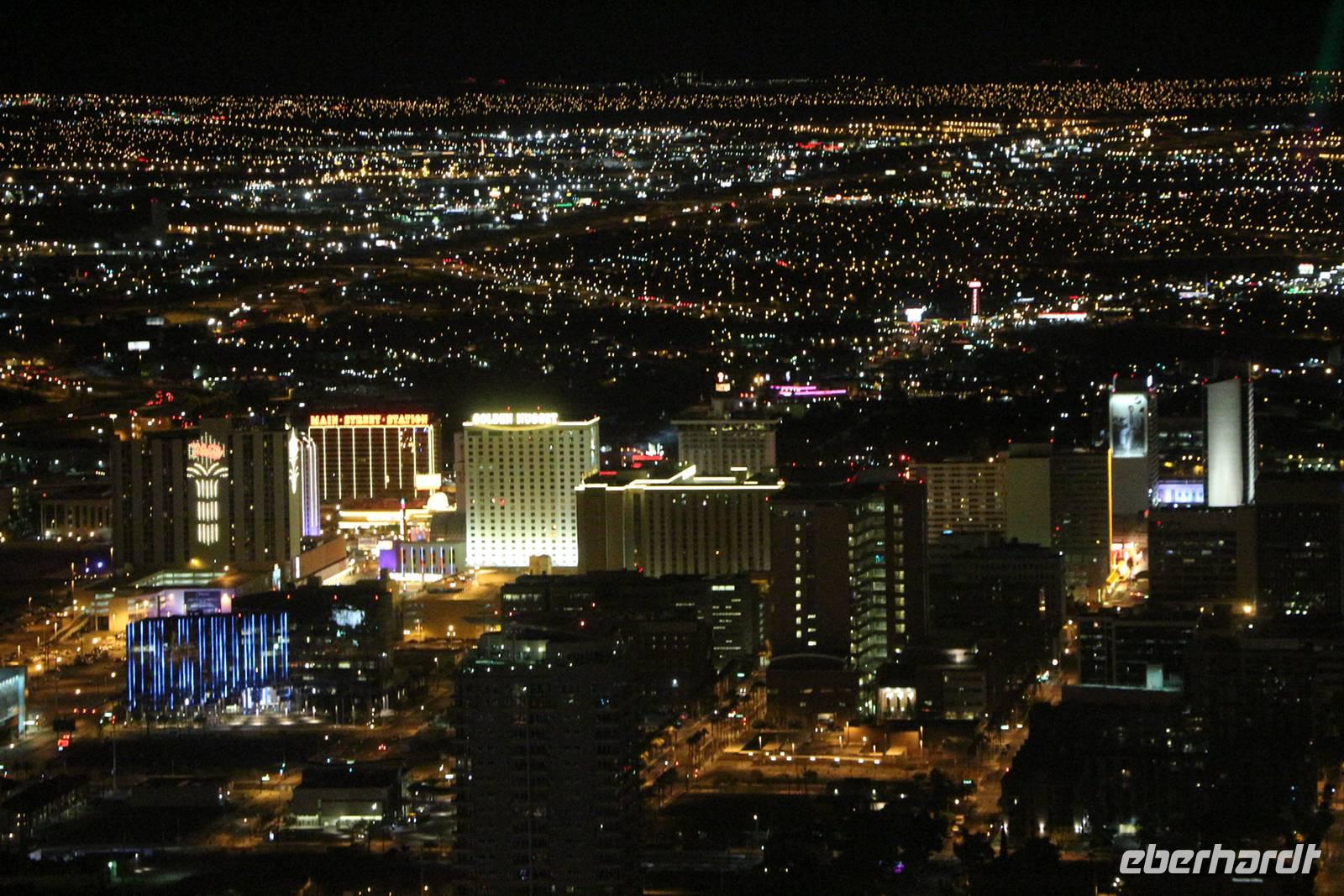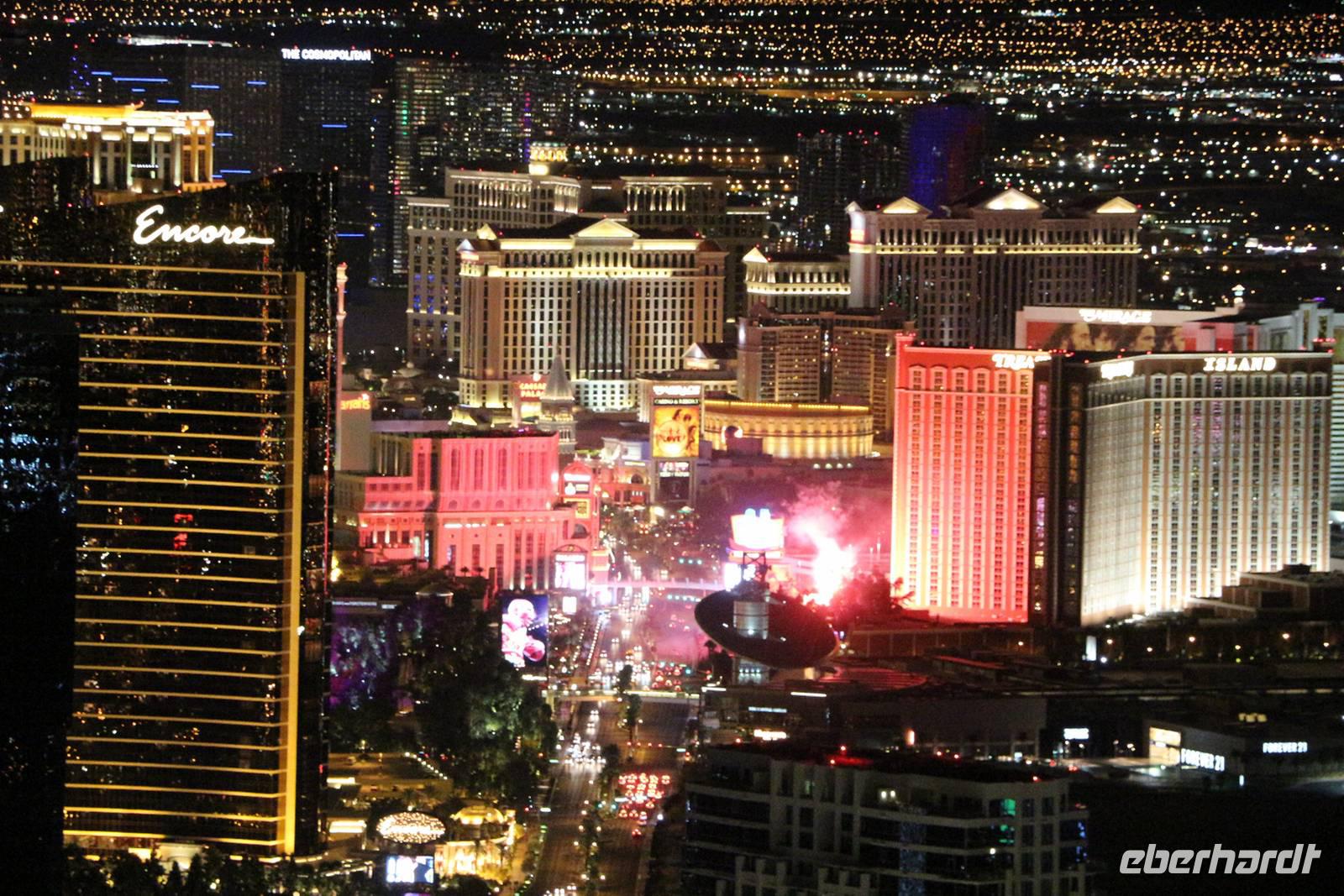 Danach kann man entweder mit dem Bus zurück zum Hotel fahren oder in meiner Begleitung fakultativ den Stratosphere Tower besuchen. Die Auffahrt auf den 350 Meter hohen Turm kostet 18 USD pro Person, wir bekommen als Gruppe aber einen großzügigen Rabatt. Von oben genießen wir einen tollen Ausblick auf das Lichtermeer von Las Vegas. Zurück zum Hotel geht es dann mit einem Taxi der Extraklasse - einer etwa 20 Meter langen Jeep-Limousine .
