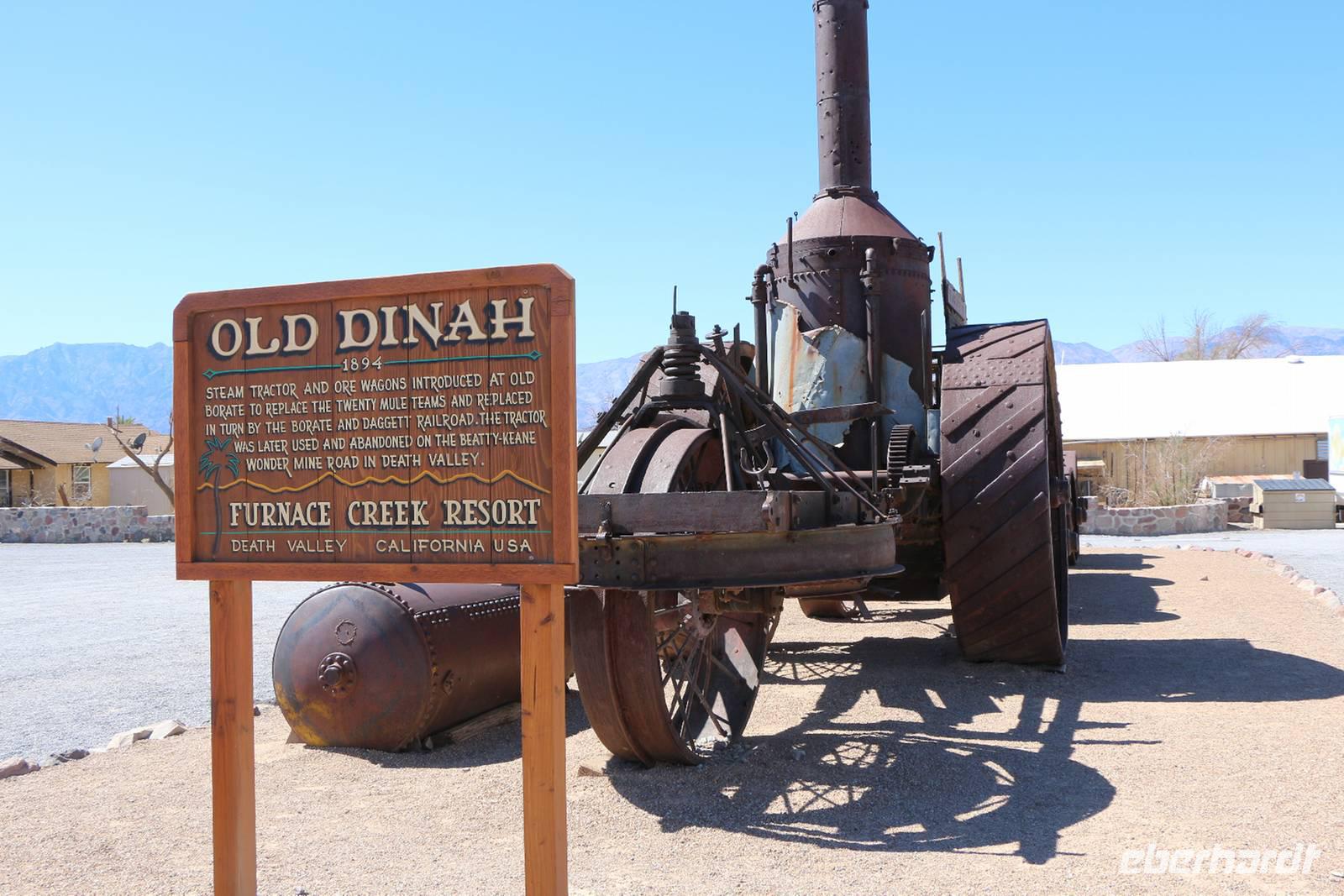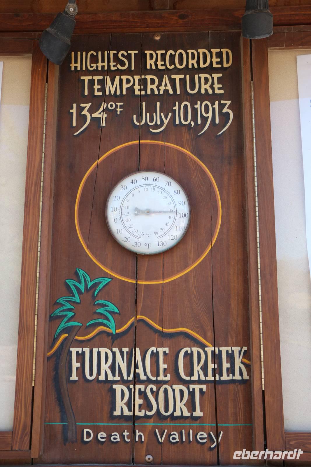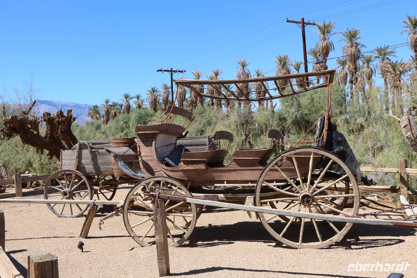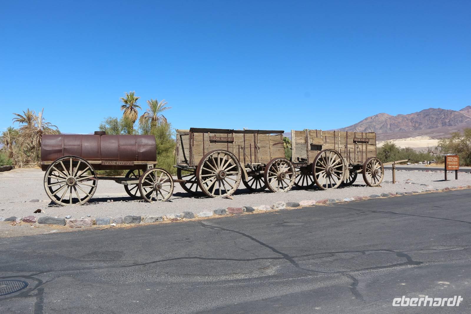 Es wird noch heißer! Wir verlassen Las Vegas in Richtung Nordwesten, noch einmal durchqueren wir die Mojave-Wüste, um wieder nach Kalifornien zu gelangen. Dabei lernen wir das Tal des Todes, den Death Valley Nationalpark, kennen. Er ist der trockenste Nationalpark in den USA und einer der heißesten Punkte der Erde. Bei uns herrschen hier etwa 40 °C, was im Death Valley nicht sonderlich heiß ist. Die Temperaturen können bis weit über 50 °C steigen. Wir legen einen Fotostopp am Zabriskie Point ein, der nach dem Geschäftsführer der Pacific Coast Borax Company benannt ist und hier einst Borax abbaute. Vom Aussichtspunkt sehen wir die vielfarbige Erosionslandschaft, die vor Jahrmillionen nach Austrocknung des Furnace Creek Lake entstand. Weiter geht es zum Badwater Basin, dem tiefsten Punkt der USA, der 85,95 Meter unter dem Meeresspiegel liegt. Hier kann man auf dem ausgetrockneten Salzsee spazieren gehen und sich von dem skurrilen Ort verzaubern lassen. Unsere Mittagspause verbringen wir auf der Furnace Creek Ranch im Death Valley. Am 10. Juli 1913 wurde hier auf der Ranch eine Temperatur von 56,7 °C gemessen, woran ein Schild vorm Souvenirshop erinnert. Die Ranch ist wie ein kleines Freilichtmuseum, in dem man Relikte des Borax-Abbaus und des Lebens hier im Tal bestaunen kann: Wagen des 20-Muli-Teams, alte Dampfmaschinen, Pferdewagen usw.