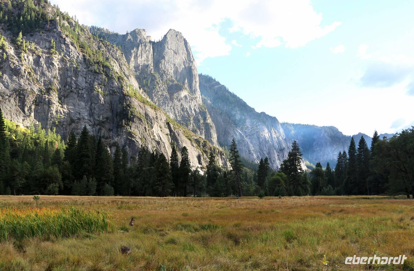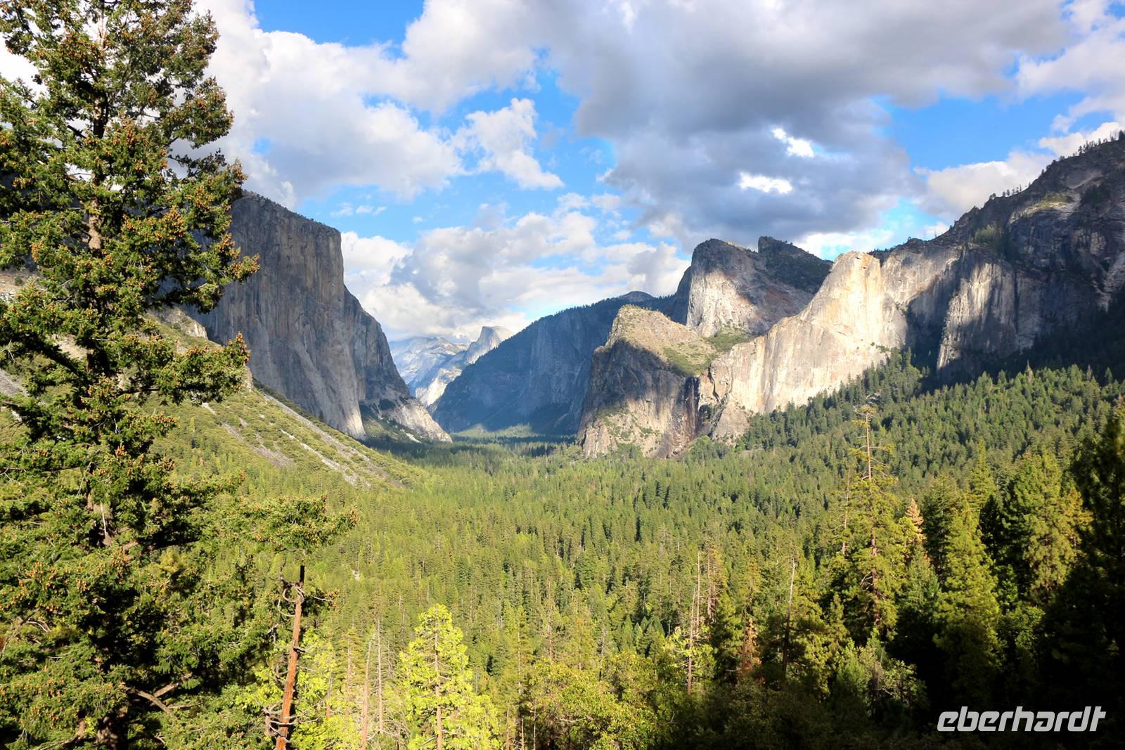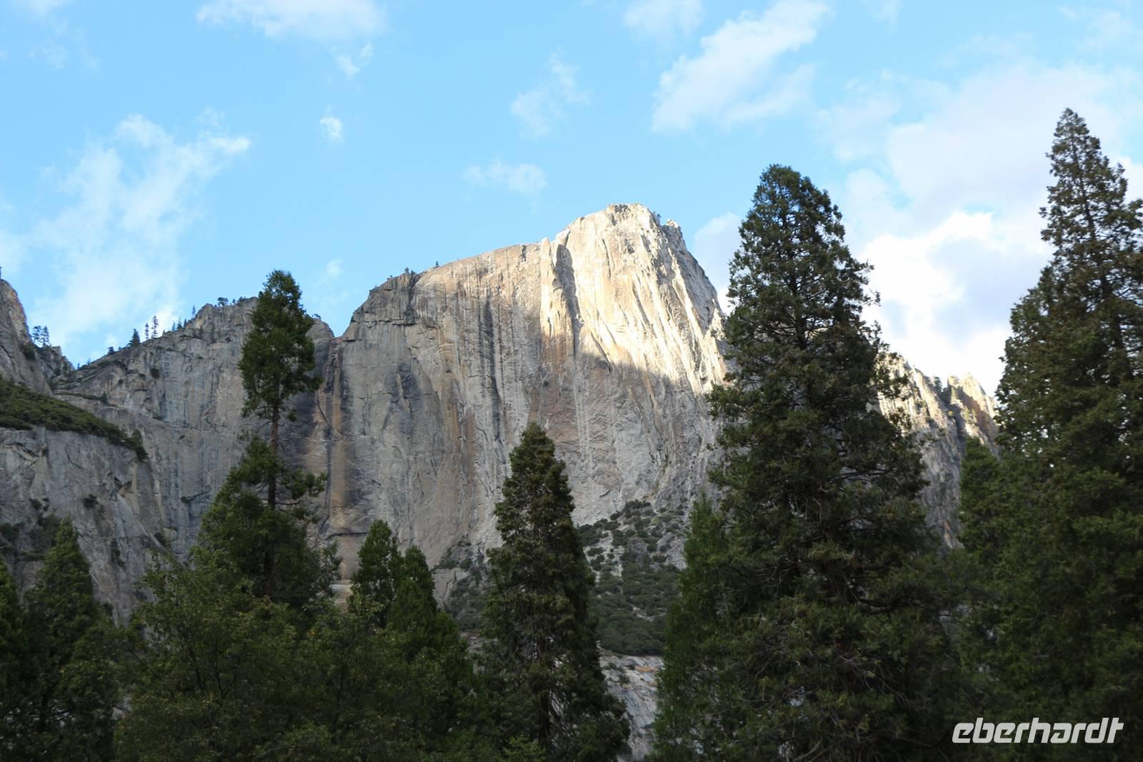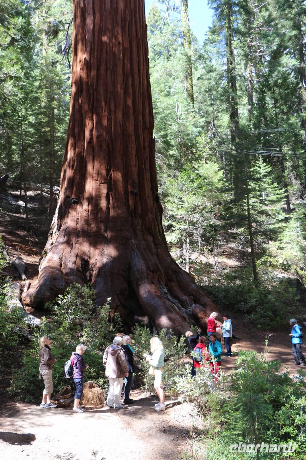 Ein ganz anderer Nationalpark steht heute auf dem Programm. Der Yosemite liegt an den westlichen Hängen der Sierra Nevada auf 600 bis 4000 Metern über dem Meeresspiegel. Grüne Wälder, graue Felsen, Flüsse und Wasserfälle unterscheiden ihn von den bisher gesehenen Parks. Die Landschaft ähnelt eher der in West-Kanada. Durch die Höhe und das eigene Klima liegen die Temperaturen bei maximal 15 bis 20 °C, eine Jacke ist empfehlenswert. Höhepunkt des Yosemite-Nationalparks sind die riesigen Mammutbäume, von denen es drei größere Haine im ganzen Park gibt. Wir besuchen den Mariposa Grove, den mit etwa 200 Bäumen größten Hain der Giganten. Bei einer etwa 1,5-stündigen Wanderung erkunden wir die Welt der Riesenmammutbäume (Sequoiadendron giganteum).