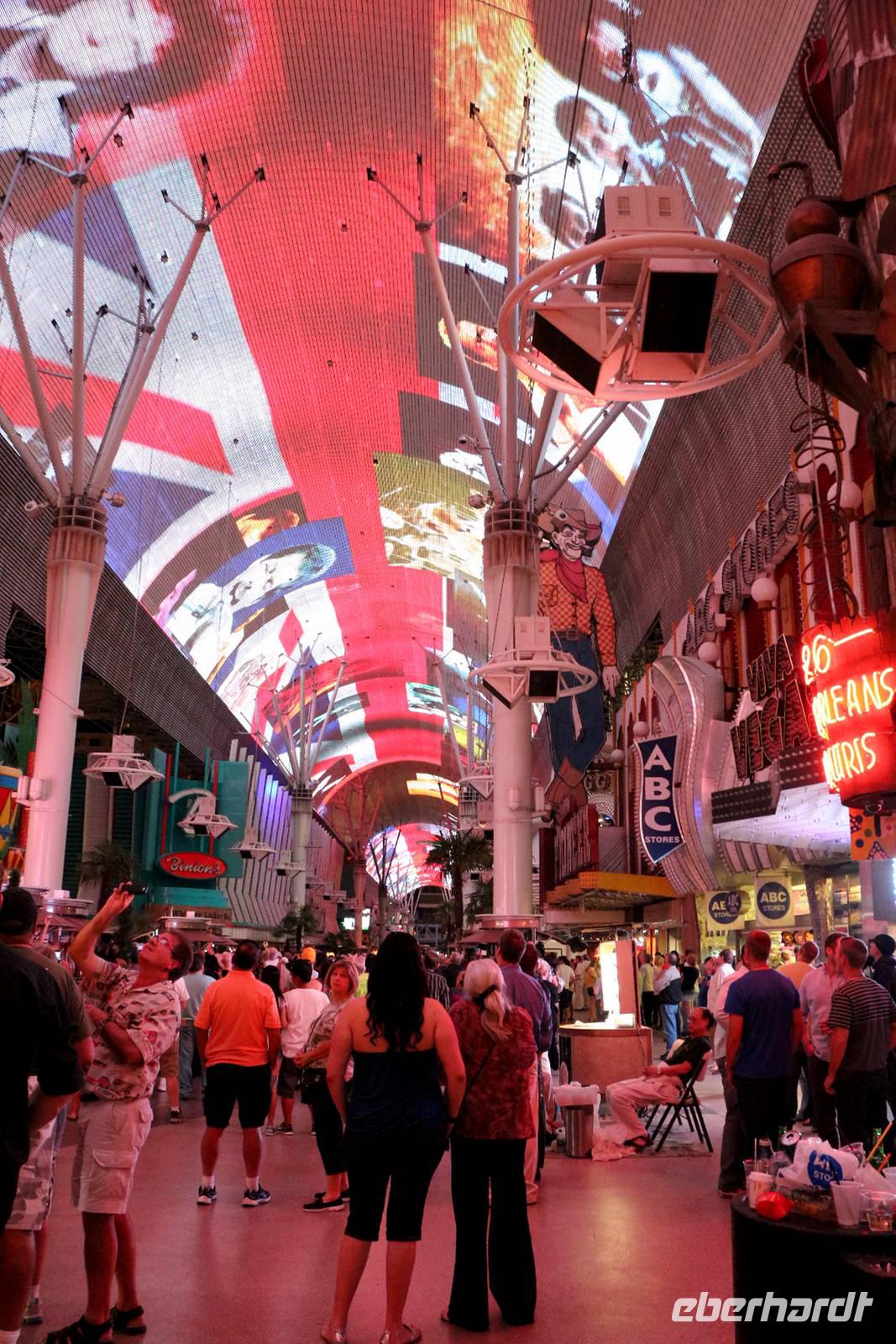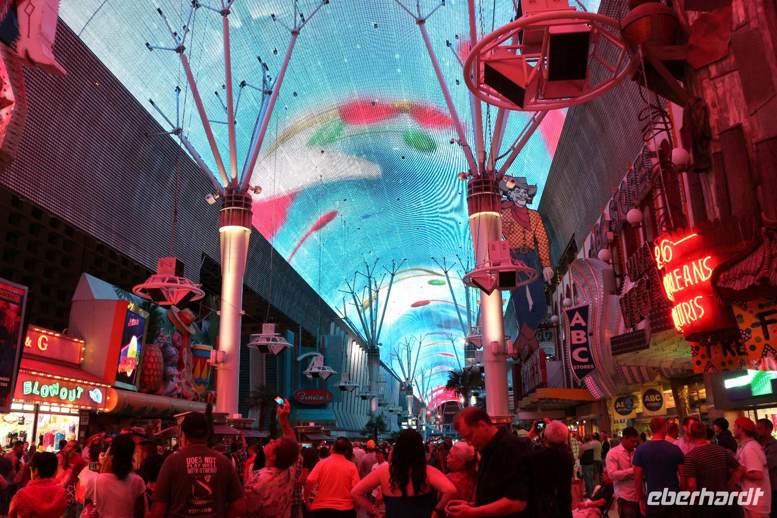 Man soll es nicht glauben, aber Las Vegas besitzt auch eine Altstadt, in der einst alles begann. Wir besuchen die Fremont Street, die erste Casino-Straße von Las Vegas, die es schon seit 1905 gibt - dem selben Jahr, in dem die Stadt gegründet wurde. Bis zum Bau der Megahotels am Strip war hier das Zentrum der Vergnügungsindustrie von Las Vegas. Damit auch heute noch Besucher angezogen werden, wurde 1995 eine neue Attraktion eröffnet - die Fremont Street Experience Show. Ein etwa 450 Meter langer Teil der Fremont Street ist überdacht mit einer Kuppel aus 12,5 Millionen LED-Lampen und 220 Lautsprechern. Jeden Abend findet darauf eine Multimedia-Show mit Video, Musik und Lichteffekten statt, die wir uns natürlich auch ansehen.