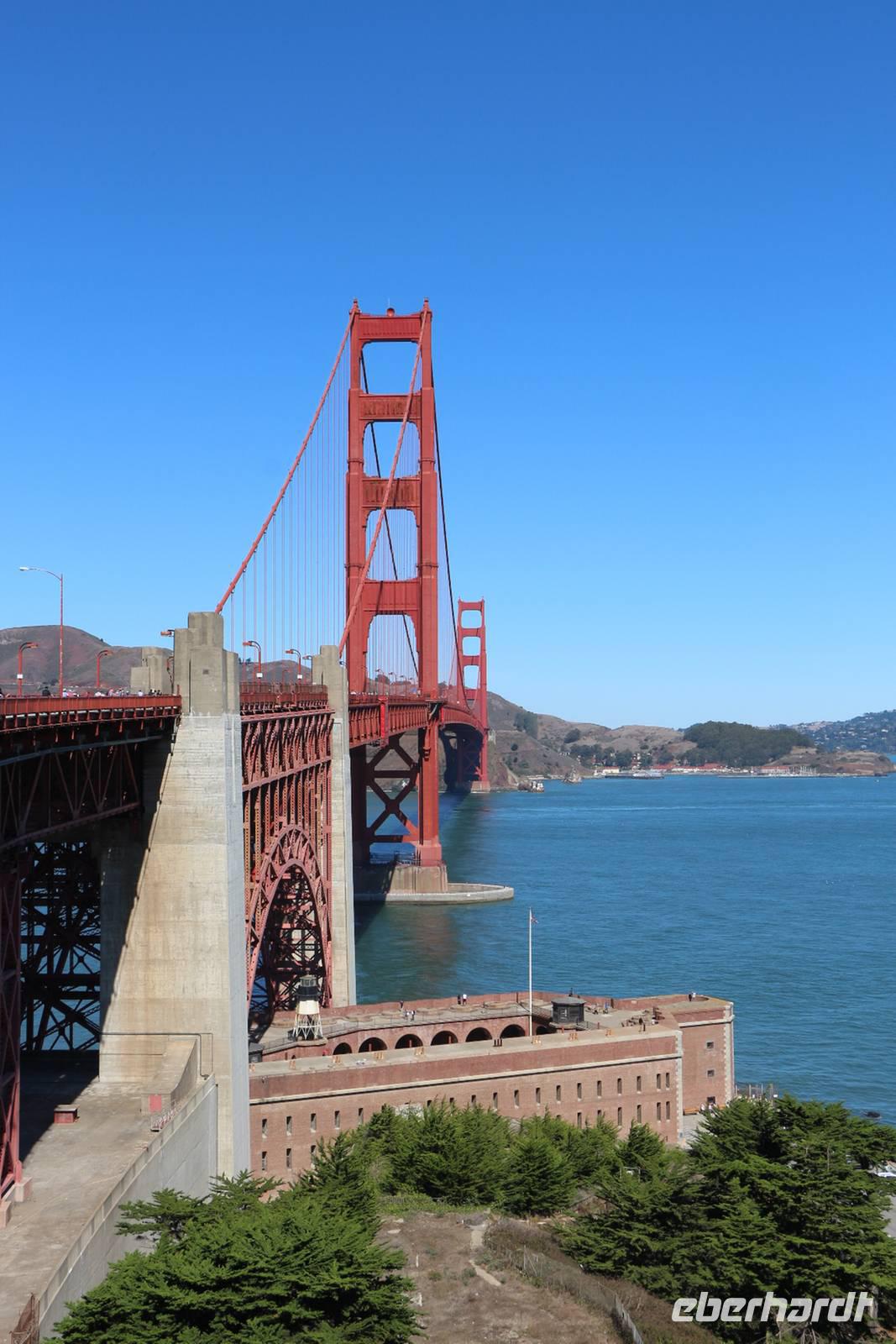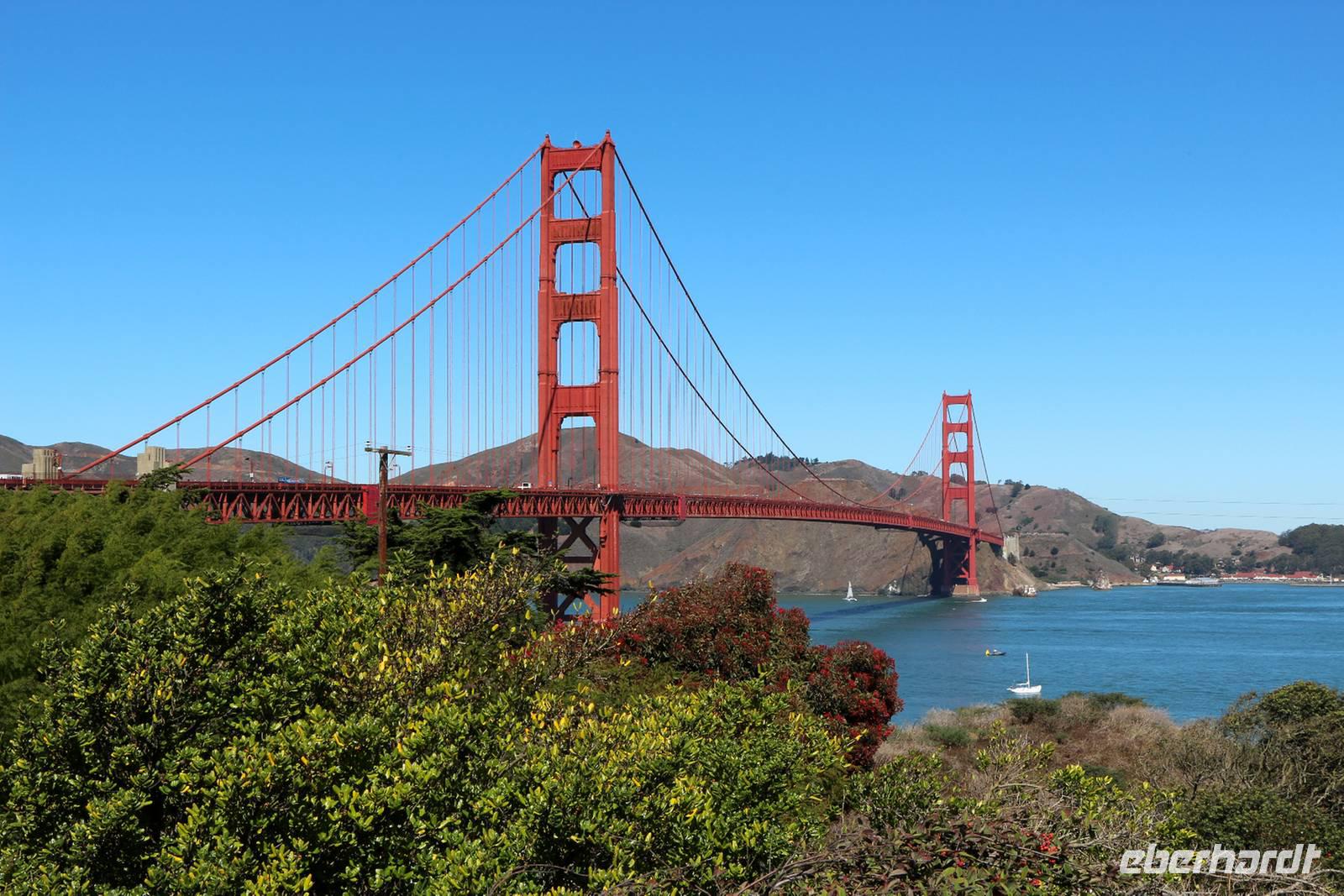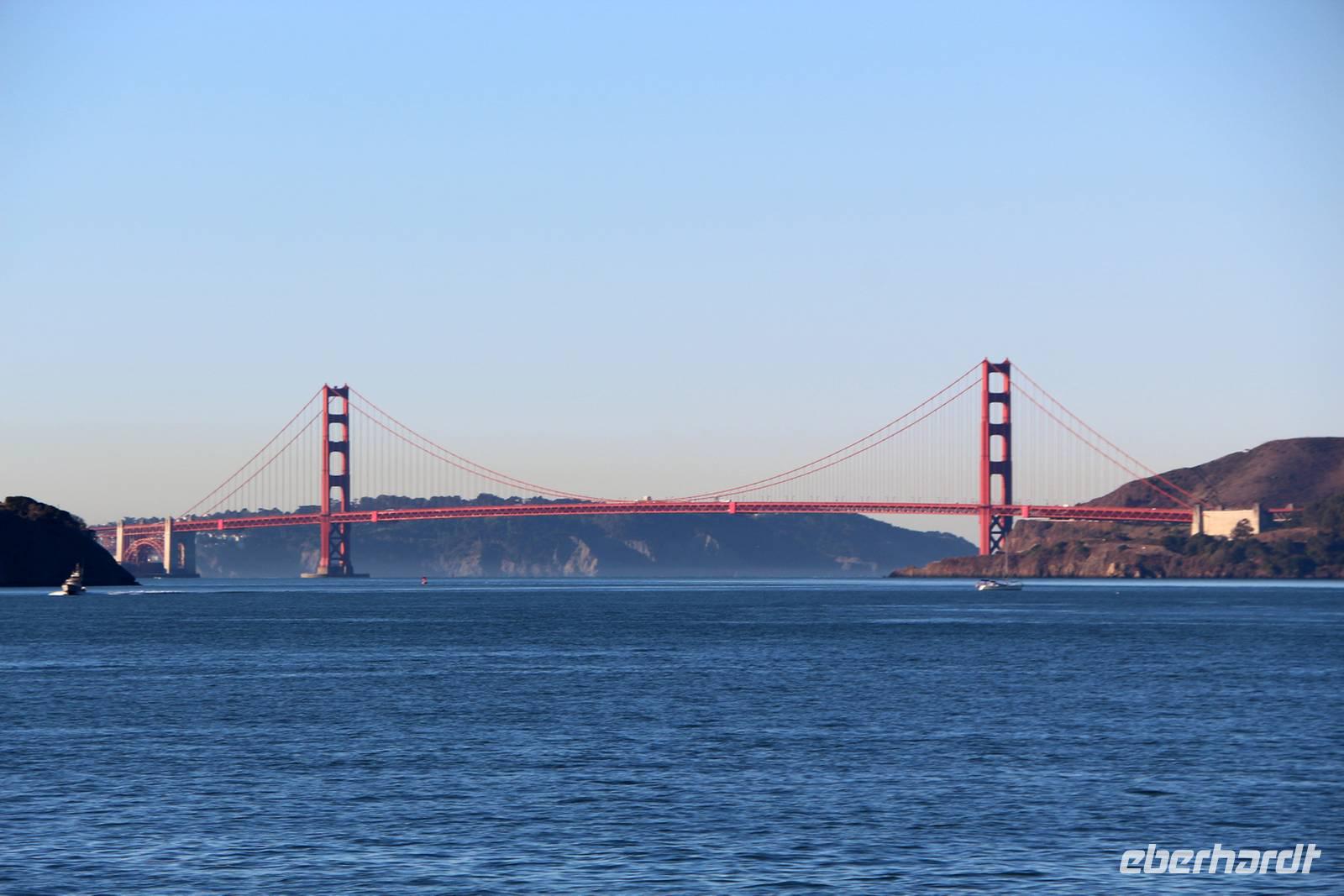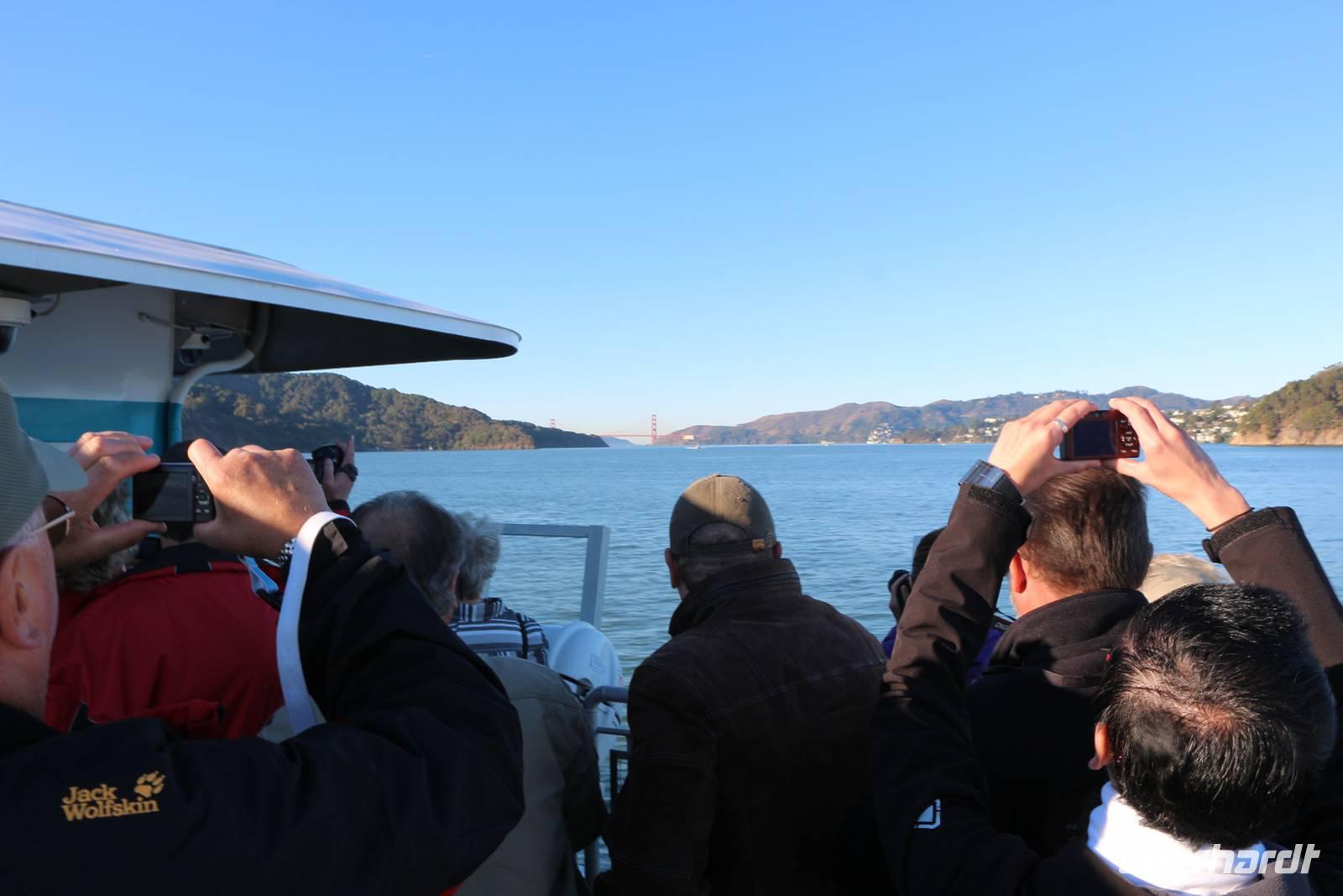 Von den Hügeln der Twin Peaks fahren wir dann hinunter zum Wahrzeichen San Franciscos - zur Golden Gate Bridge. Wir haben großes Glück, die Brücke so schön mit blauem Himmel und klarer Sicht zu sehen . Die Möglichkeit, einmal zu Fuß über die Golden Gate Bridge zu gehen, lassen wir uns nicht entgehen. Die 2,7 Kilometer überquert man in etwa einer Stunde. Es gibt einen Fuß- und Radweg sowie vier Fahrspuren für Autos - der Spaziergang ist daher natürlich von entsprechender Geräuschkulisse begleitet. Das tut dem Erlebnis Golden Gate aber keinen Abbruch! Von oben hat man tolle Blicke auf die Bucht, die umliegenden Inseln einschließlich Alcatraz und die Stadtsilhouette. Am anderen Ende angekommen sind alle überwältigt von der Kulisse und es geht weiter mit dem Bus zum kleinen Städtchen Sausalito, wo Zeit für einen kleinen Bummel ist. Nach dem Mittag kehren wir zurück in die Innenstadt von San Francisco. Wer will, kann mit mir eine Fahrt in einem der beliebten Cable Cars unternehmen. Wir nehmen die weniger von Touristen frequentierte California-Street-Linie von der Market Street im Finanzviertel bis zur Van Ness Avenue, wo direkt unser Hotel liegt. Die Fahrt kostet 6 USD pro Person und dauert je nach Anzahl der Stopps etwa 20 Minuten bergauf und bergab entlang der California Street. Nach dem Einchecken im Holiday Inn Hotel hat jeder Zeit für eigene Erkundungen. Den Union Square mit seinen umliegenden Einkaufsstraßen erreicht man in etwa 25 Minuten zu Fuß.