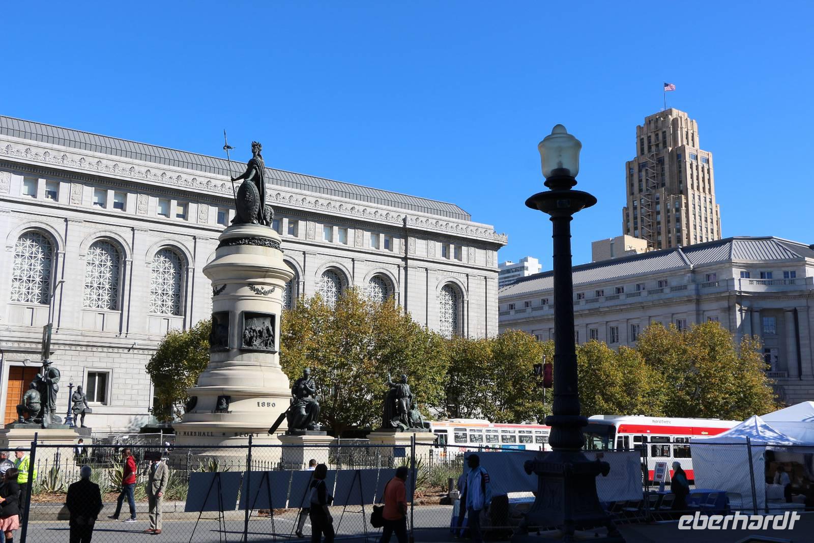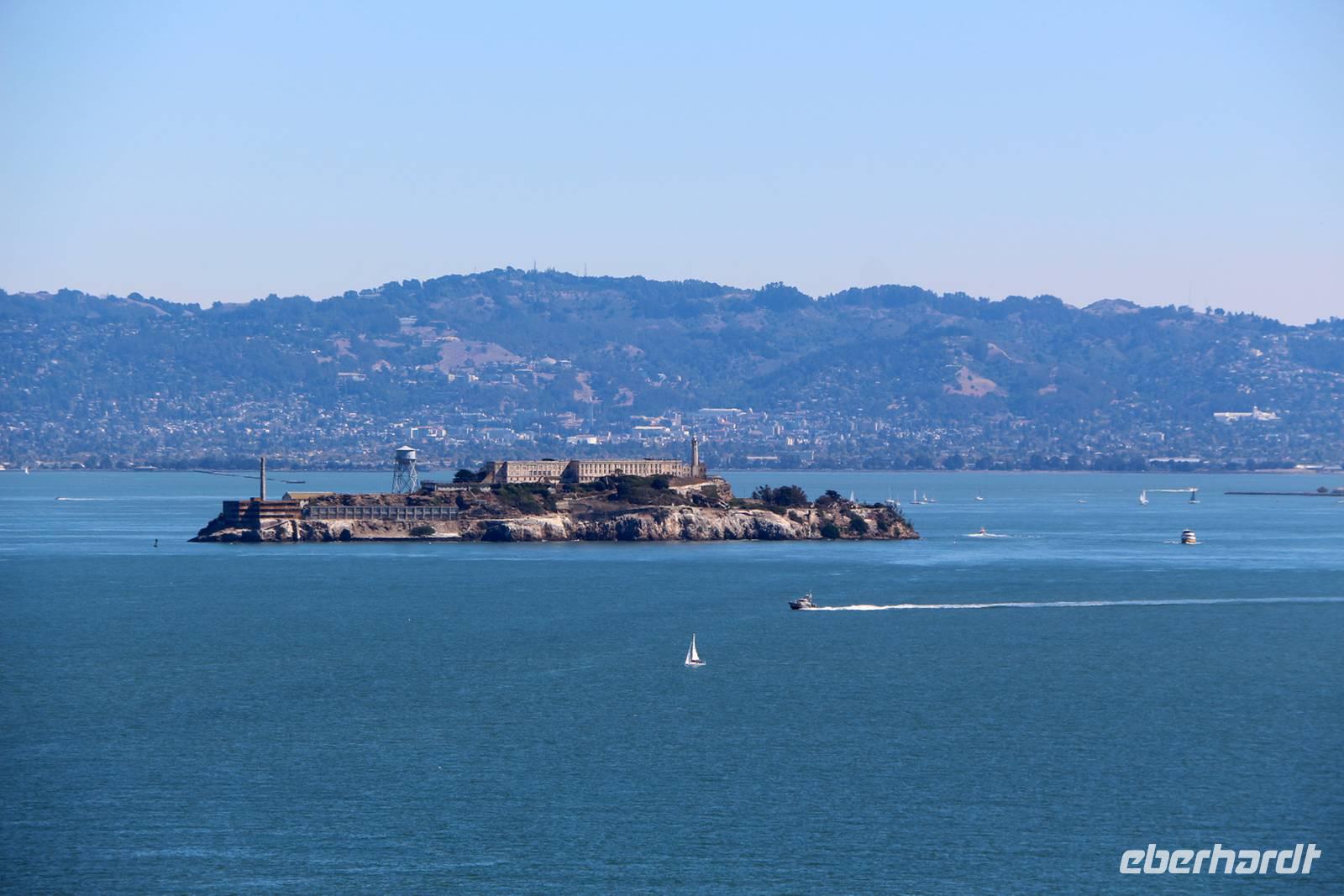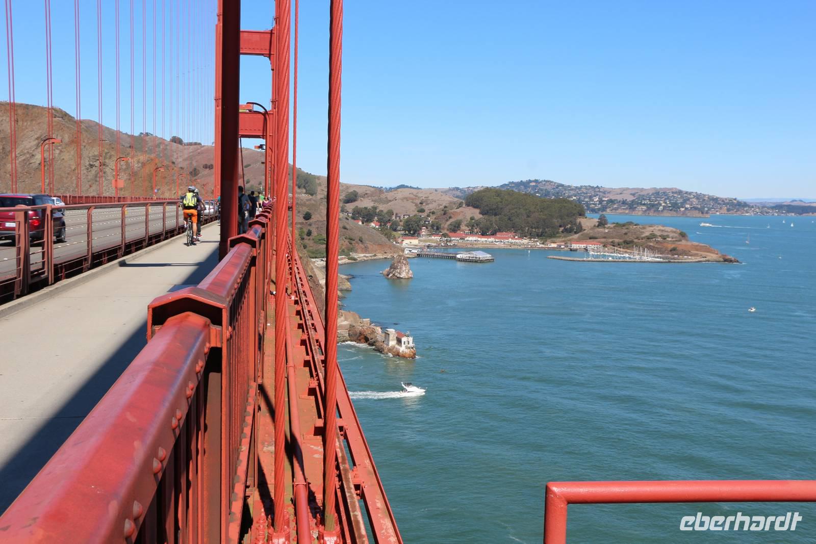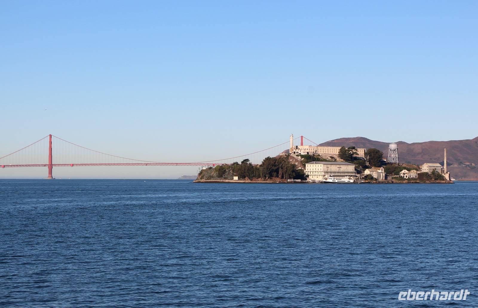 Von den Hügeln der Twin Peaks fahren wir dann hinunter zum Wahrzeichen San Franciscos - zur Golden Gate Bridge. Wir haben großes Glück, die Brücke so schön mit blauem Himmel und klarer Sicht zu sehen . Die Möglichkeit, einmal zu Fuß über die Golden Gate Bridge zu gehen, lassen wir uns nicht entgehen. Die 2,7 Kilometer überquert man in etwa einer Stunde. Es gibt einen Fuß- und Radweg sowie vier Fahrspuren für Autos - der Spaziergang ist daher natürlich von entsprechender Geräuschkulisse begleitet. Das tut dem Erlebnis Golden Gate aber keinen Abbruch! Von oben hat man tolle Blicke auf die Bucht, die umliegenden Inseln einschließlich Alcatraz und die Stadtsilhouette. Am anderen Ende angekommen sind alle überwältigt von der Kulisse und es geht weiter mit dem Bus zum kleinen Städtchen Sausalito, wo Zeit für einen kleinen Bummel ist. Nach dem Mittag kehren wir zurück in die Innenstadt von San Francisco. Wer will, kann mit mir eine Fahrt in einem der beliebten Cable Cars unternehmen. Wir nehmen die weniger von Touristen frequentierte California-Street-Linie von der Market Street im Finanzviertel bis zur Van Ness Avenue, wo direkt unser Hotel liegt. Die Fahrt kostet 6 USD pro Person und dauert je nach Anzahl der Stopps etwa 20 Minuten bergauf und bergab entlang der California Street. Nach dem Einchecken im Holiday Inn Hotel hat jeder Zeit für eigene Erkundungen. Den Union Square mit seinen umliegenden Einkaufsstraßen erreicht man in etwa 25 Minuten zu Fuß.