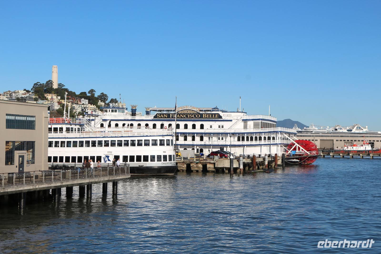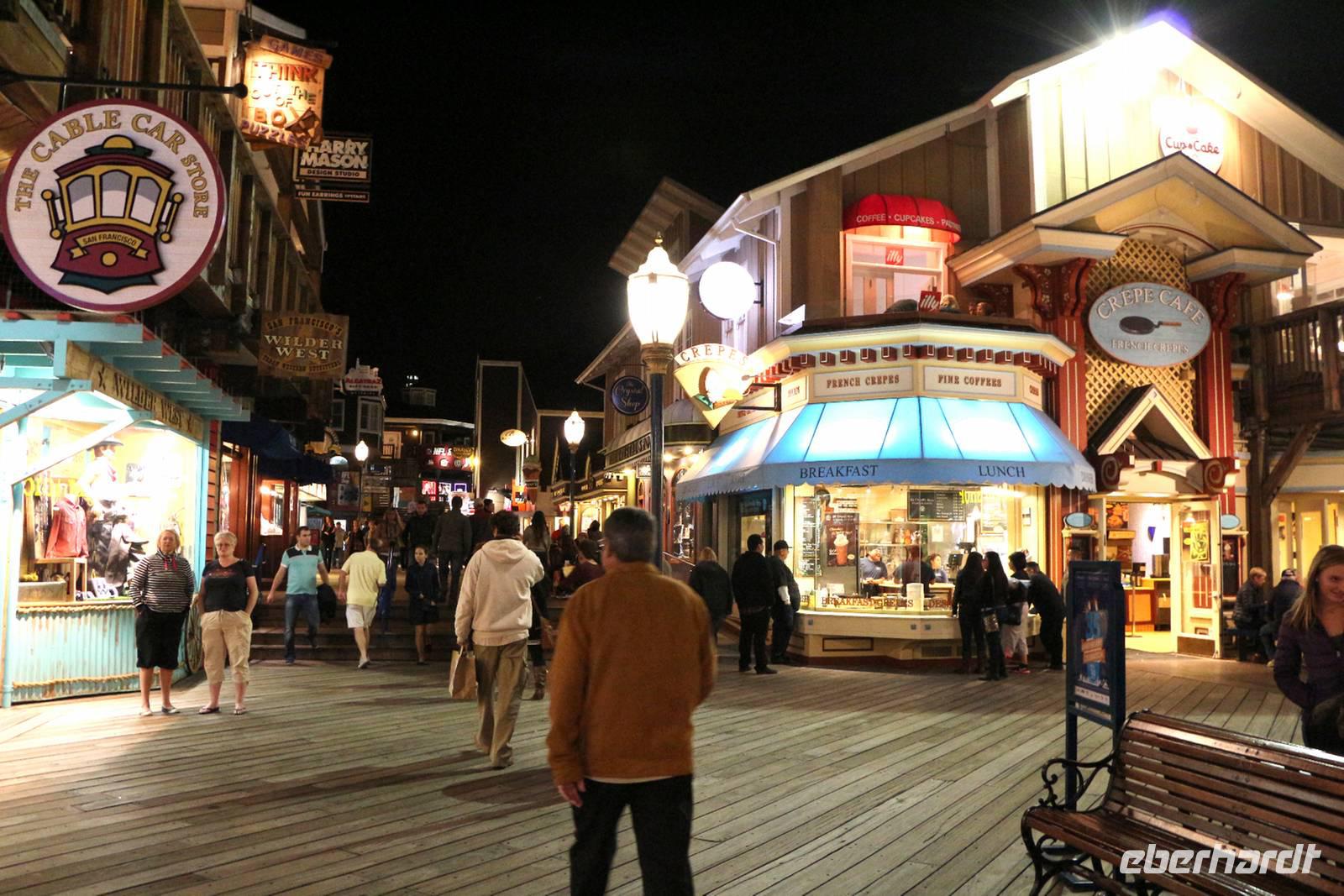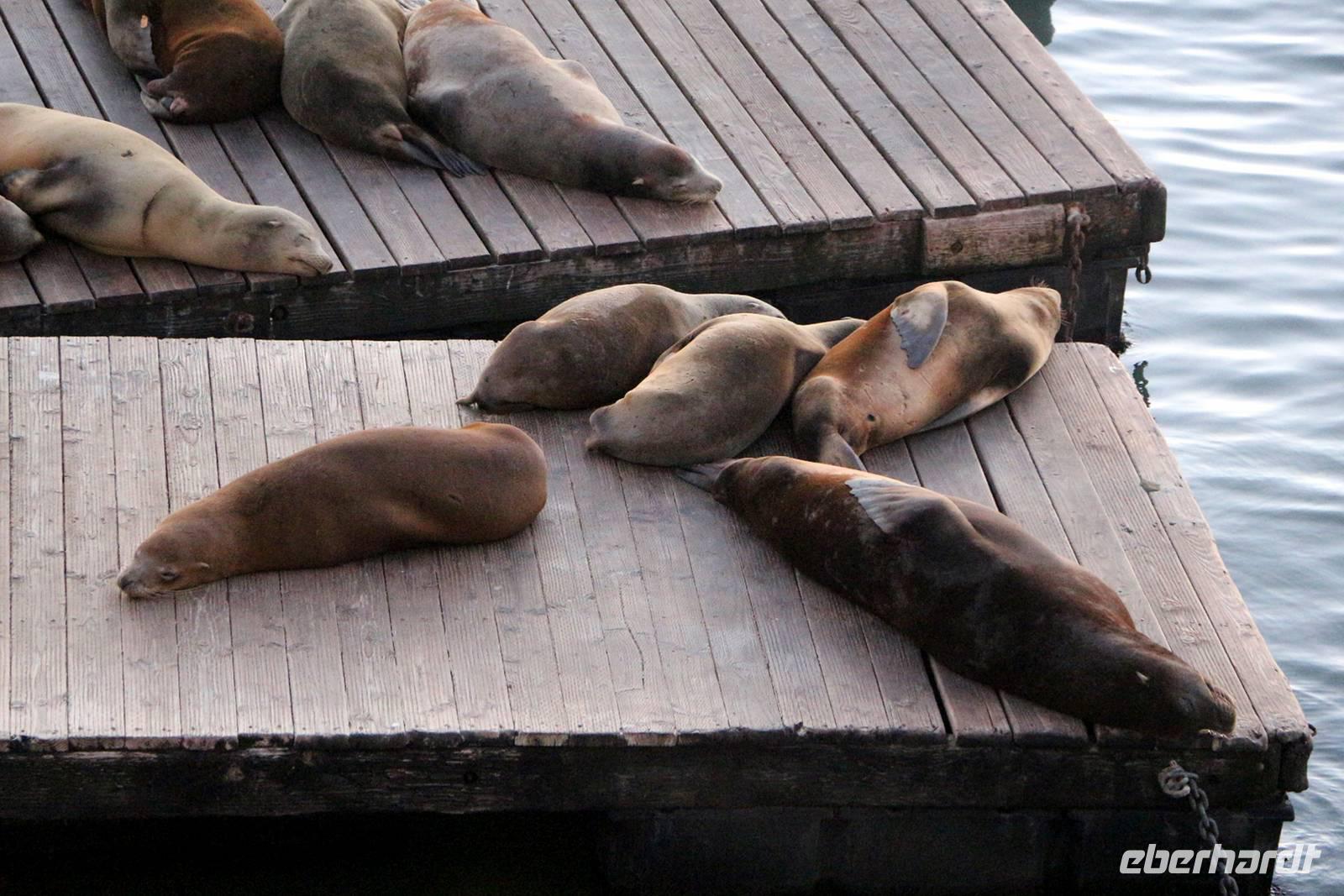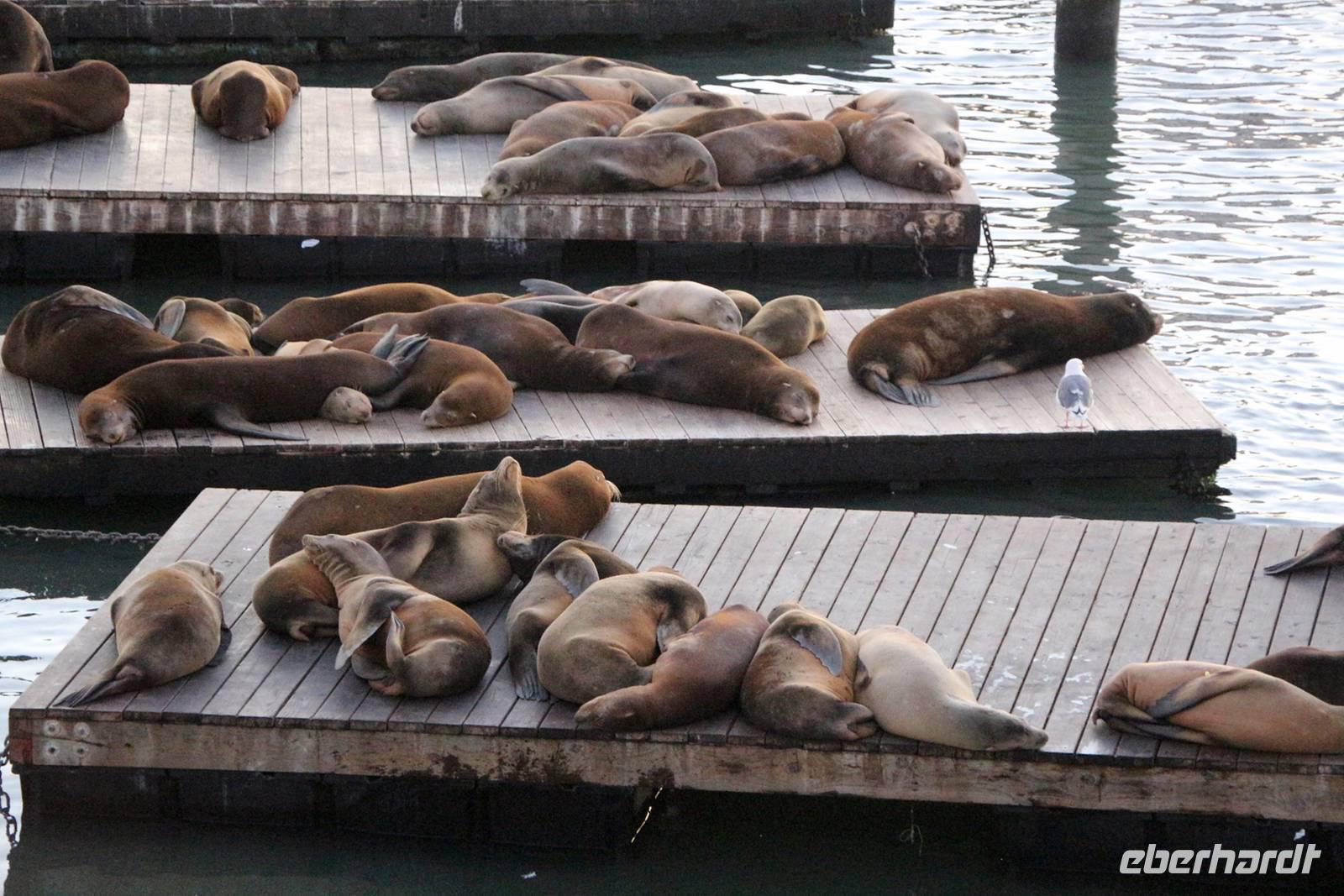 Am Abend fahren wir mit unserem Bus noch einmal an die Hafenlinie mit den alten Piers, die heute lebendige Einkaufs- und Vergnügungsmeilen sind. Im Restaurant "Neptune's Palace" sind wir zum Abschluss-Abendessen mit Blick auf den Sonnenuntergang über der Bucht von San Francisco eingeladen. Direkt neben dem Restaurant befinden sich die hölzernen Bootsstege, die von Dutzenden Seelöwen bevölkert sind - unbedingt anschauen!