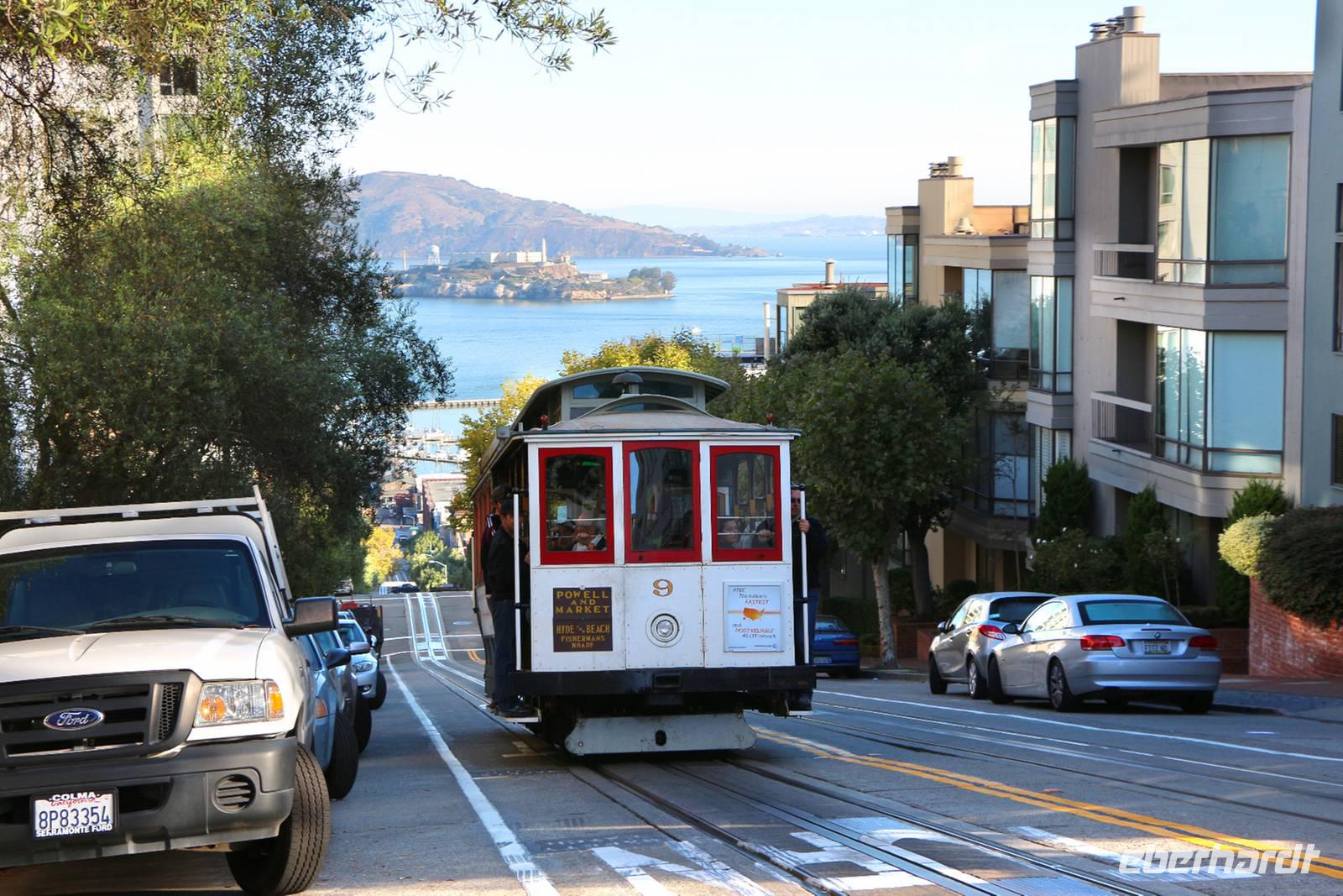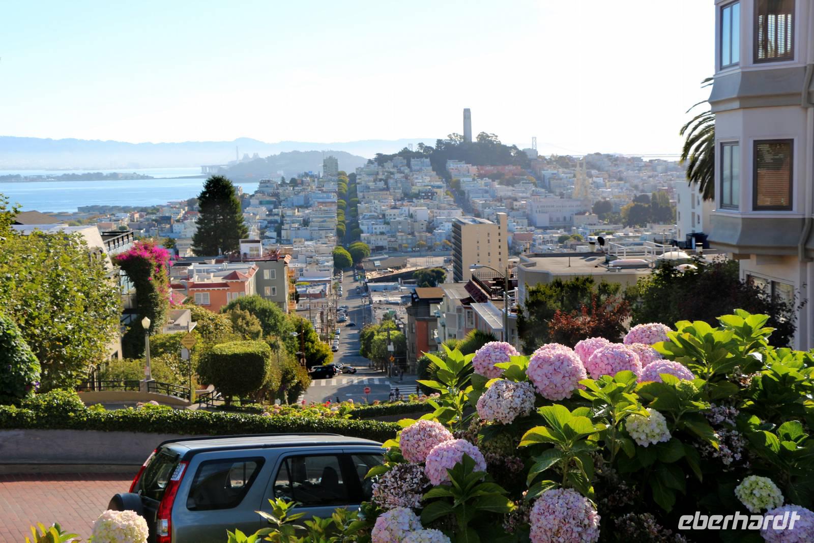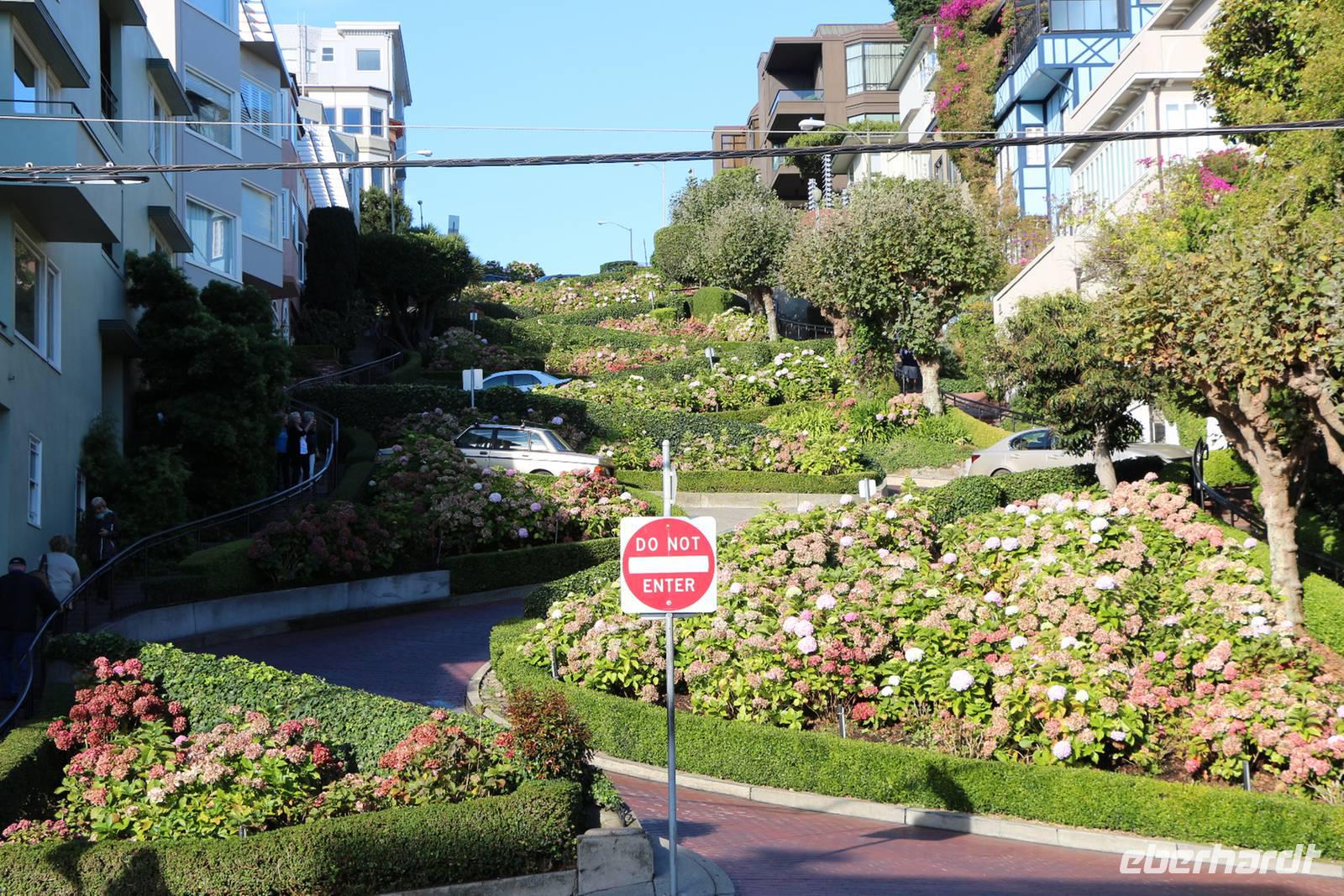 Am Vormittag vor unserem Heimflug bleibt noch etwas Zeit für eigene Unternehmungen in San Francisco. Einige entscheiden sich für den Besuch der kurvenreichsten Straße der Welt - der Lombard Street. Zu Fuß gelangen wir von unserem Hotel in etwa 30 Minuten zum oberen Ende an der Hyde Street und lernen die hügelige Straßenführung kennen. Hier ist auch das beliebte Postkartenmotiv mit dem Cable Car, der Bucht und der Gefängnisinsel Alcatraz im Hintergrund. Wir laufen den berühmten kurvigen Teil der Lombard Street hinunter und fotografieren die Autos, die zwischen den blumig-grünen Hecken die engen Kurven nehmen.