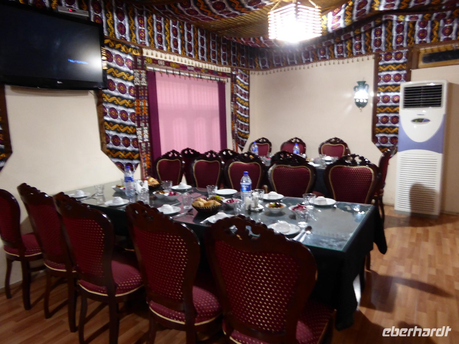 Ein ereignisreicher und auch anstrengender Tag geht zu Ende. Ich bin satt vom guten und vielen Essen und müde, aber ein Rückblick auf den Tag muss noch sein. Am Vormittag besuchen wir den Nakschbandi-Komplex. Das Mausoleum für Nakschband wurde in den 90er Jahren zu seinem 675. Geburtstag mit der Unterstützung türkischer Sufis restauriert. Vom Haupteingang kommen wir inn einen großen Innenhof. Hier befindet sich ein Wasserbecken und ringsherum Kolonaden. Auf einem Marmorpodest steht ein Fahnenmast mit einem stilisierten Granatapfel und einem Rosshaarwimpel. Im nächsten Hof liegt ein alter Maulbeerbaumstamm, der demjenigen Glück bringt, der es schafft, sich ein Stückchen von ihm mitzunehmen. Der Stamm ist glatt und hart wie Stahl, niemand kann hier mehr ein Stückchen abbrechen. Dafür dient der Stamm als beliebtes Fotoobjekt sowohl für Einheimische als auch für Touris. In der Anlage sind viele fleißige Hände unterwegs, die dafür sorgen, dass alles schön sauber bleibt. Wir kommen zu einer Küche, in der heute Essen für Bedürftige zubereitet wird. Die Frauen, die damit beschäftigt sind, lassen sich von uns nicht stören und auch gern fotografieren. Wir fahren zum Sommerpalast des letzten Emirs von Buchara. Am Eingang breiten pfiffige Verkäuferinnen riesige bestickte Decken aus, die wir für 10 € erwerben sollen. Wir aber haben ein kulturelles Anliegen und besuchen die exquisit ausgestatteten Prunkräume, die einen Einblick in das luxuriöse Leben der damaligen Herrscher erlauben. Auf dem Weg zum Ausgang kommen wir an einem Miniatur-Maler vorbei, der uns nicht nur seine schönen Bilder verkauft, sondern diese auch persönlich signiert und sich mit den Käufern fotografieren lässt. Weiter geht es nach Tschor-Bakr. Dies ist eine drei Hektar große Nekropole, also ein Friedhof. Tschor heißt vier und Bakr ist ein Familienname. Die vier Brüder Bakr fanden hier Ende des 10. Jahrhunderts ihre letzte Ruhestätte. Die Moschee können wir nicht besuchen, da hier gerade das Mittagsgebet vorbereitet wird. Wir fahren zur Chor-Minor-Medrese, die mit ihren vier blauen Kuppelchen sehr ansehnlich ist. Sie wurde von einem turkmenischen Baumeister erbaut, nach dem sie nicht benannt werden durfte. Dafür hat er aber jeden einzelnen Turm entsprechend der Persönlichkeit seiner vier Töchter gestaltet. Ein kleiner Souvenirstand lockt die Kaufwilligen und es entzündet sich eine Diskussion darüber, ob die zur Verfügung stehende Zeit zwischen Freizeit und Shopping sowie Kultur gerecht verteilt ist. Wir fahren zum Mittagessen, das wir heute bei einer Familie einnehmen, die sich professionell mit Susanna-Stickerei beschäftigt. Nach einem ausreichenden Mahl aus Salat und Suppe wird uns das alte Handwerk vorgestellt und entsprechende Produkte präsentiert. Wieder einmal werden einige fündig und deren Koffer ein paar Gramm schwerer. Oh Gott, es ist halb zwölf, ich müsste mal langsam ins Bett, aber den Nachmittag zu beschreiben, schaffe ich noch. Also: nach dem Mittagessen besuchen wir die Synagoge von Buchara. Was wir dort erlebt haben, erzähle ich nicht. Könnte als antisemitisch ausgelegt werden. Ihr ward ja dabei und wisst, wie es dort aussah und wie der Typ sich benommen hat. (Alle Klischees zu Juden wurden hier bedauerlicherweise bedient). Widmen wir uns den anderen Erlebnissen des Nachmittags. Acht Damen haben beschlossen, einen Hamam zu besuchen. In unseren Köpfen spukt die Vorstellung von einem gemütlichen Wellness-Nachmittag. Weit gefehlt. Der Hamam ist über fünfhundert Jahre alt und das sieht man auch. Wir werden bereits erwartet. Durch ein steinernes Tor betreten wir das Etablissement. Wir werden freundlich begrüßt. Die Chefin führt uns in einen Raum, wo wir gebeten werden, bis auf die Unterwäsche alles auszuziehen. In Hemd und Schlüpfer durchqueren wir die nächsten Räume, bis wir angehalten werden, nunmehr auch den Rest der Bekleidung abzulegen. Dann betreten wir den Sauna-Raum. Wir legen uns auf Geheiß nebeneinander flach auf den harten Steinfußboden. Wer Glück hat, bekommt als Erstes sein Seidenhandschuhpeeling, die Waschung und die Massage. Andere müssen länger warten. So wie vor fünfhundert Jahren. Hier konnten sich fünfzig bis sechzig Frauen gleichzeitig aufhalten und darauf warten, gewaschen zu werden. Während dieser Zeit wurden Neuigkeiten ausgetauscht und der neuste Klatsch verbreitet. Schwangere Frauen und Frauen nach der Entbindung hatten eigene Räume. Wir nehmen hier also an einem jahrhundertealtem Ritual teil, ganz authentisch.