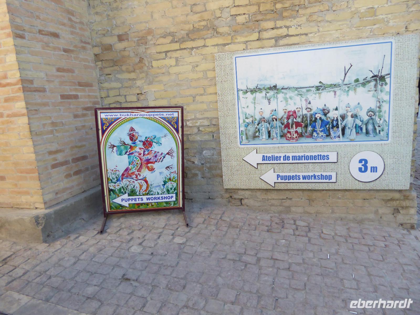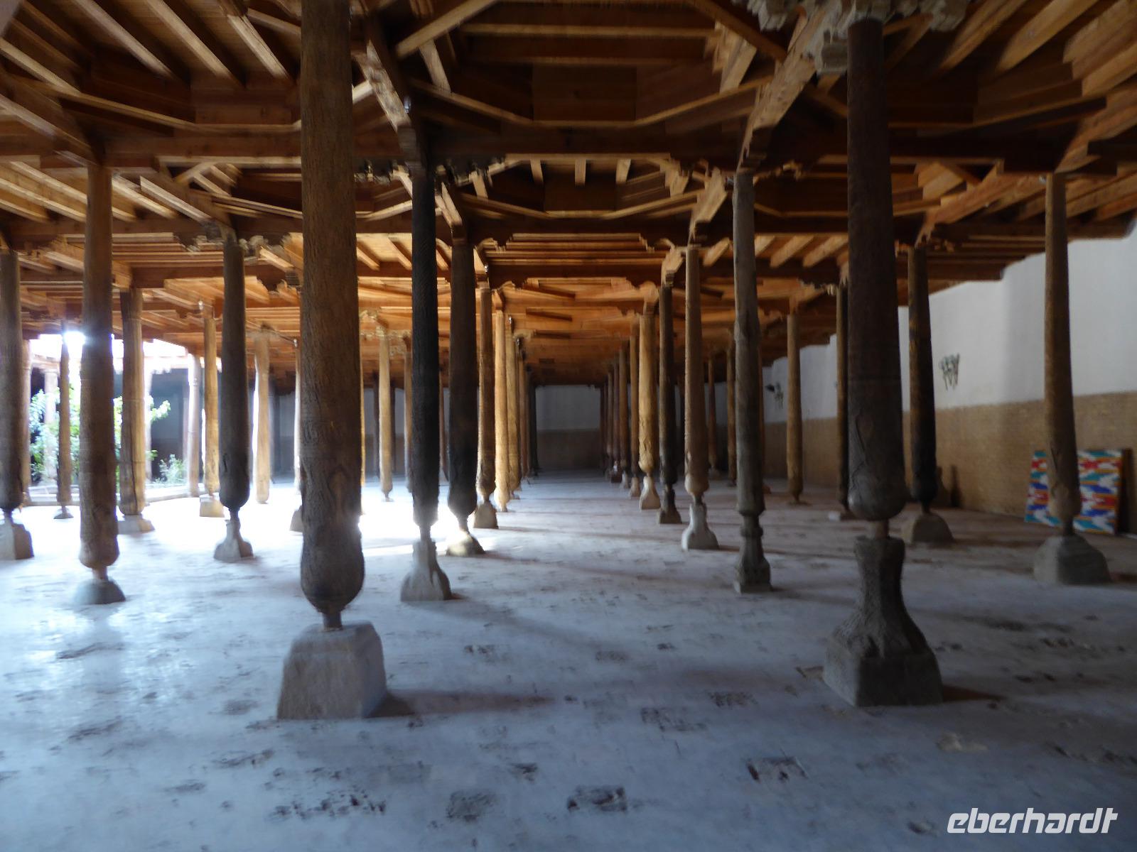 An Hodscha Nasreddin vorbei spazieren wir zu unserem Bus. Ziel ist heute Vormittag als erstes das Samaniden-Mausoleum. Es ist vor allem deshalb einzigartig, weil es eines der wenigen Baudenkmäler ist, das nicht der Zerstörungswut der Mongolen unter Führung von Dschingis Khan entging. Es wurde im Jahr 900 von Ismail ibn Ahamd für seinen Vater errichtet. Dieser wurde verehrt, weil er Arabisch anstelle von Persisch zur Amtssprache machte. Während seiner Herrscherzeit machte er sich nicht nur Freunde, was letztendlich dazu führte, dass er keines natürlichen Todes starb. Das Mausoleum ist ein großer Steinwürfel aus Backsteinen. Diese wurde unterschiedlich angeordnet, woraus sich ein Muster ergab. Im Mausoleum befindet sich eine steinerne Grabstätte, in der drei Familienmitglieder von ibn Ahmad beigesetzt sind. Heute lehnen diverse Bücher an das Grabmal, die hier an Touristen verkauft werden. Wir spazieren weiter, an einem Wasserbecken vorbei, aus dem in früher Zeit die Bewohner Bucharas mit Trinkwasser versorgt wurden. Das Wasser war nicht gereinigt, was dazu führte, dass tausende Menschen erkrankten. Die Regierung musste eingreifen. Die Wasserbecken wurden ausgetrocknet und das Wasser in Tanks gelagert. Nun kommen wir zu den Überresten der alten Stadtmauer. Dahinter befindet sich der Bazar. Wir schlendern durch die Abteilungen, kosten Käse, kaufen Honig und allerlei Süßigkeiten. Anschließend besuchen wir das Chashma-Alyub-Mausoleum, das durch seine verschiedenen Kuppelchen auffällt. Gegenüber befindet sich ein Monument, das an das zweitwichtigste Buch des Islams nach dem Koran erinnert. Das Bolo-Chaus-Ensemble, welches wir als nächstes besuchen, besteht aus der Bolo-Chaus-Moschee, einem achteckigen Wasserbecken und einem kleinen Minarett. Vor dem Eingang der Moschee befinden 20 schön geschnitzte Holzsäuen, die das Vordach tragen. Aus der richtigen Perspektive spiegeln sich die zwanzig Säulen im Wasser des Beckens, so dass man vierzig Säulen zählen kann. Vierzig ist eine Glückszahl in Usbekistan. Wir besichtigen die Moschee von Innen und für einen kleinen Obulus wird uns sogar das Licht angeschaltet. Unser nächster Besuch gilt der Festung Ark, die sich auf einem kleinen Hügel, etwas außerhalb der Altstadt, befindet. Bis ins 20. Jahrhundert war sie Palast und Regierungssitz der Herrscher von Buchara. 1920 wurde die Festung von der Roten Armee eingenommen. Der letzte Emir von Buchara verließ die Festung durch einen unterirdischen Gang und verbrachte den Rest seines Lebens im Exil. Seine Schätze wurden auf 48 Eisenbahnwaggons verladen und verschwanden auf Nimmerwiedersehen. Bevor der Emir die Flucht ergriff, soll es ihm gelungen sein, einen Teil seiner Schätze mit einer Karawane in die Wüste zu schicken. Aber auch diese sind bis heute spurlos verschwunden. Am Nachmittag besuchen wir den Kalon-Komplex. Zunächst kommen wir am Kalon-Minarett vorbei. Es ist fast fünfzig Meter hoch und Bucharas bekanntestes Wahrzeichen. Das Minarett stammt ebenfalls aus vormongolischer Zeit. 1127 wurde es erbaut. An seiner Stelle stand vorher ein anderes Minarett, was vermutlich wegen bautechnischer Unkenntnisse einstürzte. Am höchsten Punkt des Minaretts konnten mehrere Muezzins gleichzeitig in verschiedenen Richtungen zum Gebet rufen. Bis 1848 wurde die Minarettspitze auch dazu genutzt, verurteilte Verbrecher, die in einen Sack gesteckt wurden, publikumswirksam hinunterzuwerfen und damit die Todesstrafe zu vollstrecken. Wir besuchen die Kalon-Moschee, die in grauer Vorzeit bis zu 12.000 Gläubigen Platz bot. Heute kommen nur noch drei- bis vierhundert am Freitag zum Gebet. Ein weiteres Gebäude der Anlage, ist die Mir-i-Arab-Medrese, die 1535 erbaut wurde und noch heute zu den aktiven Medresen des Landes gehört. Nun ist endlich Shopping-Zeit. Wir besuchen den Messerschmied, den Miniaturen-Maler, das Silberschmuck-Geschäft und diverse Stände, an denen Tücher, Mützen, Taschen und Souvenirs zum Verkauf angeboten werden. Frohgelaunt, mit vollen Tüten und leeren Geldbörsen gelangen wir zum Hotel. Ein kleines Stündchen zum Frischmachen und es geht zum Abendessen. Im Hof einer Medrese speisen wir unter freiem Himmel bei ca. 10 Grad Außentemperatur, aber mit großartiger Folkloredarbietung und Modenschau.