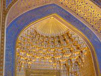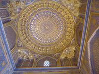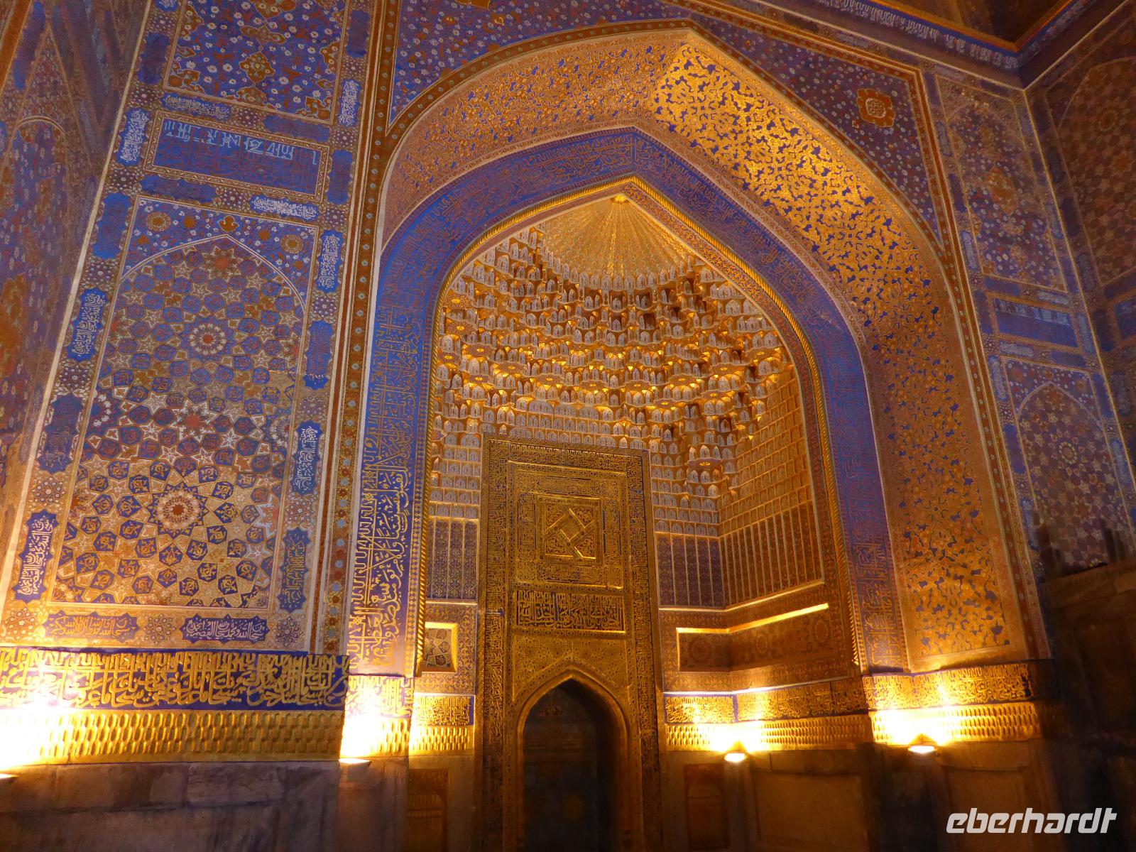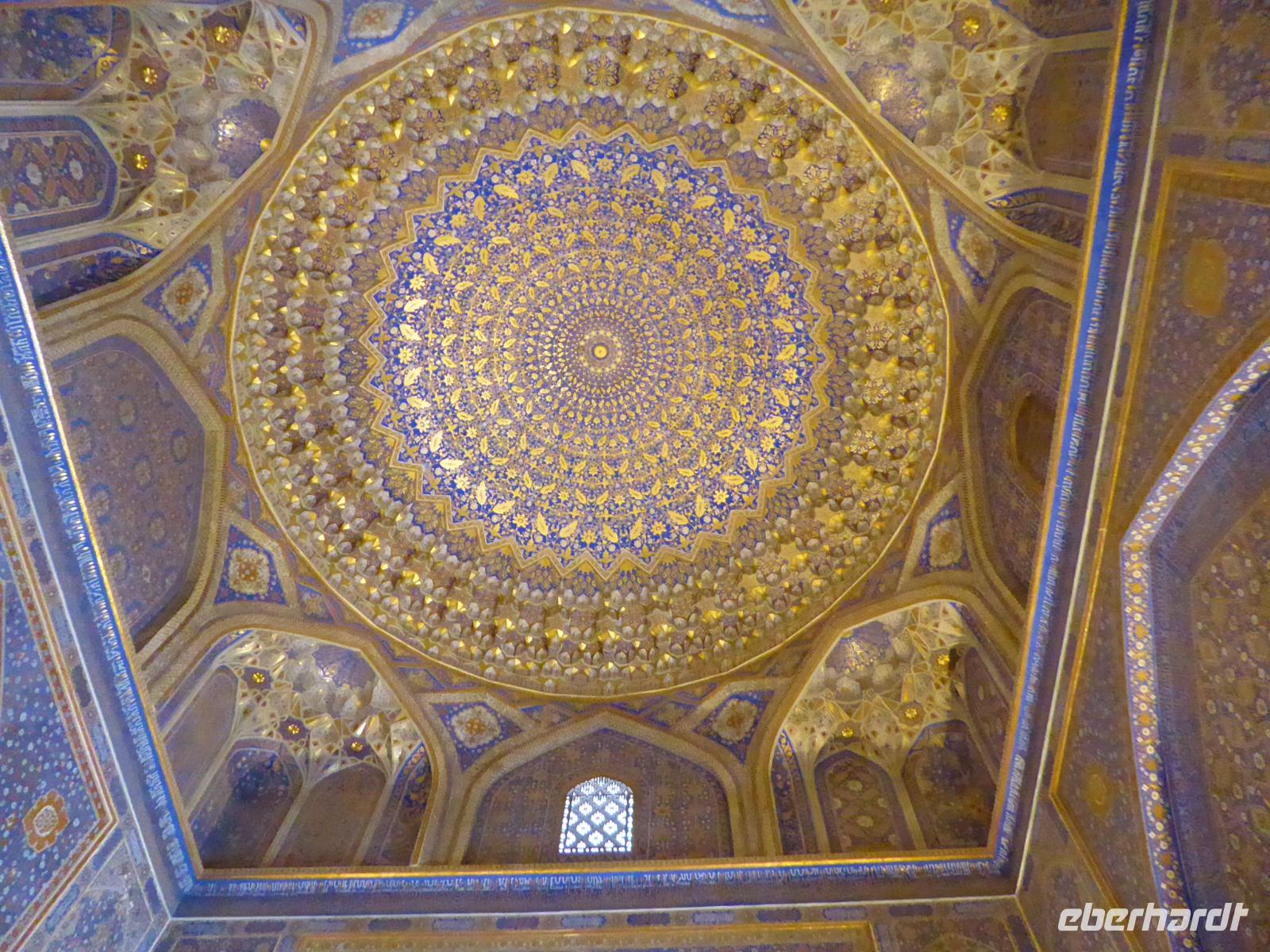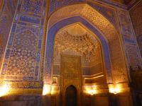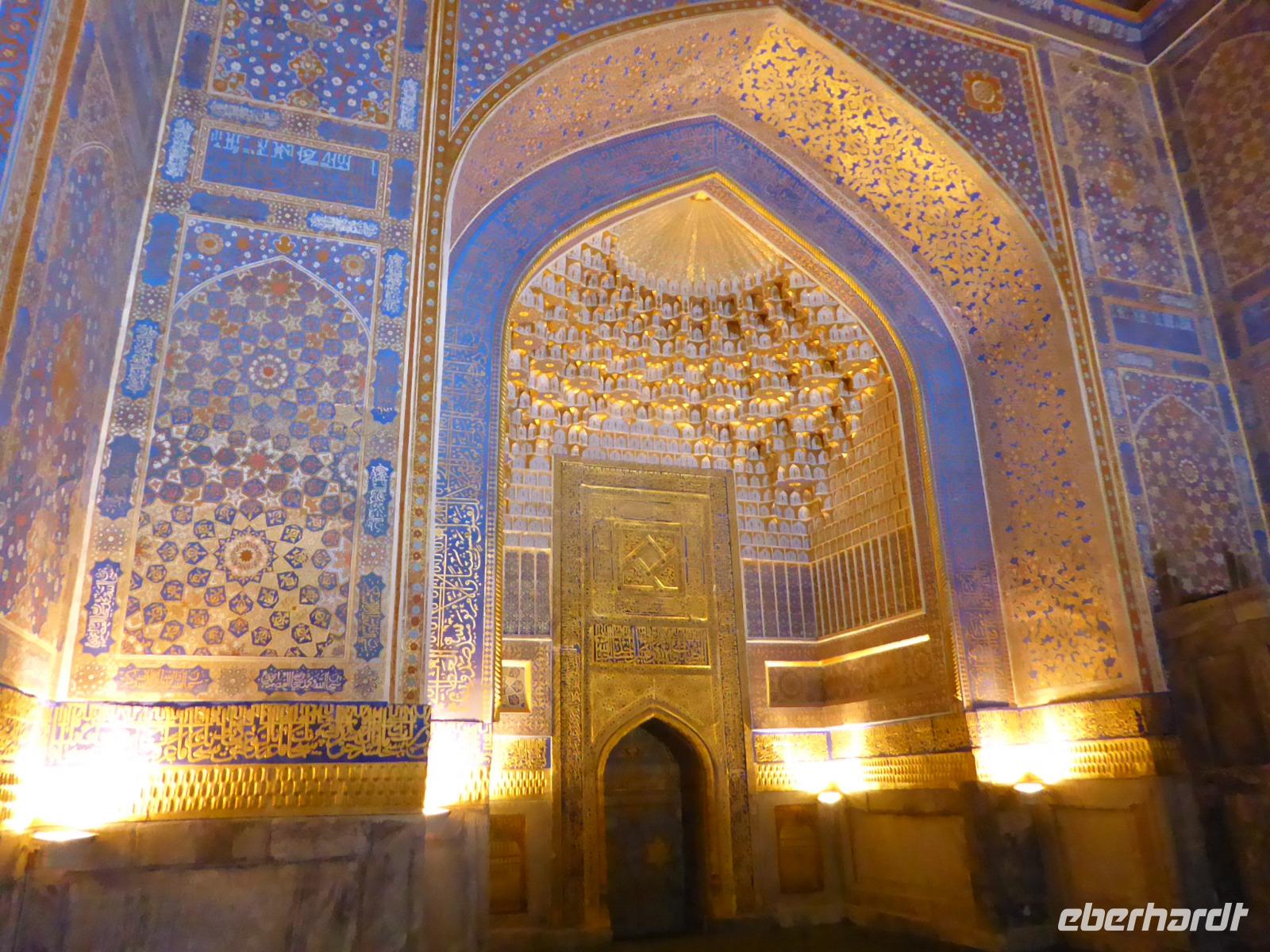 Am Vormittag besuchen wir den Gur-Emir-Komplex. Hierzu gehört die Gur-Emir-Moschee, die Grabstätte des großen Volkshelden Timur. Sie wurde 1403 bis 1404 errichtet und ist besonders wegen ihrer melonenförmigen Kuppel bekannt. Nach ausgiebiger Besichtigung gilt nun unsere Aufmerksamkeit dem Registanplatz. Dieser ist umgeben von restaurierten Medresen, in denen das Handelsleben tobt. In einem Shop treffen wir auf einen Mann, den wir aus der Usbekistan-Reportage kennen. Wir haben reichlich Zeit, unsere Summ an den Mann zu bringen. Nach dem Mittagessen fahren wir zum Atelier der Künstlerin Valentina Romanenko. Die Modenschau ist toll, nur die Gastgeberin ist muffelig und wir fühlen uns nicht gut aufgenommen. So kann sie auch kein Geschäft mit uns machen. Anschließend fahren wir in die Weinkellerei Khovrenko. Der Tisch ist gedeckt, doch bevor wir kosten dürfen, werden wir durch das kleine Museum geführt. Seit 1868 werden hier Weine gesammelt. Wir beginnen die Verkostung mit einem trockenen Weißwein, gefolgt von zwei trockenen Rotweinen. Anschließend wird es immer süßer und endet mit einem Kognac und einem Kräuter. Zum Schluss sind viele Gläser noch voll. Wir haben es hier wohl nicht mit vielen Weinliebhabern zu tun. Nun wartet noch das Kostümtheater auf uns. Wir kommen ein bisschen zu spät und müssen uns in den kleinen Saal schleichen. In den schönsten glitzernden Kostümen wird hier getanzt. Eine Hochzeit wird gespielt, wir kennen die Rituale, Zita hat sie uns ausführlich vorgestellt. Nach einer Stunde ist der Spaß vorbei und wir fahren zum letzten Programmpunkt für heute - zum Abendessen bei einer Familie. Der Tisch biegt sich unter dem Gewicht der leckeren Speisen. Zum Hauptgang gibt es traditionellen Plow. Gut gesättigt steigen wir zu Umir in den Bus. Obwohl wir reichlich geschafft sind, freuen wir uns, dass Umir für uns im illuminierten Samarkand noch Fotostopps einlegt.