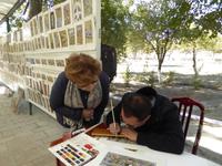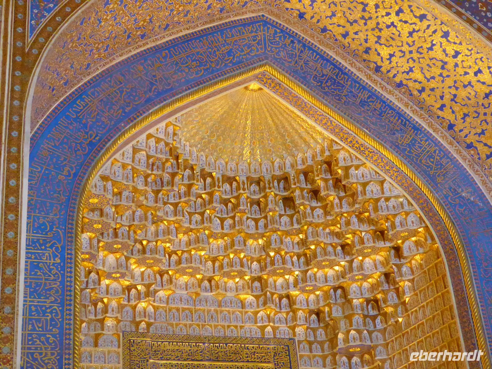 Denn außer uns traut es sich keiner, den Weg nach Schahrisabs auf sich zu nehmen. Normalerweise liegt Schahrisabs auf dem Weg nach Samarkand, jedoch ist eine Brücke wegen Altersschwäche bei einer Überschwemmung marode geworden und wir bzw. Busse dürfen die Brücke nicht mehr überqueren. Das bedeutet, dass wir 270 Kilometer nach Samarkand fahren und von dort 170 Kilometer nach Schahrisabs und wieder zurück. Wir werden und halb sechs geweckt und fahren um sieben los. Mittags um zwei sind wir in Schahrisabs. Wir sind ziemlich malade. Zunächst kehren wir bei einer Bauernfamilie zum Mittagessen ein. Beliebtes Fotoobjekt im Garten ist ein Strauch mit zwei Granatäpfeln. Nun besuchen wir die Hinterlassenschaften des usbekischen Volkshelden Timur. Zunächst geht es zum Weißen Palast, wobei WEISS hier nicht für die Farbe steht, sondern als ehrender Zusatz verwendet wird. Wir sehen Teile des Portals, die noch heute die ehemalige Pracht erahnen lassen. Alles war aufwendig mit blauen Mosaiken dekoriert. Der Palast war ein Großprojekt, das sich über mehrere Jahrzehnte hinzog und wahrscheinlich nicht abgeschlossen wurde. Nach gründlicher Bewunderung setzen wir unseren Spaziergang fort. Wir kommen am Denkmal vom großen Timur vorbei, das sich direkt vor dem Palast befindet. Von Weitem ist jetzt schon die blaue Kuppel der Kok-Gumbas-Moschee zu sehen. Im Innern der Moschee sind wundervolle Malereien zu sehen, an denen man chinesische Einflüsse erkennen kann. Wir flanieren weiter durch eine neu angelegte Parkanlage, die zum 860. Geburtstag von Timur im nächsten Jahr fertig werden soll. Schon jetzt ist zu sehen, wie schön es hier zukünftig sein wird. In der Mitte viele Springbrunnen, rechts und links viele Läden, die bald den Touristen das Geld aus den Taschen ziehen werden. Nun müssen wir aber aufbrechen, denn wir fahren nach Samarkand zurück. Unterwegs gibt es noch einen Stopp bei einer Bauernfamilie, die sich mit Teppichknüpferei ihr Geld verdient. Sie laden zu Tee und dunklem Brot ein und präsentieren uns ihre Stücke. Touristengröße und Touristenpreise (also erschwinglich) verleiten dazu, das eine oder andere Stückchen zu erwerben. In Samarkand ist es dunkel als wir ankommen. Wir essen heute im Hotel, weil der Tag so anstrengend war, wollten wir nicht noch in ein Restaurant fahren. Leider erweist sich die Küche des Hauses, dem sonst prächtigen Hotel nicht würdig. Die Salate schmecken so la la, der Reis ist pur, das Fleisch hart und fast ungenießbar. Wir reklamieren beim Chefkellner, er entschuldigt sich und lässt uns Omelett bringen, das wir aus Höflichkeit dann essen (eigentlich sind wir ja satt). Schade.