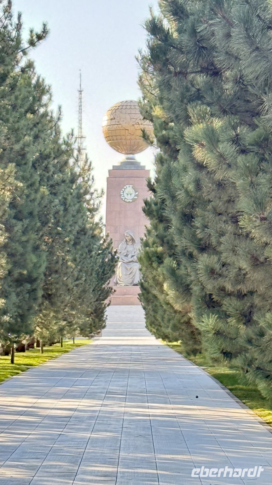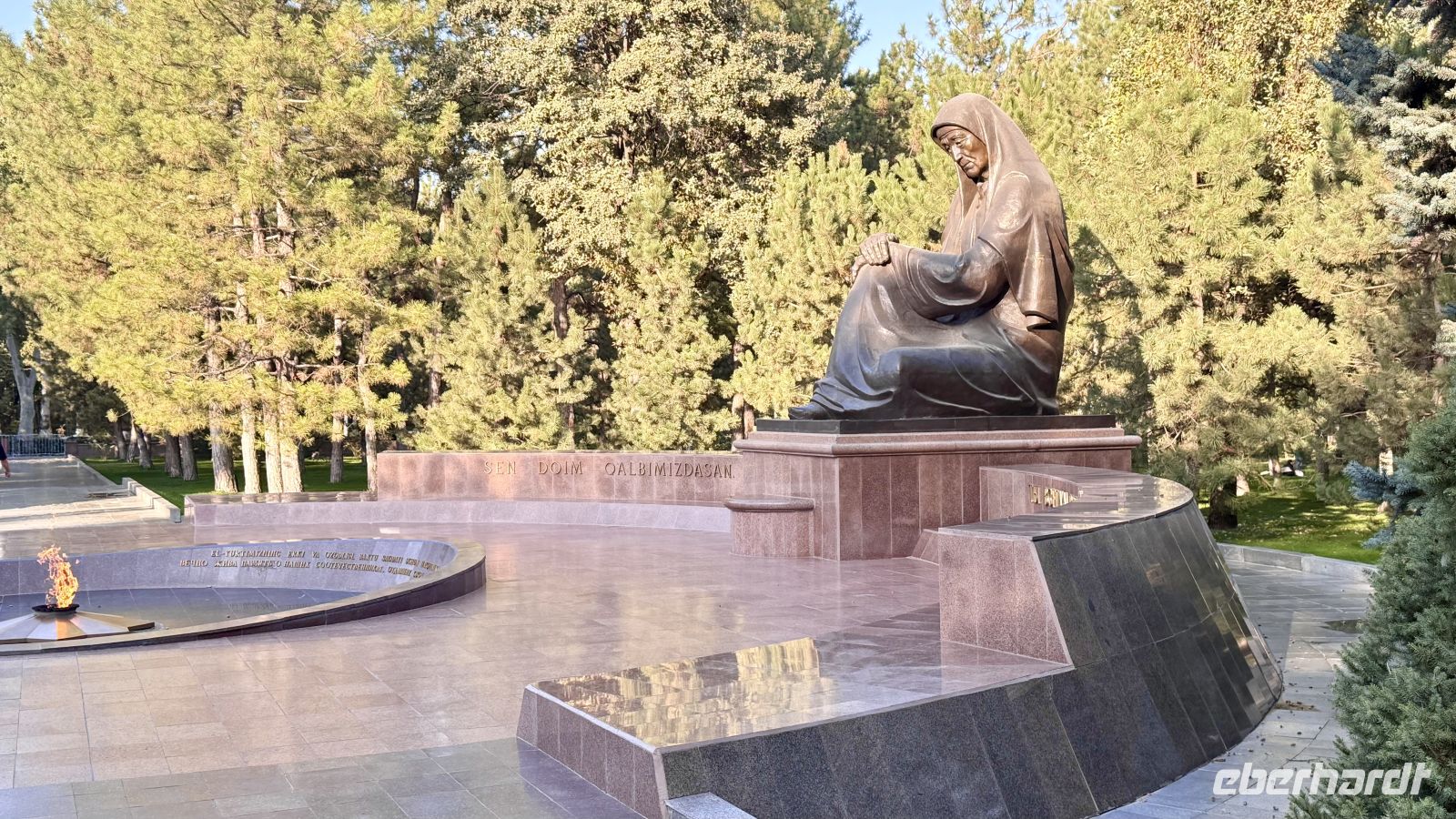 Gleich daneben befindet sich das Denkmal der Trauernden Mutter, eine würdige und bewegende Gedenkstätte. Die bronzene Statue einer Mutter, die das Foto ihres gefallenen Sohnes in den Händen hält, ehrt die usbekischen Soldaten, die im Zweiten Weltkrieg ihr Leben ließen. Hinter der Statue erstreckt sich eine lange Ehrenmauer, auf der die Namen von über 400.000 im Krieg gefallenen Usbeken eingraviert sind. Der gesamte Platz ist eine stille, würdevolle Anlage, die zum Nachdenken und Innehalten einlädt.