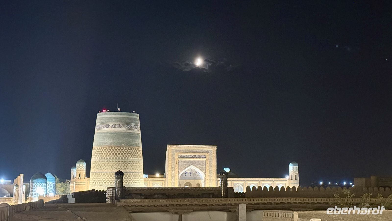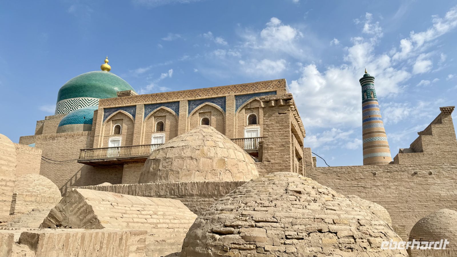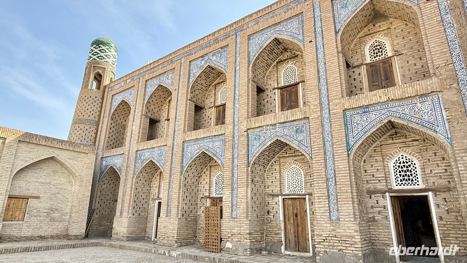 Noch früh am Morgen starteten wir unsere Reise nach Urgentsch. Mit dem Flugzeug konnten wir einen Teil von Usbekistan nun auch aus der Vogelperspektive betrachten. Dort angekommen fuhren wir weiter zu unserer Unterkunft in Chiwa — die historische Altstadt Ichan-Qal’a ist Teil des UNESCO-Welterbes und bekannt für ihre gut erhaltene mittelalterliche Architektur. Hier frühstückten wir erst einmal, bevor unser Stadtrundgang startete. Wir besichtigten die Dschuma-Moschee (Juma Mosque) mit ihren vielen geschnitzten Holzsäulen, die einst Teil eines großen Säulensaales waren. Dann stand das Islam Khodja Minarett und die Madrasa Islam Khodja auf dem Programm: das Minarett ist etwa 44–56 m hoch, mit einer Wendeltreppe innen und einer Aussichtsplattform, von der man einen weiten Blick über Chiwa hat; die Madrasa hat 42 kleine Zellen auf zwei Stockwerken und beherbergt heute das Museum für angewandte Kunst. Auch der Tash-Hauli Palast beeindruckte uns mit seinen drei Innenhöfen, prächtigen Majolika-Fliesen, geschnitzten Holzsäulen, Loggien und den privaten Räumen des Khans sowie dem Harem.