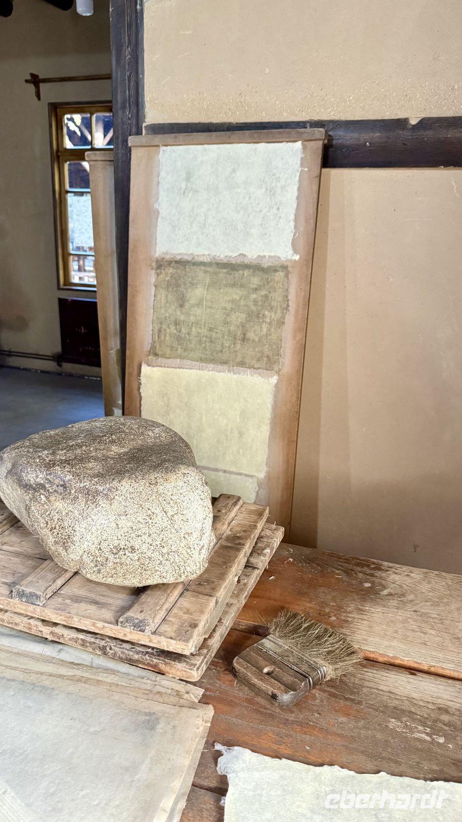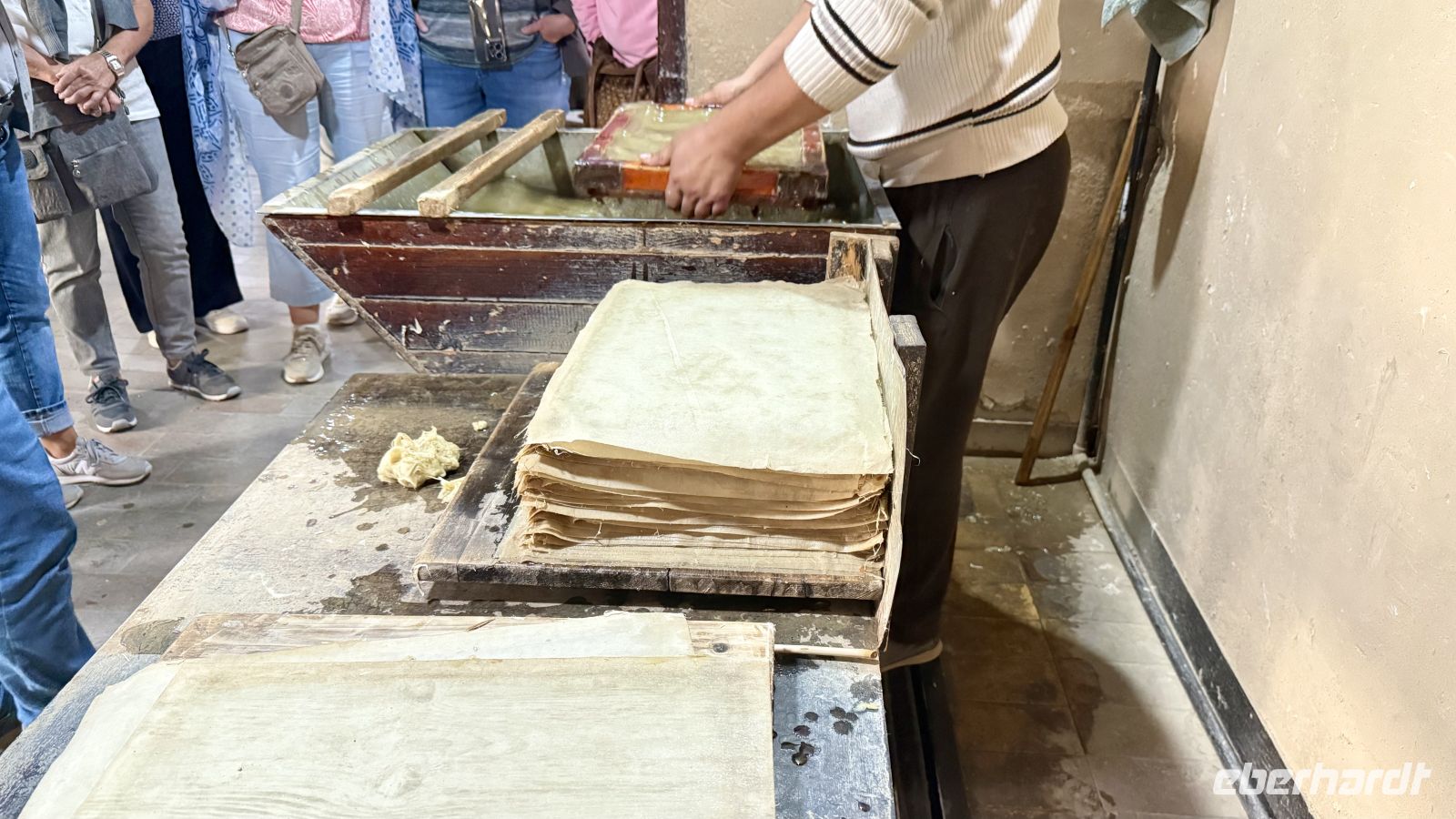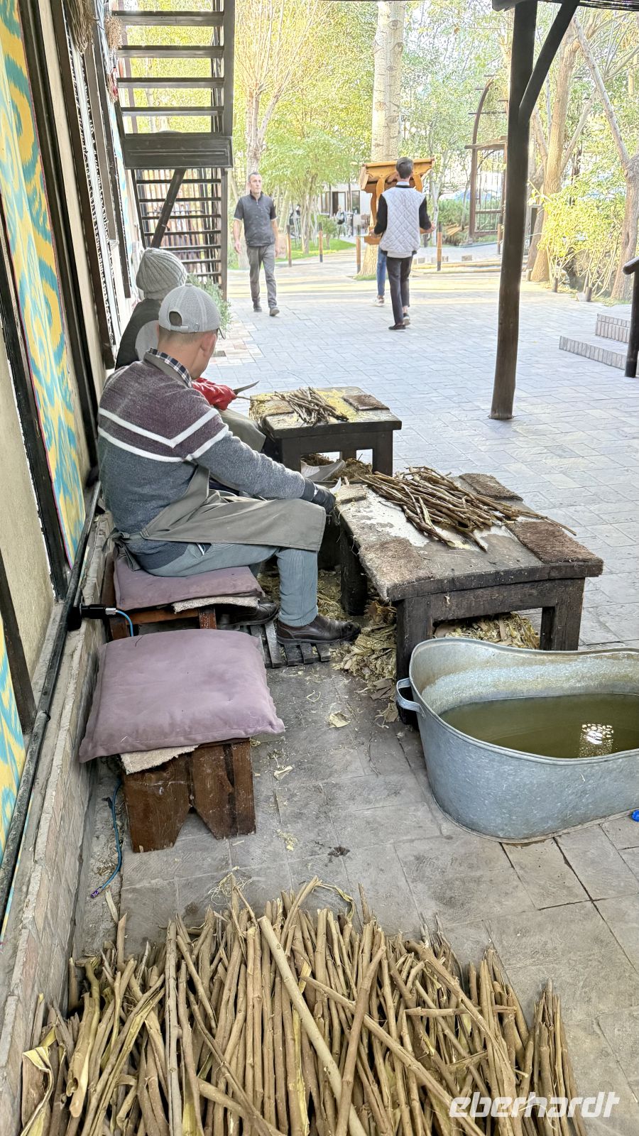 Als letzten Programmpunkt besuchten wir eine Seidenpapierfabrik, in der das traditionelle Handwerk der Papierherstellung nach jahrhundertealten Methoden wiederbelebt wurde. Das Papier wird aus der Rinde des Maulbeerbaums hergestellt, wie es schon zu Zeiten der Seidenstraße üblich war. In mühevoller Handarbeit entsteht so ein feines, haltbares Papier, das heute für Kunsthandwerk, Buchdruck und Kalligrafie verwendet wird.