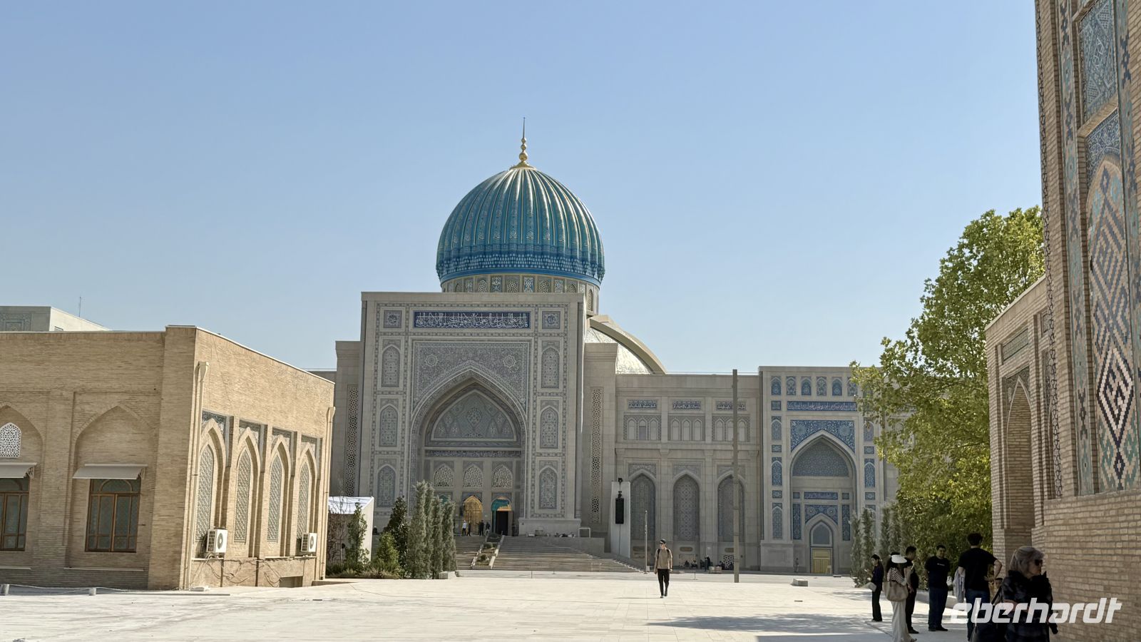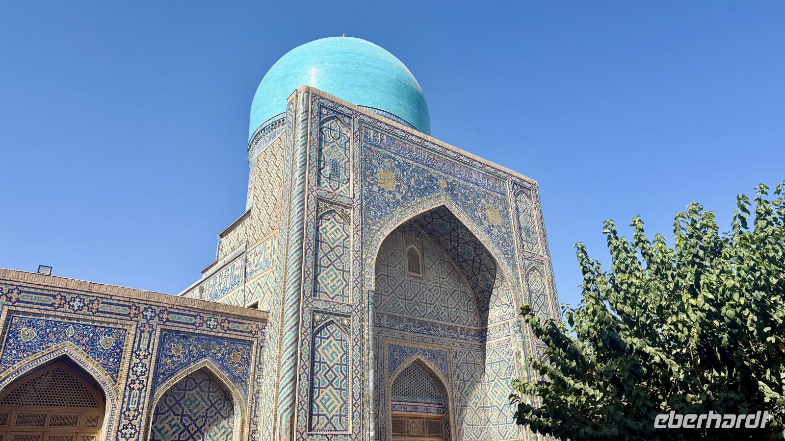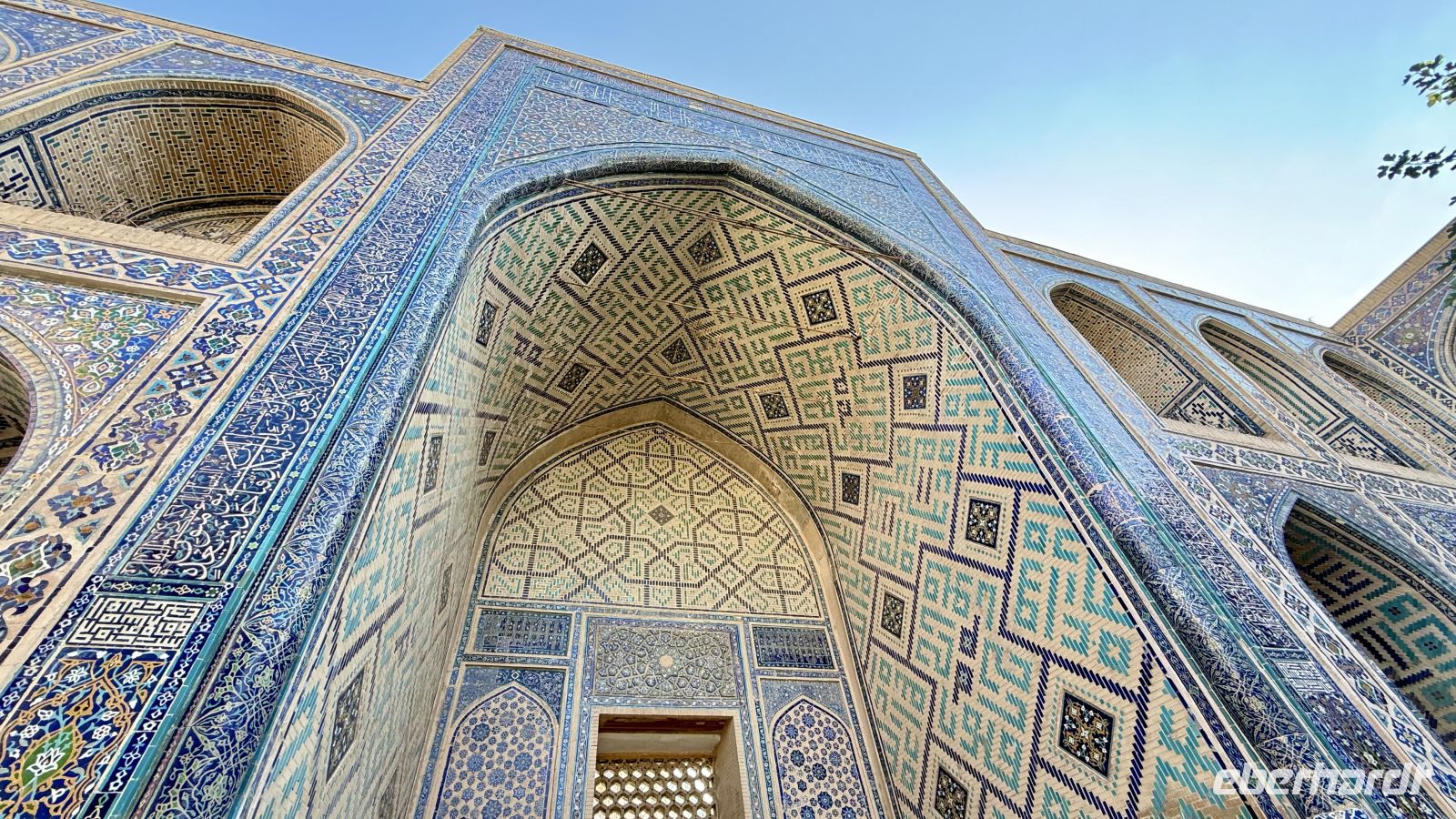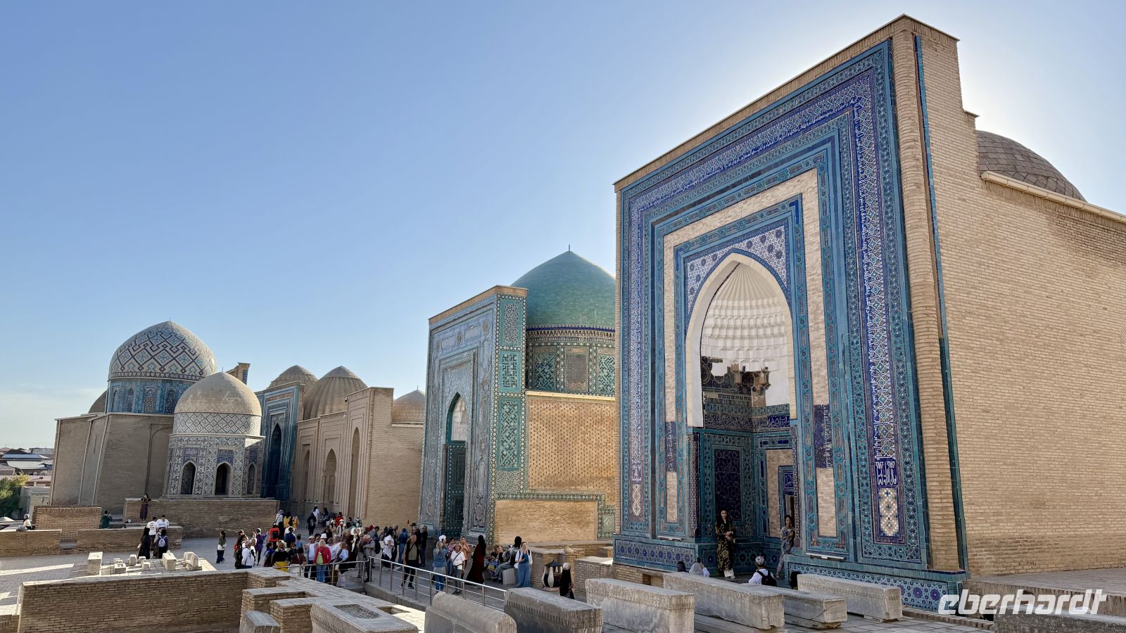 Nicht fehlen durfte natürlich die Shohizinda-Nekropole, ein beeindruckendes Ensemble aus Mausoleen, das sich terrassenförmig am Hang entlangzieht. Hier liegen viele Adelige und Angehörige Timurs begraben. Besonders faszinierend sind die leuchtend blauen und türkisfarbenen Kachelmosaike, die zu den schönsten in ganz Zentralasien zählen. Der Name „Shohizinda“ bedeutet „der lebende König“ und bezieht sich auf Kusam ibn Abbas, einen Vetter des Propheten Mohammed, dessen Grab hier verehrt wird.