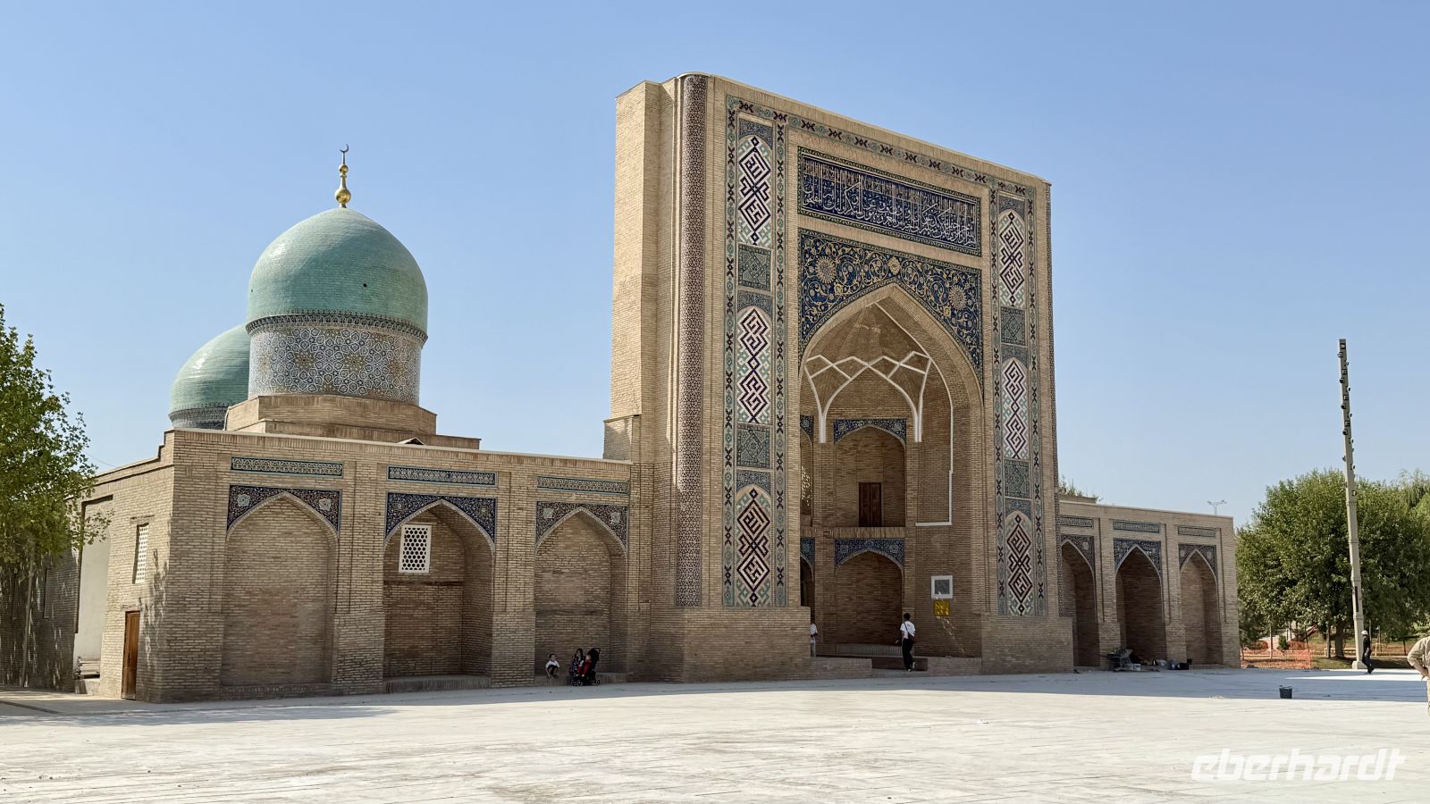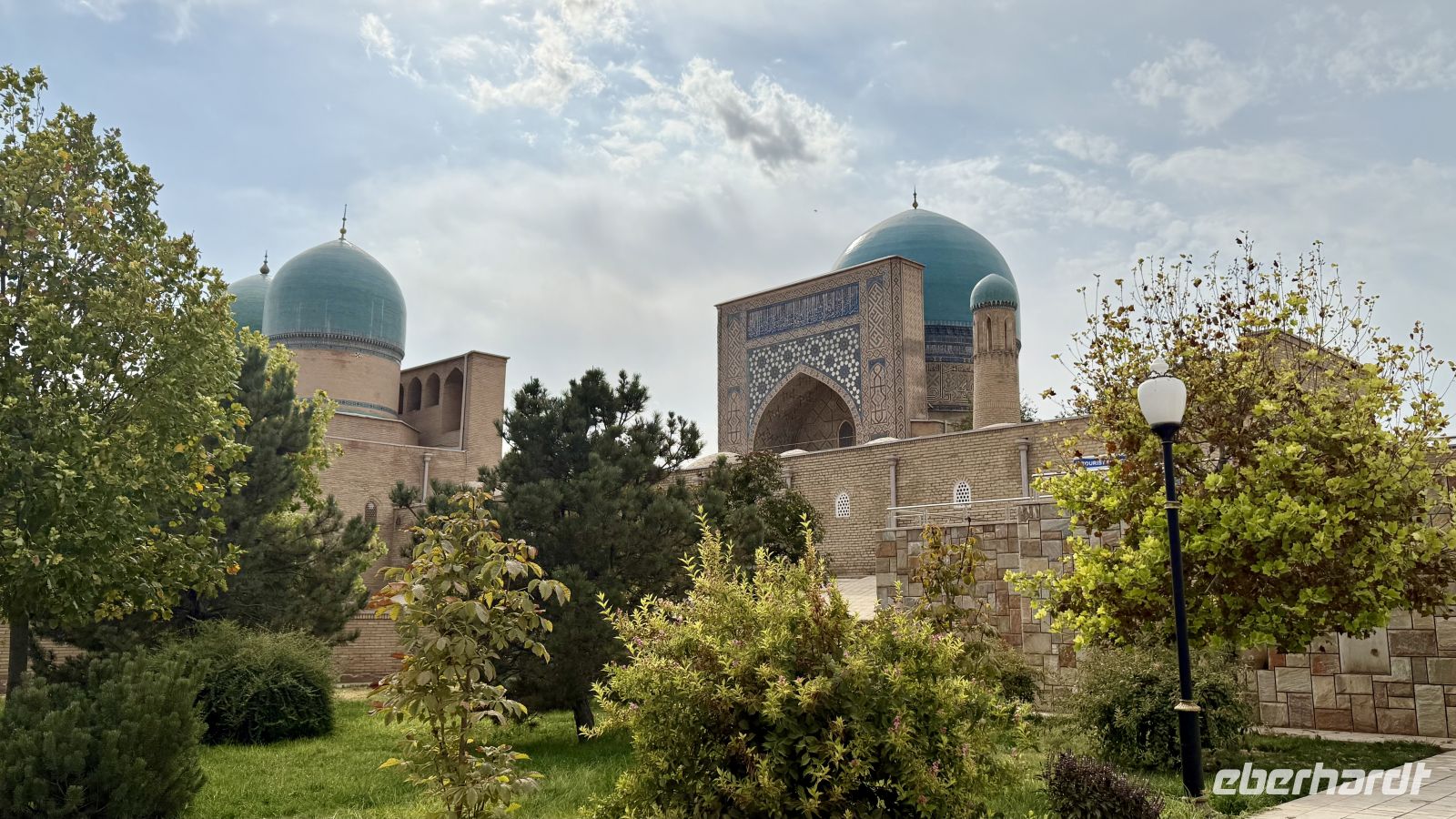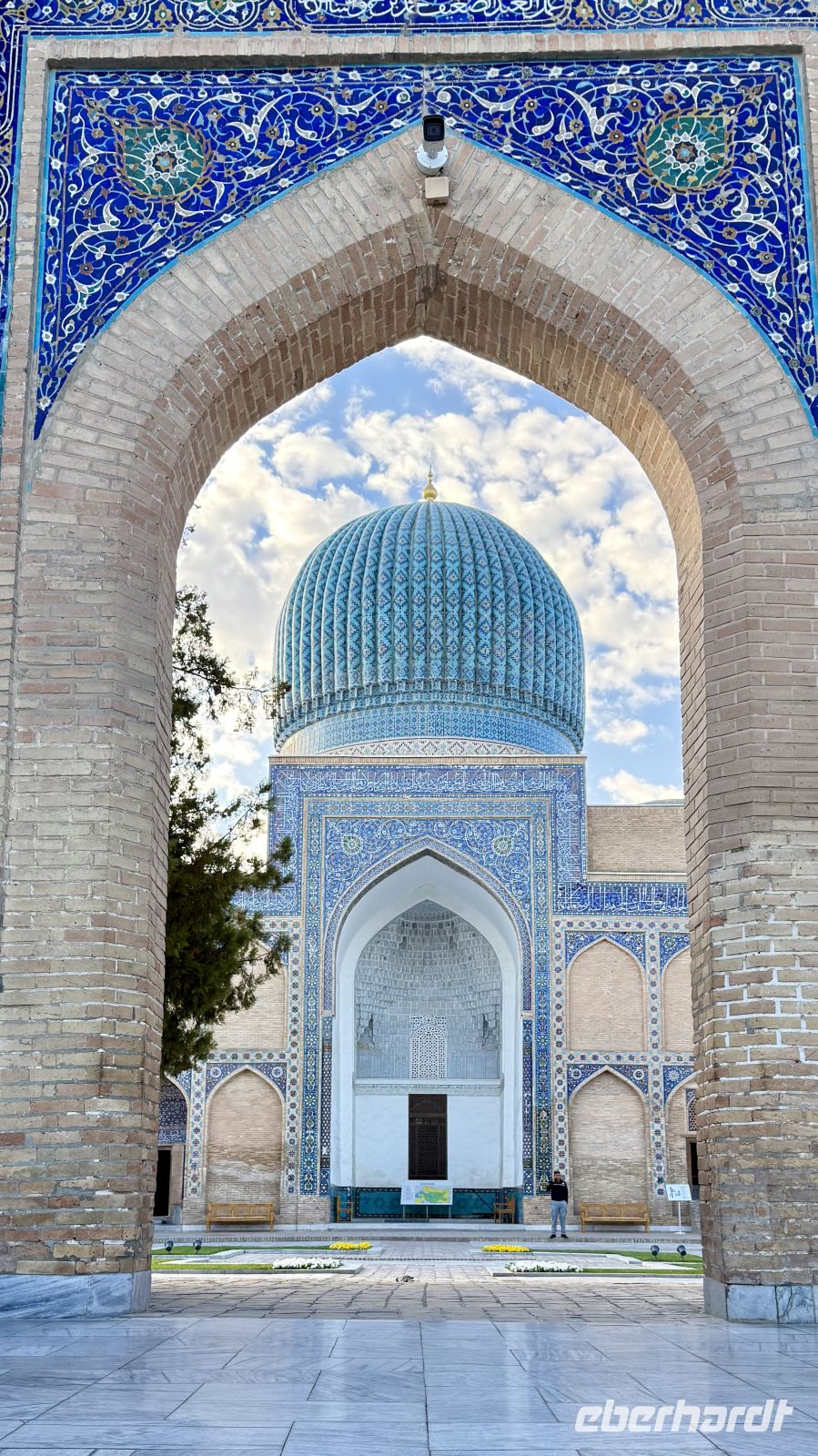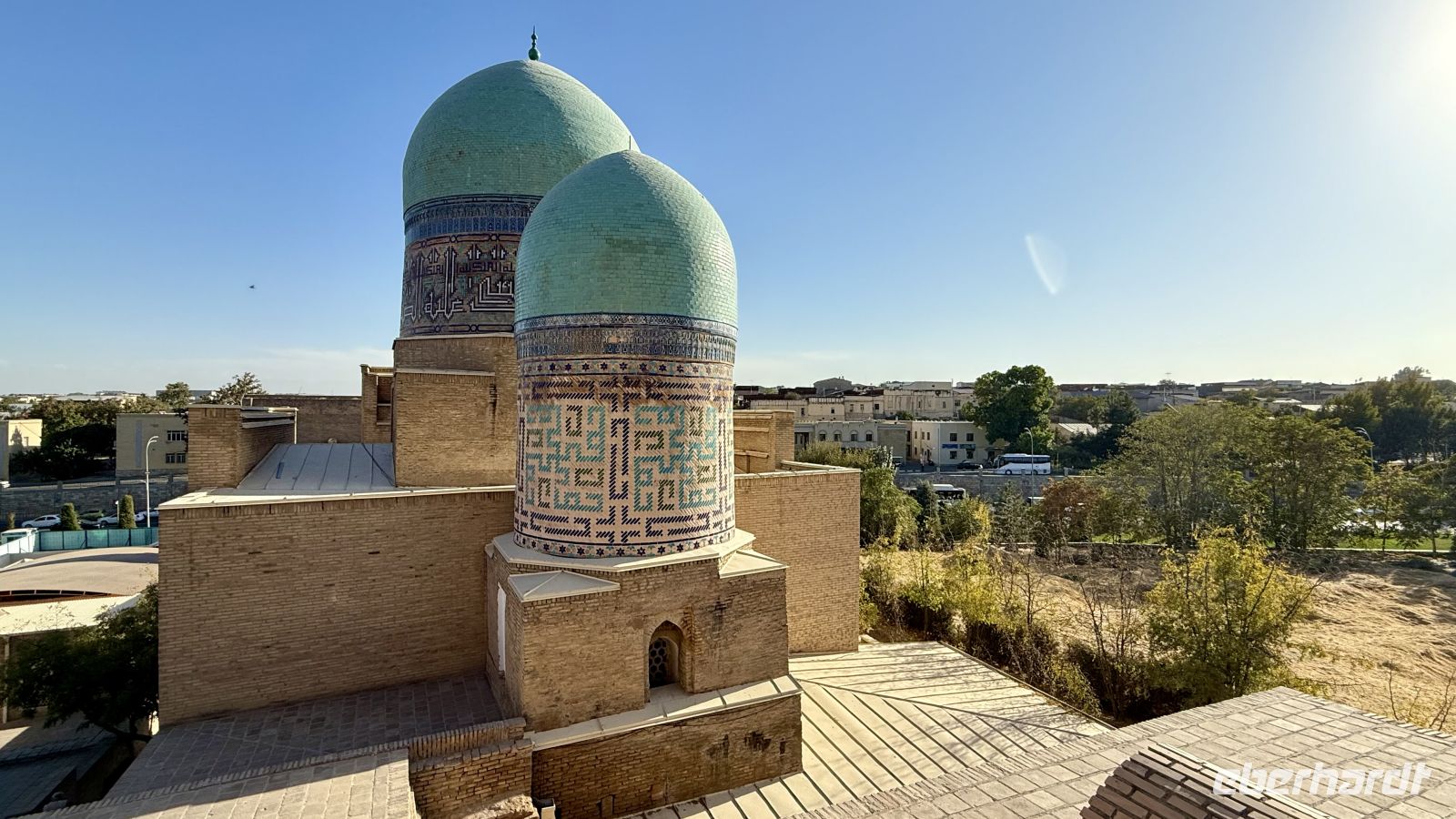 Nicht fehlen durfte natürlich die Shohizinda-Nekropole, ein beeindruckendes Ensemble aus Mausoleen, das sich terrassenförmig am Hang entlangzieht. Hier liegen viele Adelige und Angehörige Timurs begraben. Besonders faszinierend sind die leuchtend blauen und türkisfarbenen Kachelmosaike, die zu den schönsten in ganz Zentralasien zählen. Der Name „Shohizinda“ bedeutet „der lebende König“ und bezieht sich auf Kusam ibn Abbas, einen Vetter des Propheten Mohammed, dessen Grab hier verehrt wird.