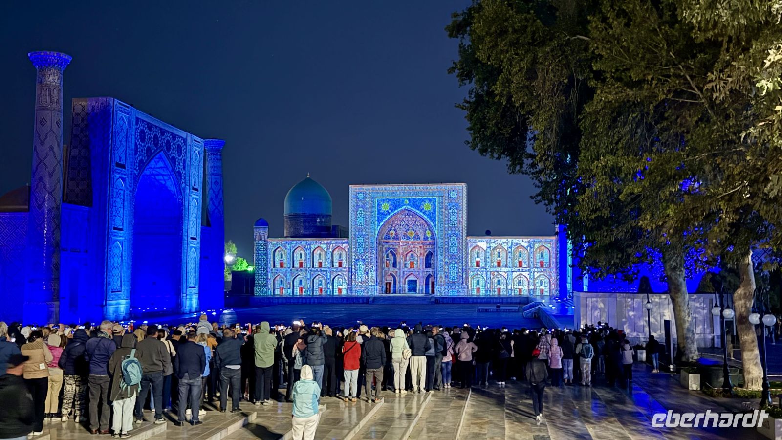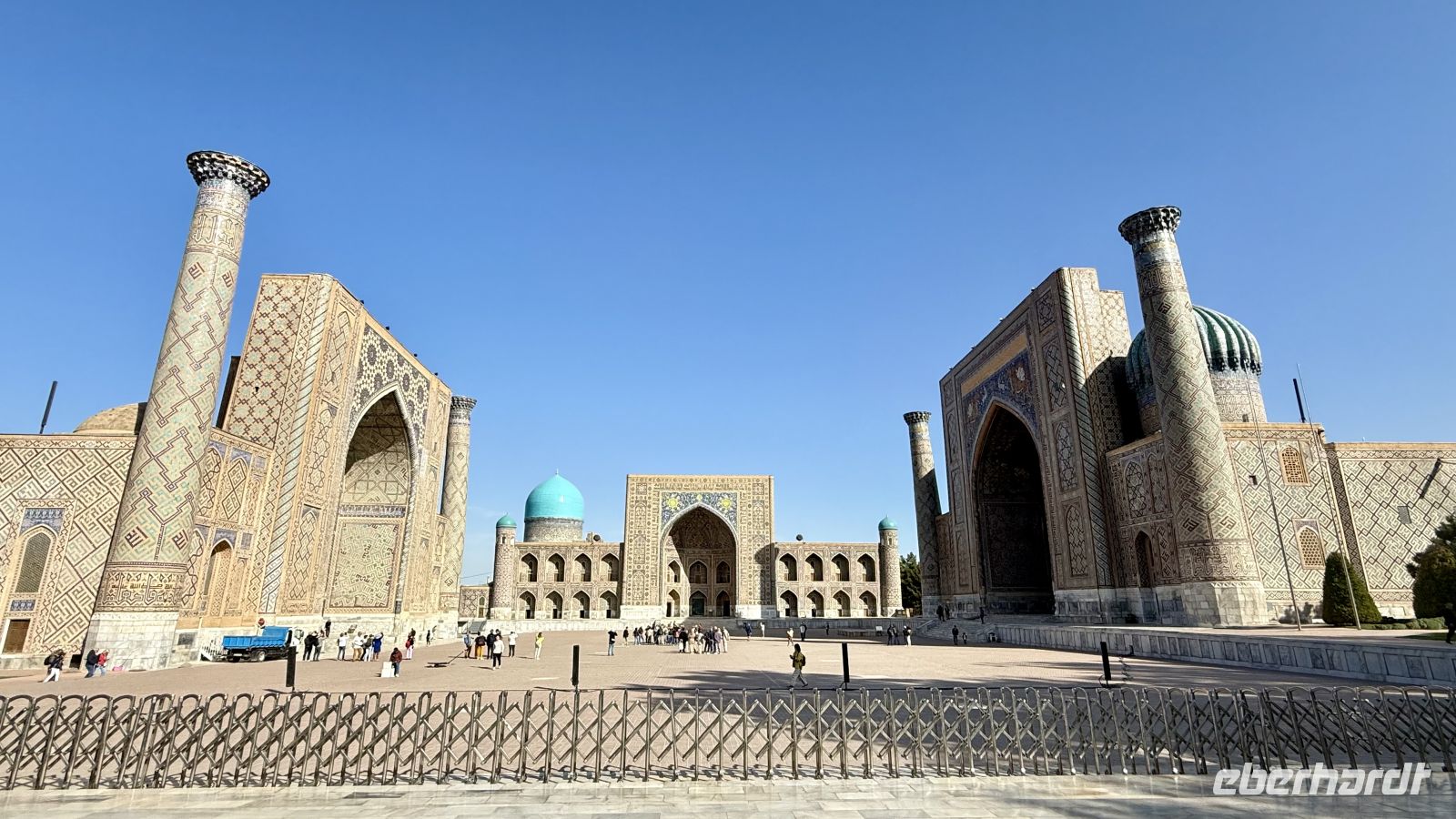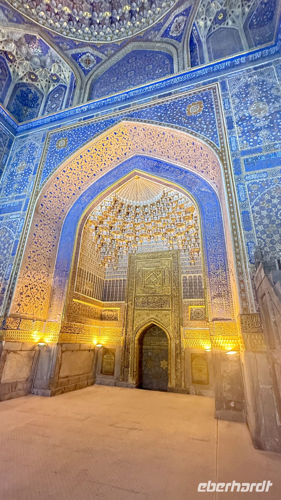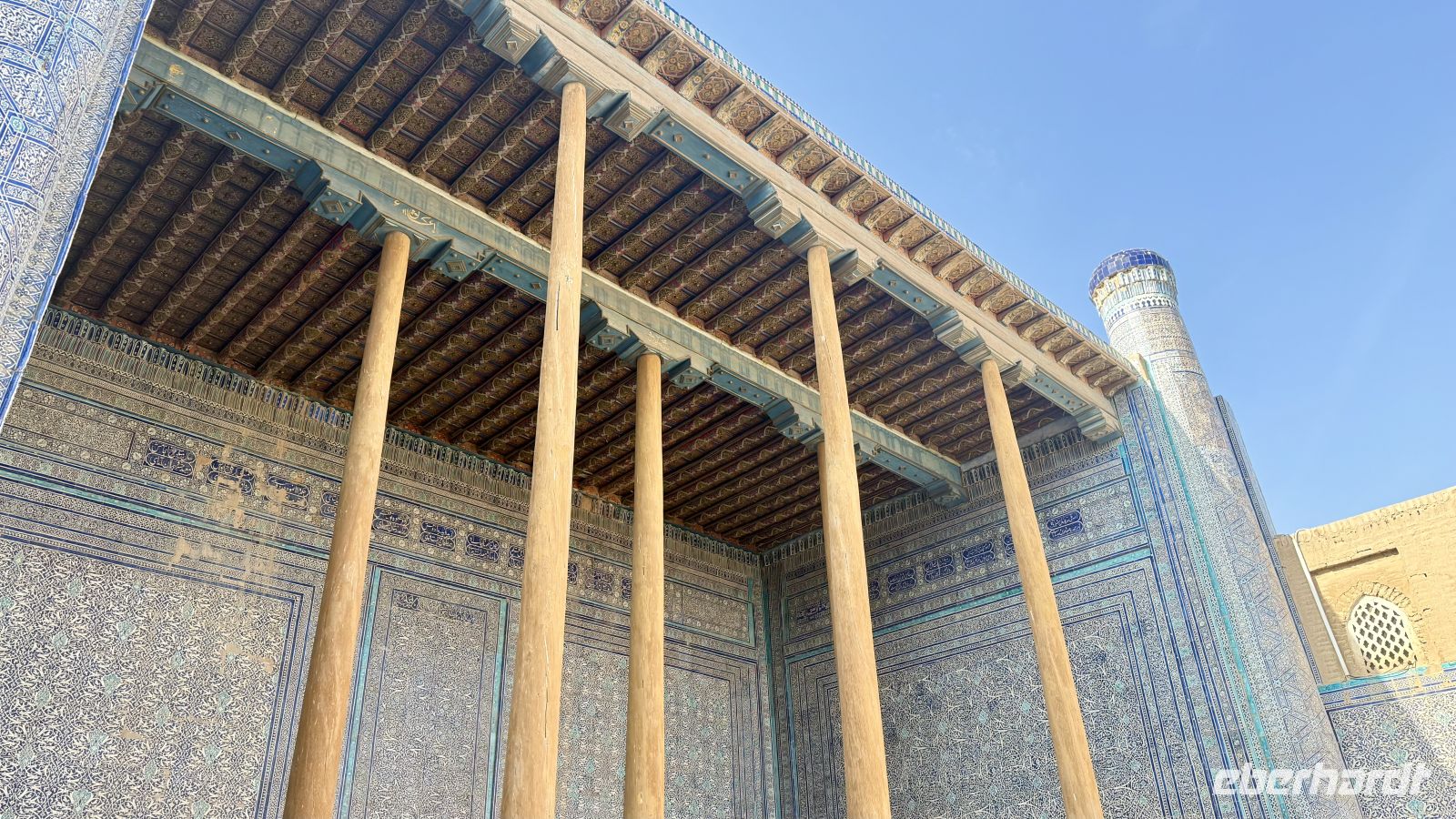Nicht fehlen durfte natürlich die Shohizinda-Nekropole, ein beeindruckendes Ensemble aus Mausoleen, das sich terrassenförmig am Hang entlangzieht. Hier liegen viele Adelige und Angehörige Timurs begraben. Besonders faszinierend sind die leuchtend blauen und türkisfarbenen Kachelmosaike, die zu den schönsten in ganz Zentralasien zählen. Der Name „Shohizinda“ bedeutet „der lebende König“ und bezieht sich auf Kusam ibn Abbas, einen Vetter des Propheten Mohammed, dessen Grab hier verehrt wird.