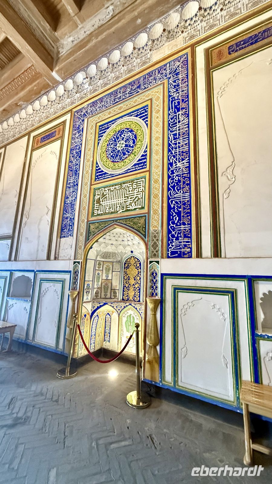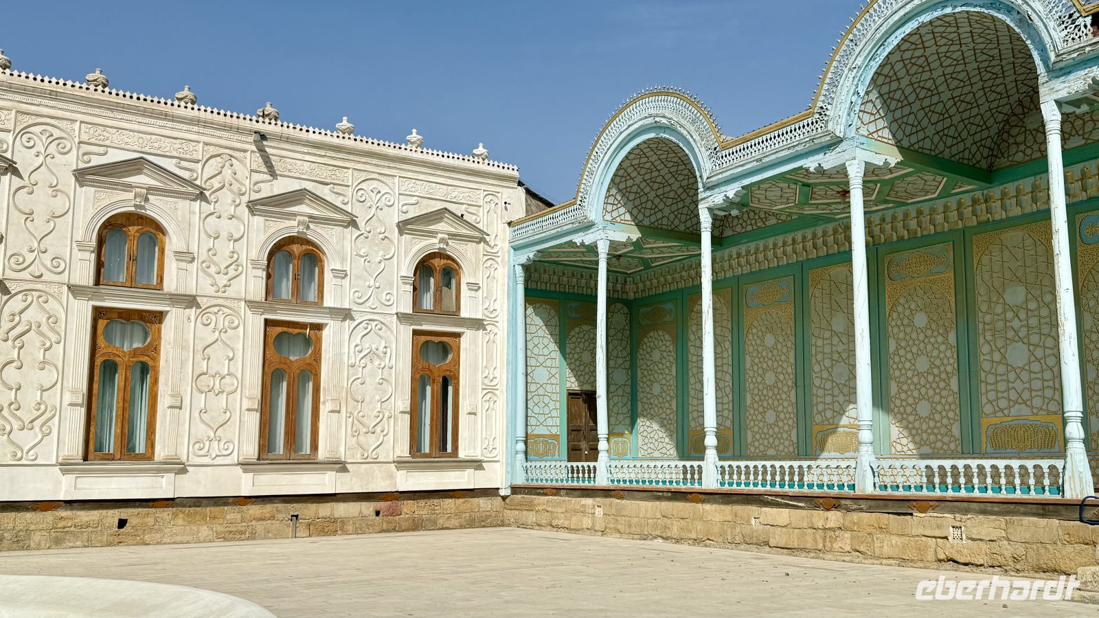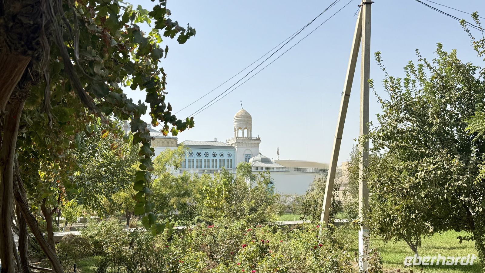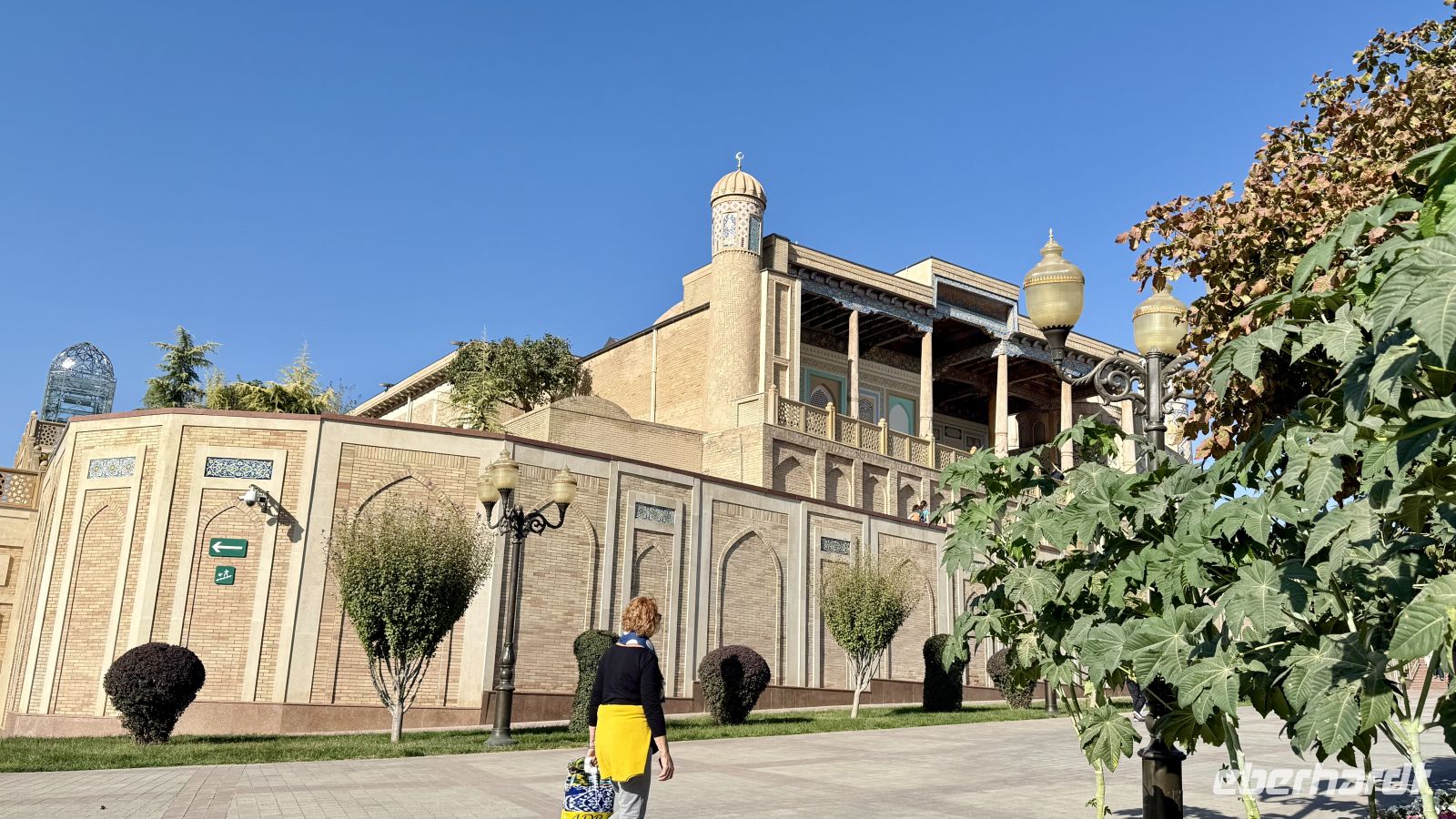 Anschließend besuchten wir den Sommerpalast Sitorai Mokhi Khosa, dessen Name übersetzt „Palast der Sterne und des Mondes“ bedeutet. Er wurde Anfang des 20. Jahrhunderts für den letzten Emir von Buchara, Said Alim Khan, erbaut. Der Palast vereint auf faszinierende Weise orientalische Ornamentik mit europäischen Einflüssen – ein Ergebnis der engen kulturellen Kontakte zur damaligen Zeit. Besonders beeindruckend sind die reich verzierten Empfangsräume mit venezianischen Spiegeln, feinem Stuck, bunten Glasfenstern und kunstvollen Holzschnitzereien. Heute beherbergt der Palast ein Museum für angewandte Kunst, in dem kostbare Stoffe, Schmuckstücke und traditionelle Trachten ausgestellt sind.