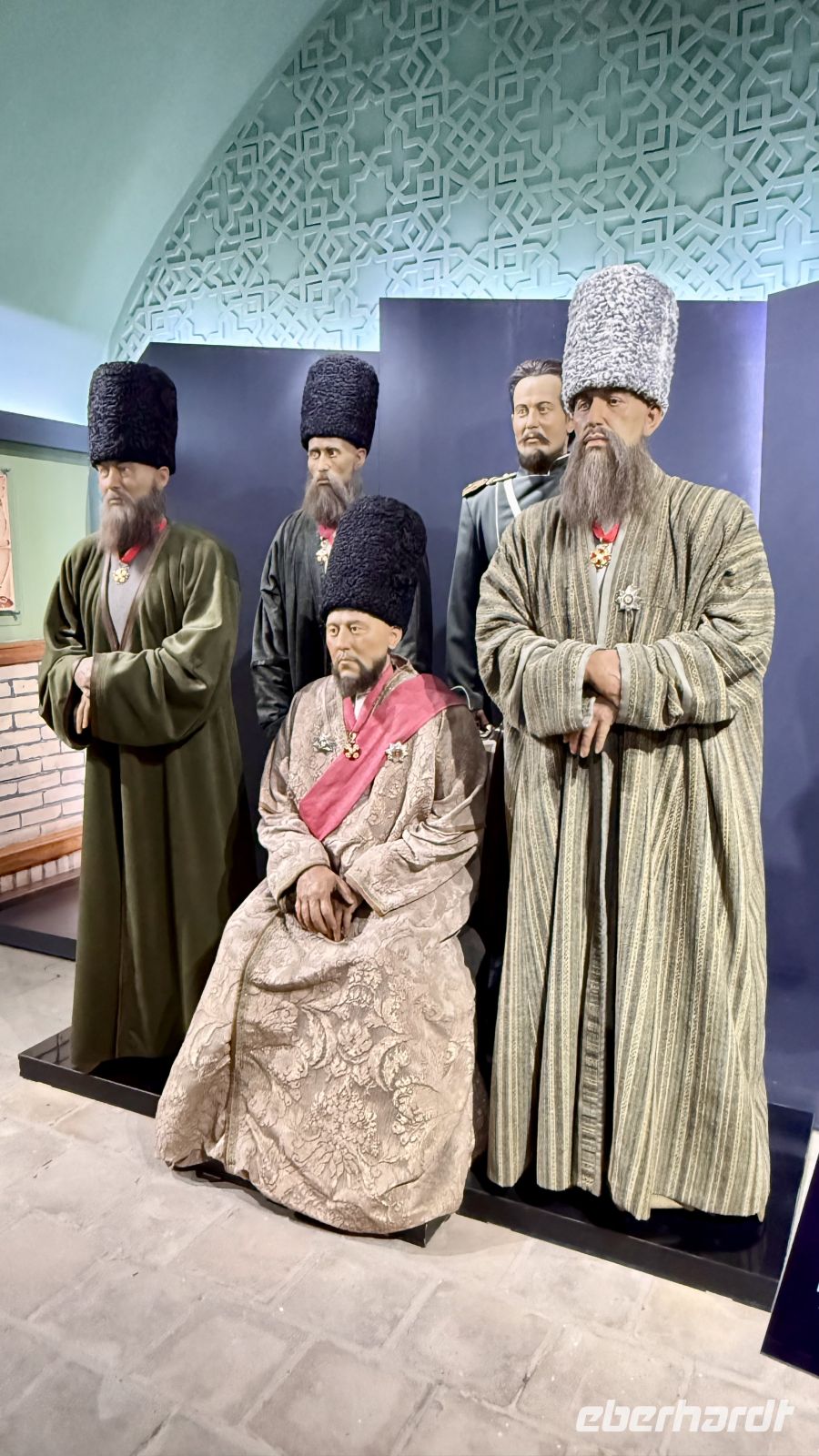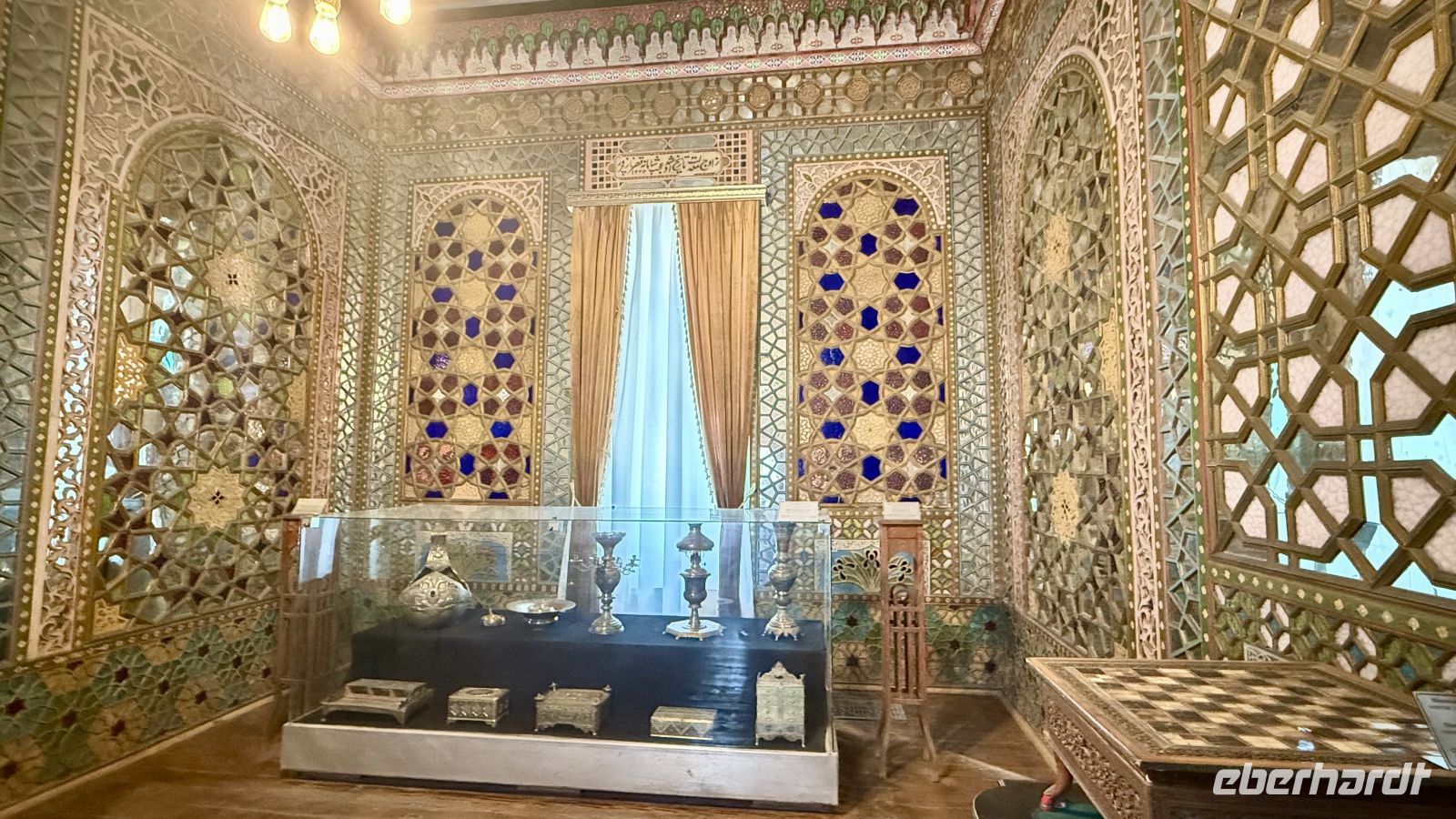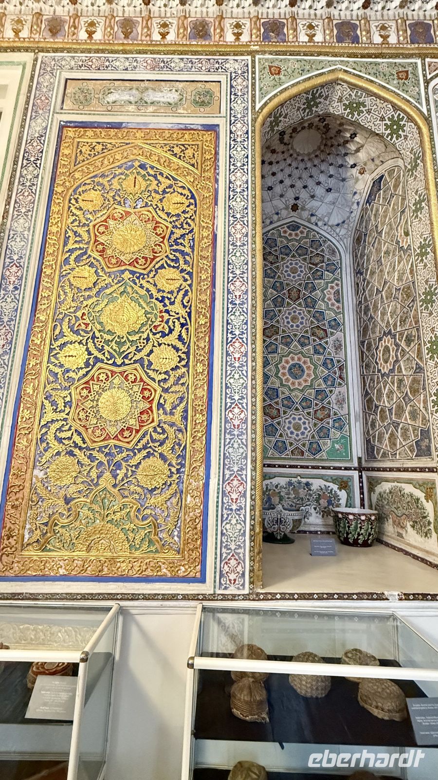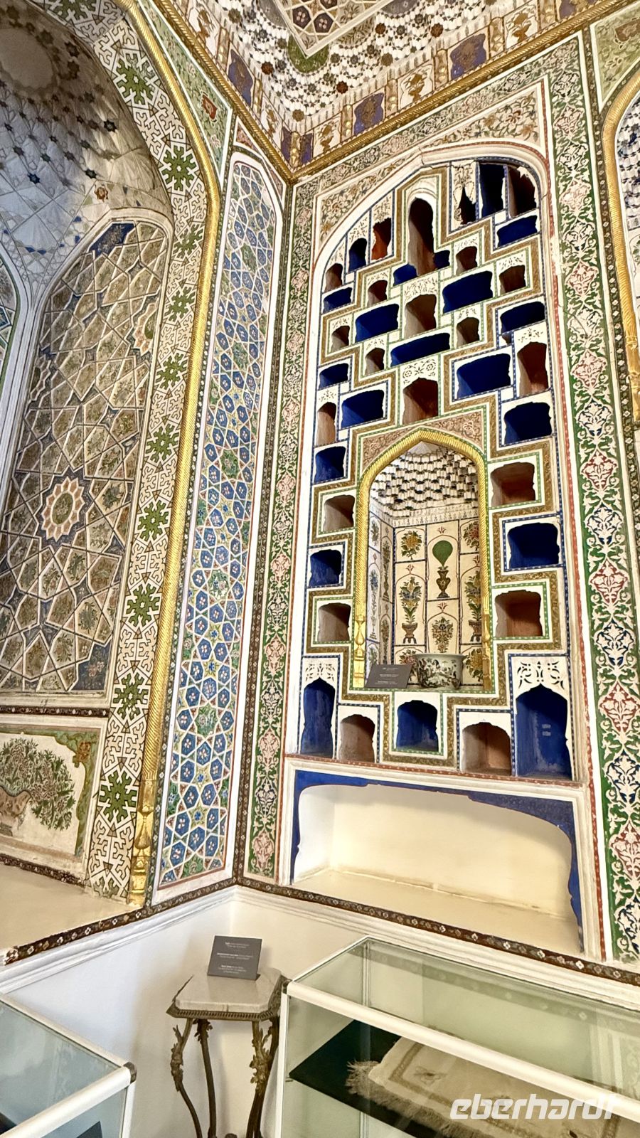 Anschließend besuchten wir den Sommerpalast Sitorai Mokhi Khosa, dessen Name übersetzt „Palast der Sterne und des Mondes“ bedeutet. Er wurde Anfang des 20. Jahrhunderts für den letzten Emir von Buchara, Said Alim Khan, erbaut. Der Palast vereint auf faszinierende Weise orientalische Ornamentik mit europäischen Einflüssen – ein Ergebnis der engen kulturellen Kontakte zur damaligen Zeit. Besonders beeindruckend sind die reich verzierten Empfangsräume mit venezianischen Spiegeln, feinem Stuck, bunten Glasfenstern und kunstvollen Holzschnitzereien. Heute beherbergt der Palast ein Museum für angewandte Kunst, in dem kostbare Stoffe, Schmuckstücke und traditionelle Trachten ausgestellt sind.
