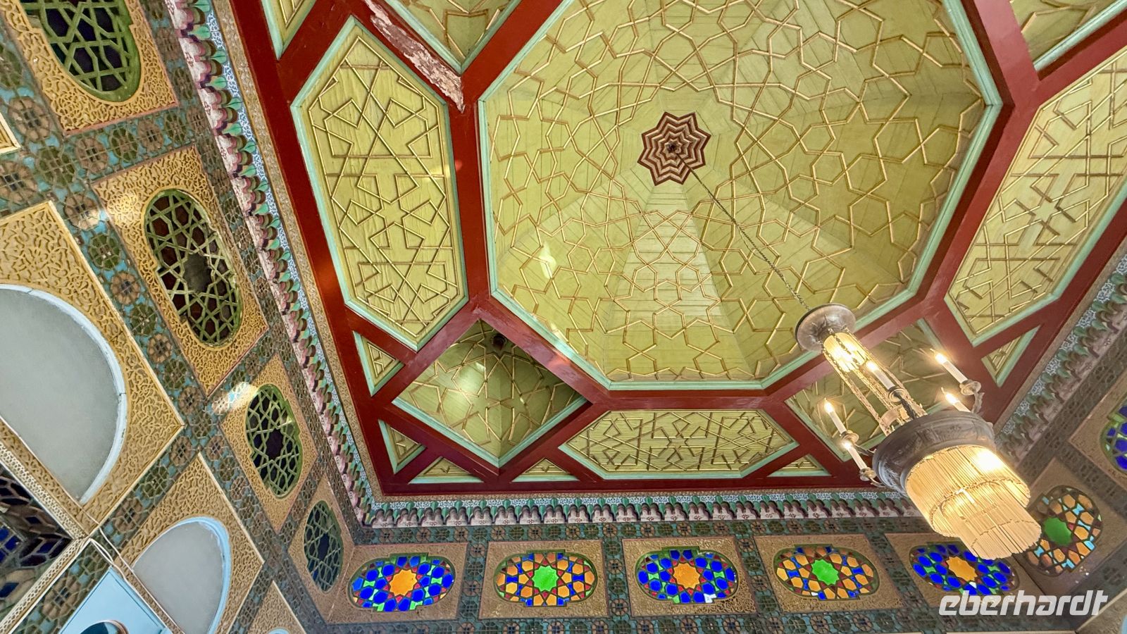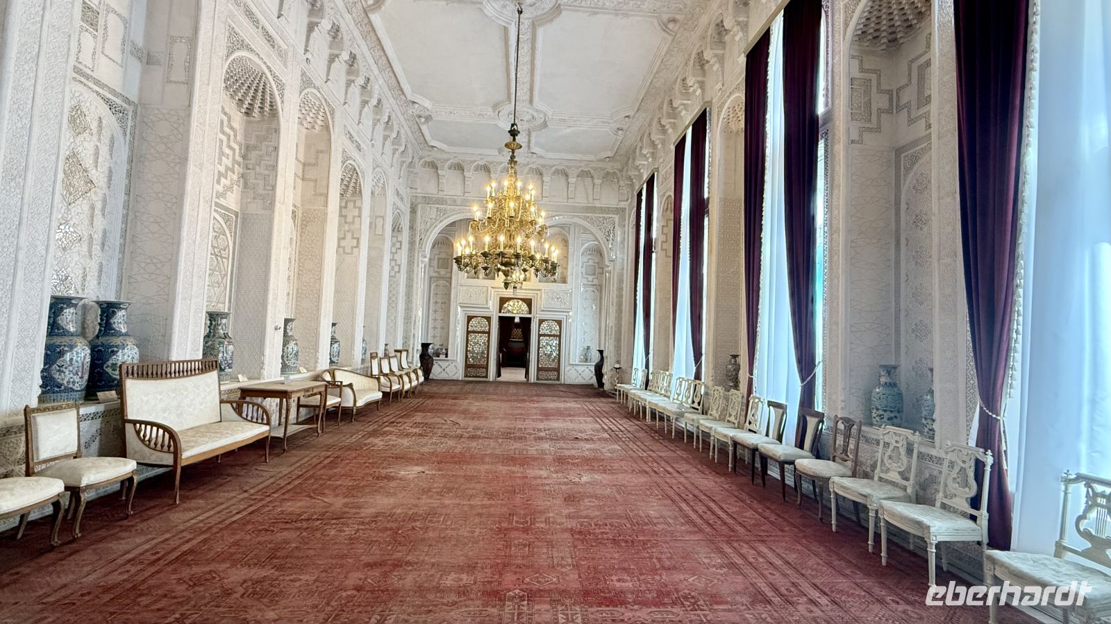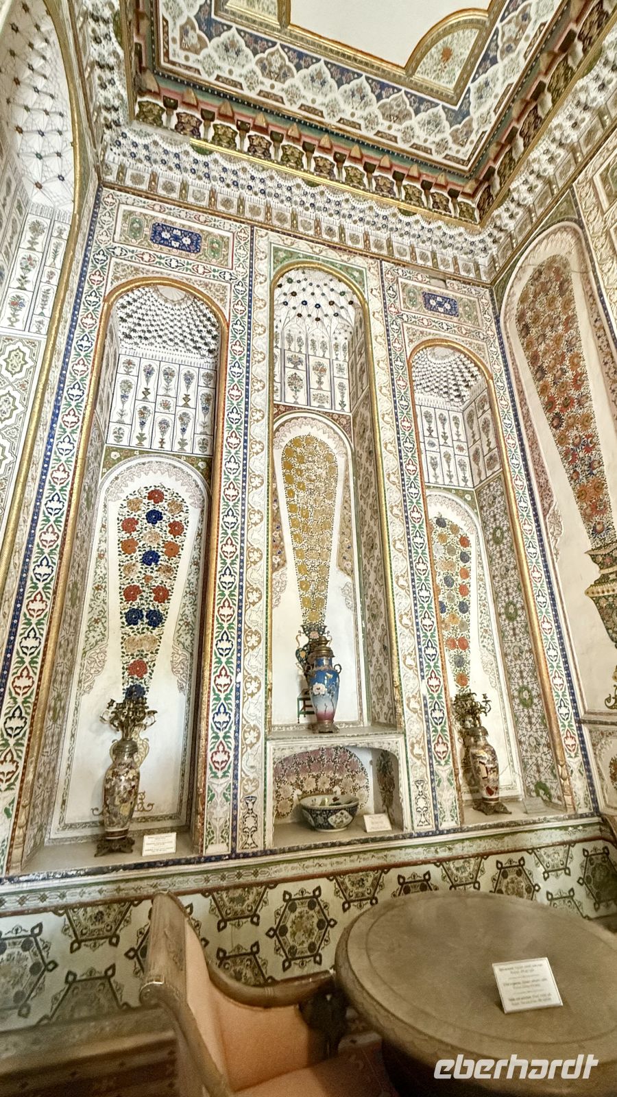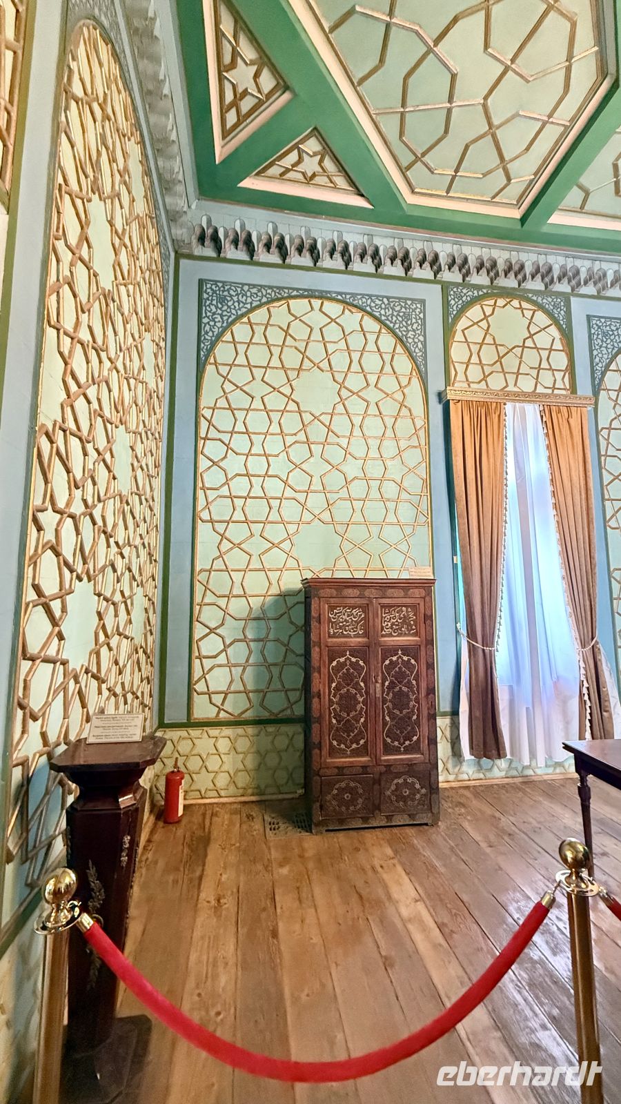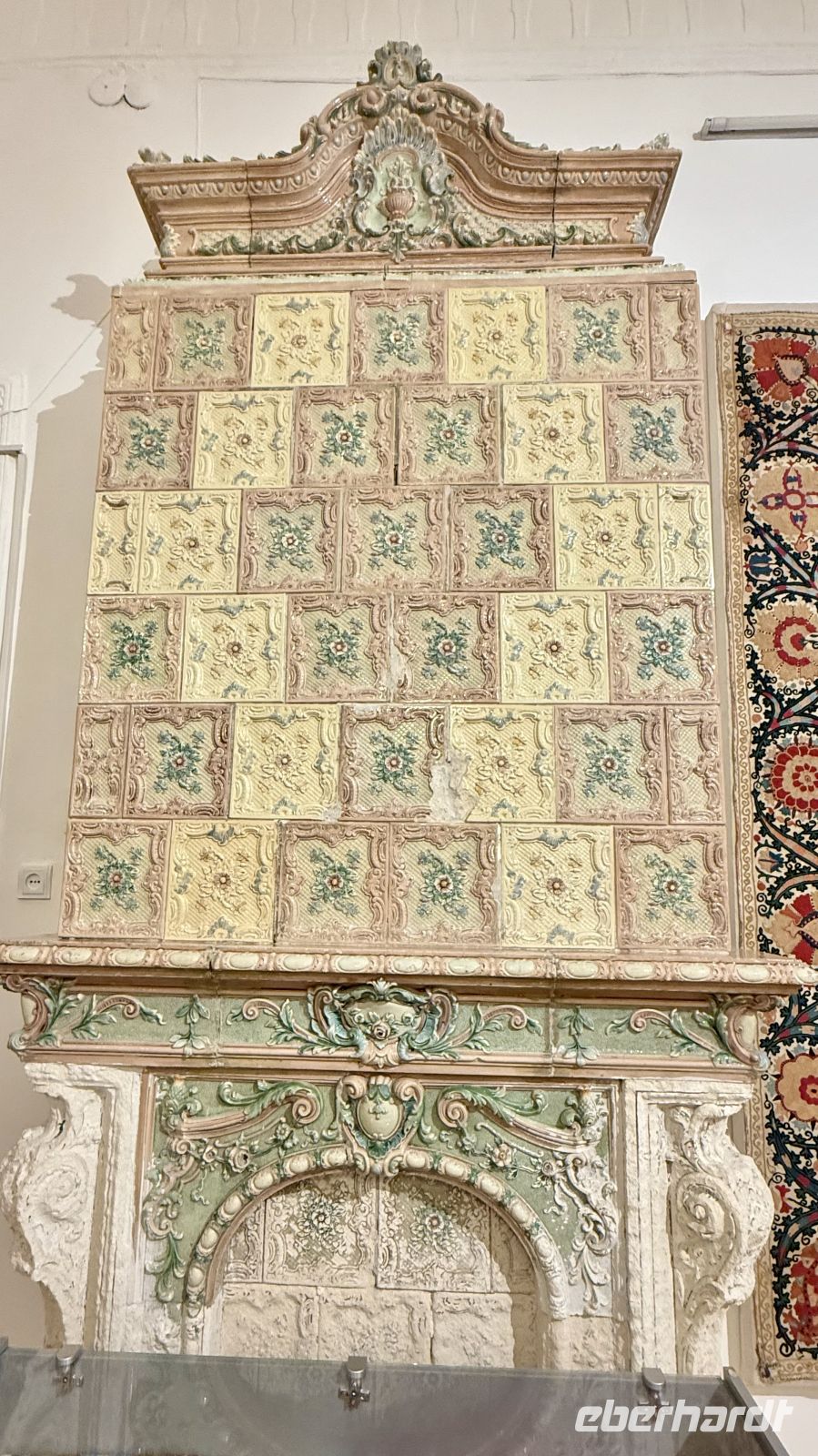 Anschließend besuchten wir den Sommerpalast Sitorai Mokhi Khosa, dessen Name übersetzt „Palast der Sterne und des Mondes“ bedeutet. Er wurde Anfang des 20. Jahrhunderts für den letzten Emir von Buchara, Said Alim Khan, erbaut. Der Palast vereint auf faszinierende Weise orientalische Ornamentik mit europäischen Einflüssen – ein Ergebnis der engen kulturellen Kontakte zur damaligen Zeit. Besonders beeindruckend sind die reich verzierten Empfangsräume mit venezianischen Spiegeln, feinem Stuck, bunten Glasfenstern und kunstvollen Holzschnitzereien. Heute beherbergt der Palast ein Museum für angewandte Kunst, in dem kostbare Stoffe, Schmuckstücke und traditionelle Trachten ausgestellt sind.