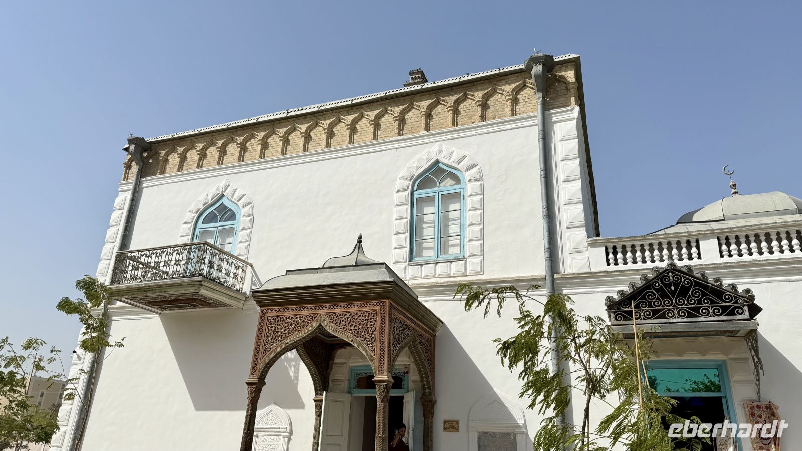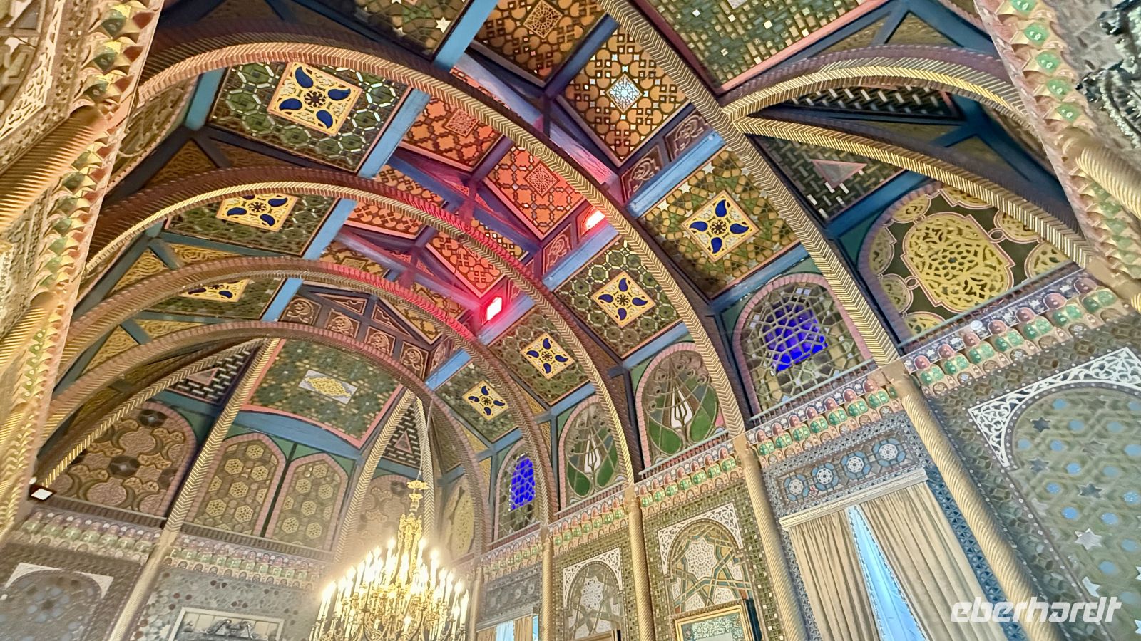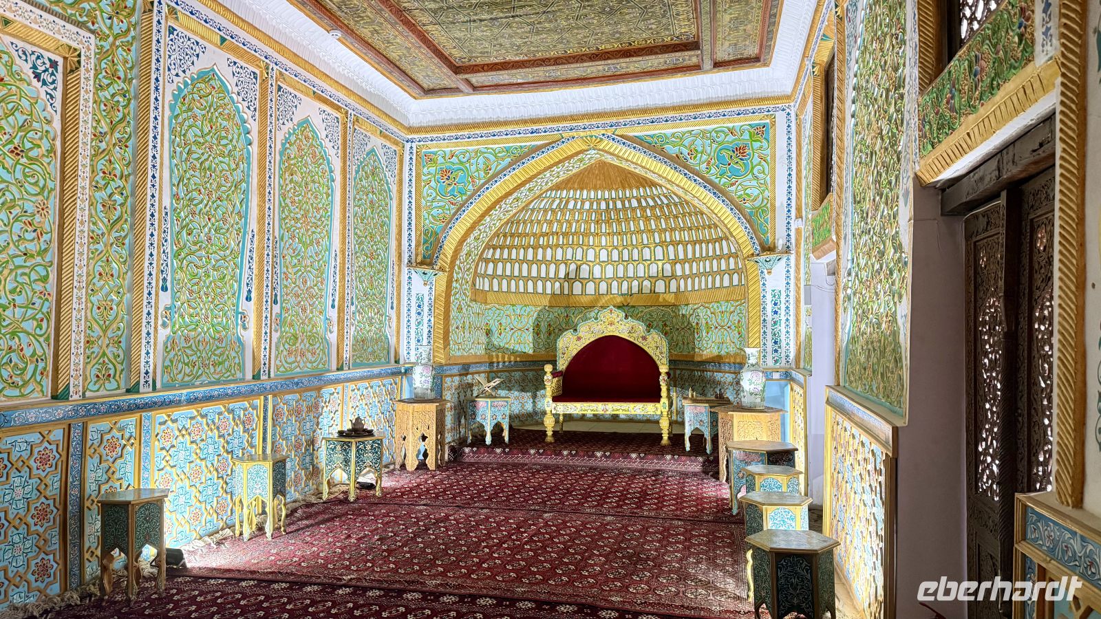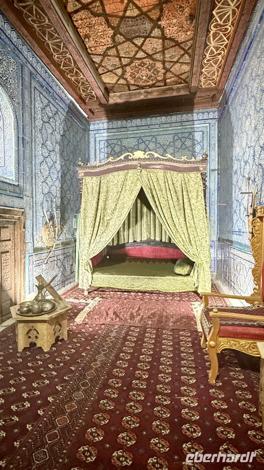 Anschließend besuchten wir den Sommerpalast Sitorai Mokhi Khosa, dessen Name übersetzt „Palast der Sterne und des Mondes“ bedeutet. Er wurde Anfang des 20. Jahrhunderts für den letzten Emir von Buchara, Said Alim Khan, erbaut. Der Palast vereint auf faszinierende Weise orientalische Ornamentik mit europäischen Einflüssen – ein Ergebnis der engen kulturellen Kontakte zur damaligen Zeit. Besonders beeindruckend sind die reich verzierten Empfangsräume mit venezianischen Spiegeln, feinem Stuck, bunten Glasfenstern und kunstvollen Holzschnitzereien. Heute beherbergt der Palast ein Museum für angewandte Kunst, in dem kostbare Stoffe, Schmuckstücke und traditionelle Trachten ausgestellt sind.