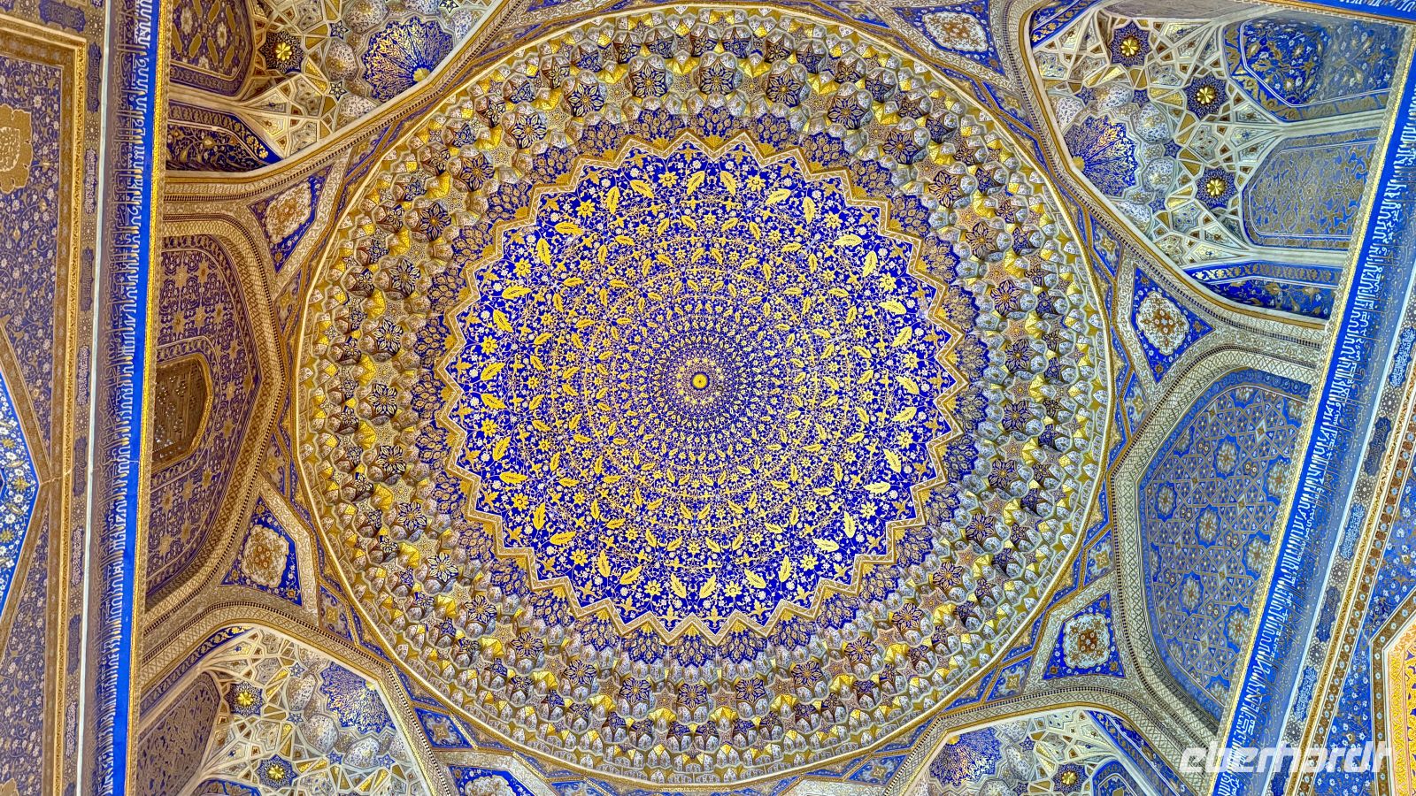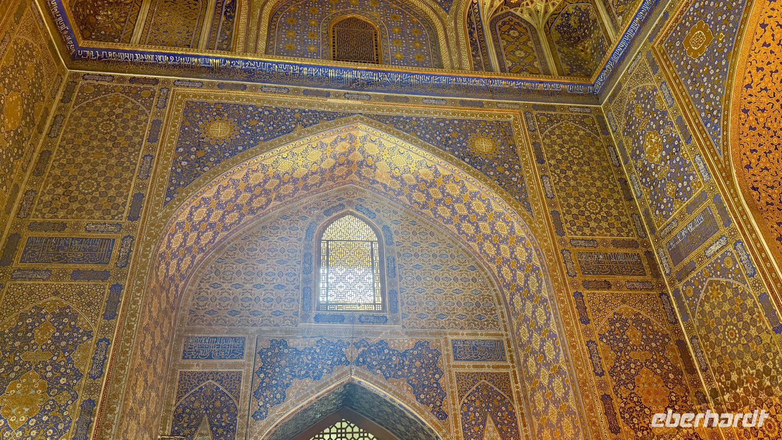 Anschließend setzten wir unsere Stadtbesichtigung auf dem weltberühmten Registan-Platz fort – dem Herzstück Samarkands und wohl einem der schönsten Plätze der islamischen Welt. Hier bewunderten wir die drei prachtvollen Medresen Ulug Beg, Shir Dor und Tilya-Kori. Die Ulug-Beg-Medrese wurde im 15. Jahrhundert von Timurs Enkel, dem Gelehrten und Astronomen Ulug Beg, errichtet und diente als bedeutendes Wissenschaftszentrum. Die Shir-Dor-Medrese aus dem 17. Jahrhundert beeindruckt durch ihre Fassade mit den berühmten Löwen- und Sonnensymbolen – eine Seltenheit in der islamischen Architektur. Die Tilya-Kori-Medrese („die Goldverzierte“) schließlich beherbergt eine prächtige Moschee, deren Innenraum mit feinem Blattgold überzogen ist und im Sonnenlicht golden schimmert.