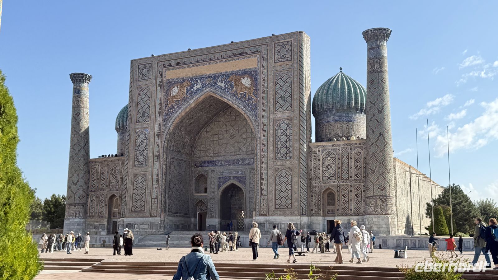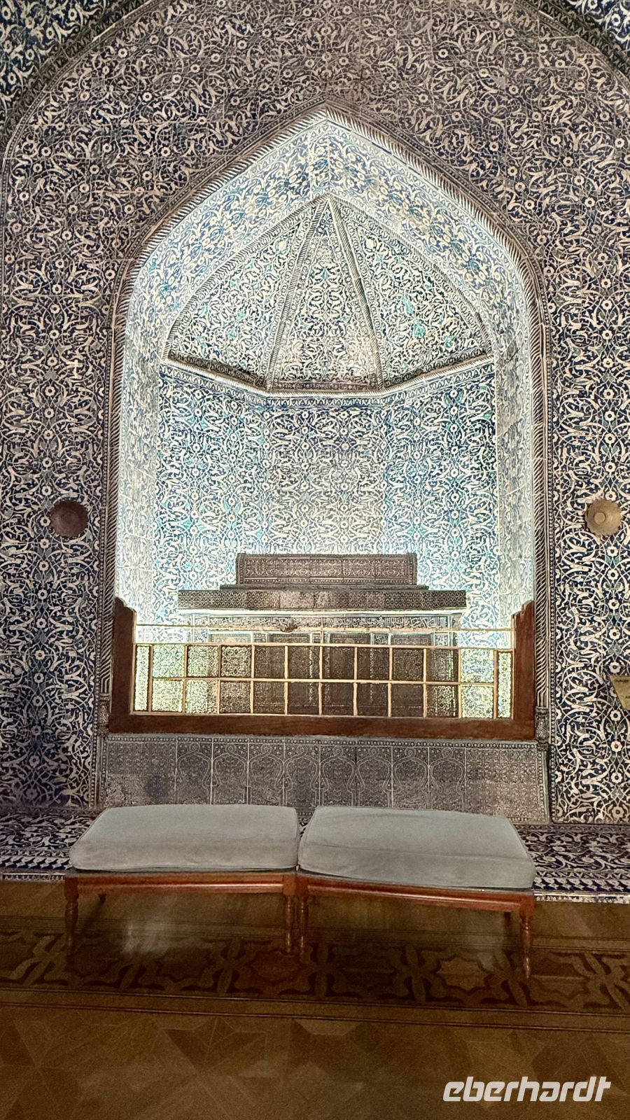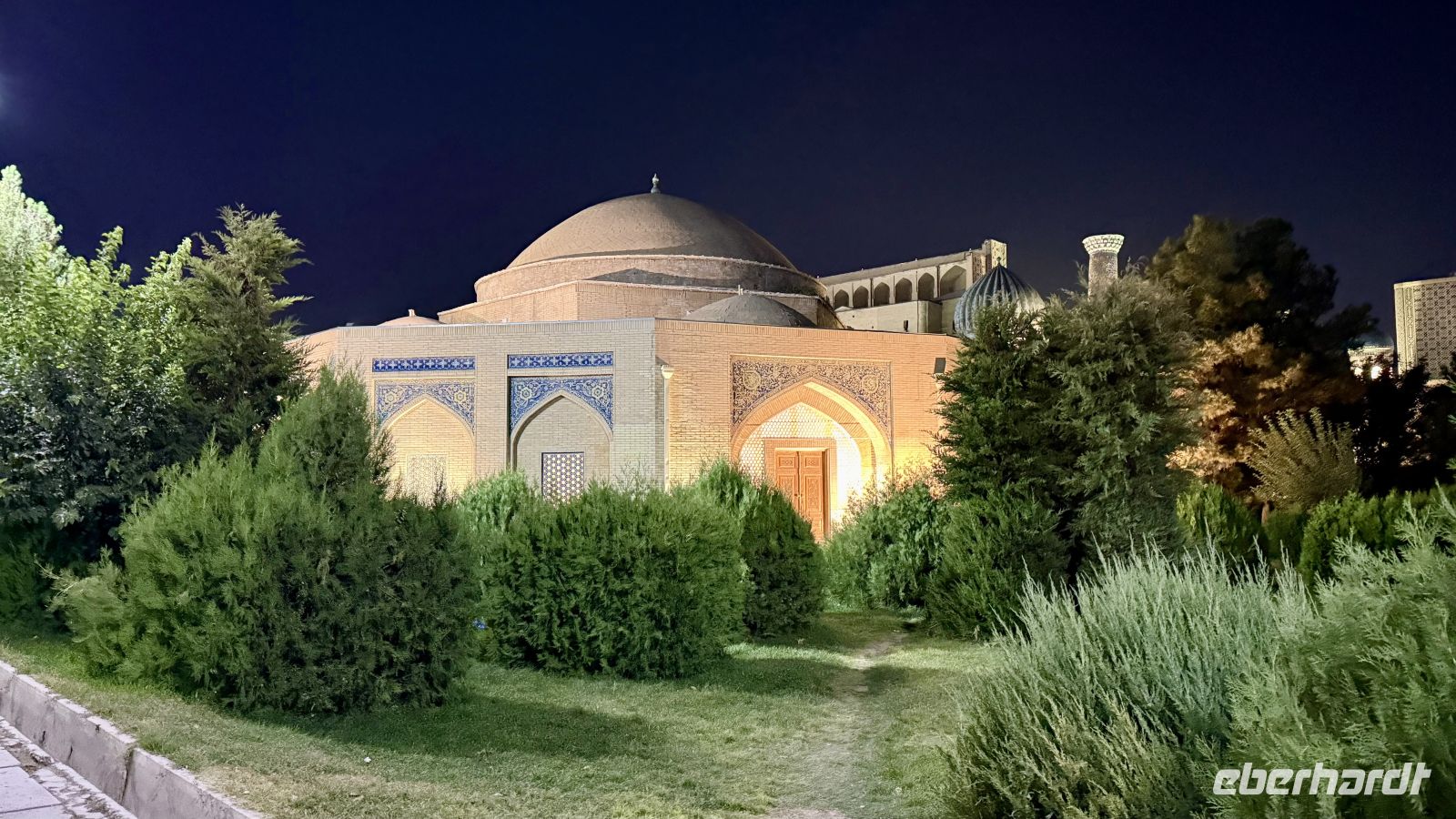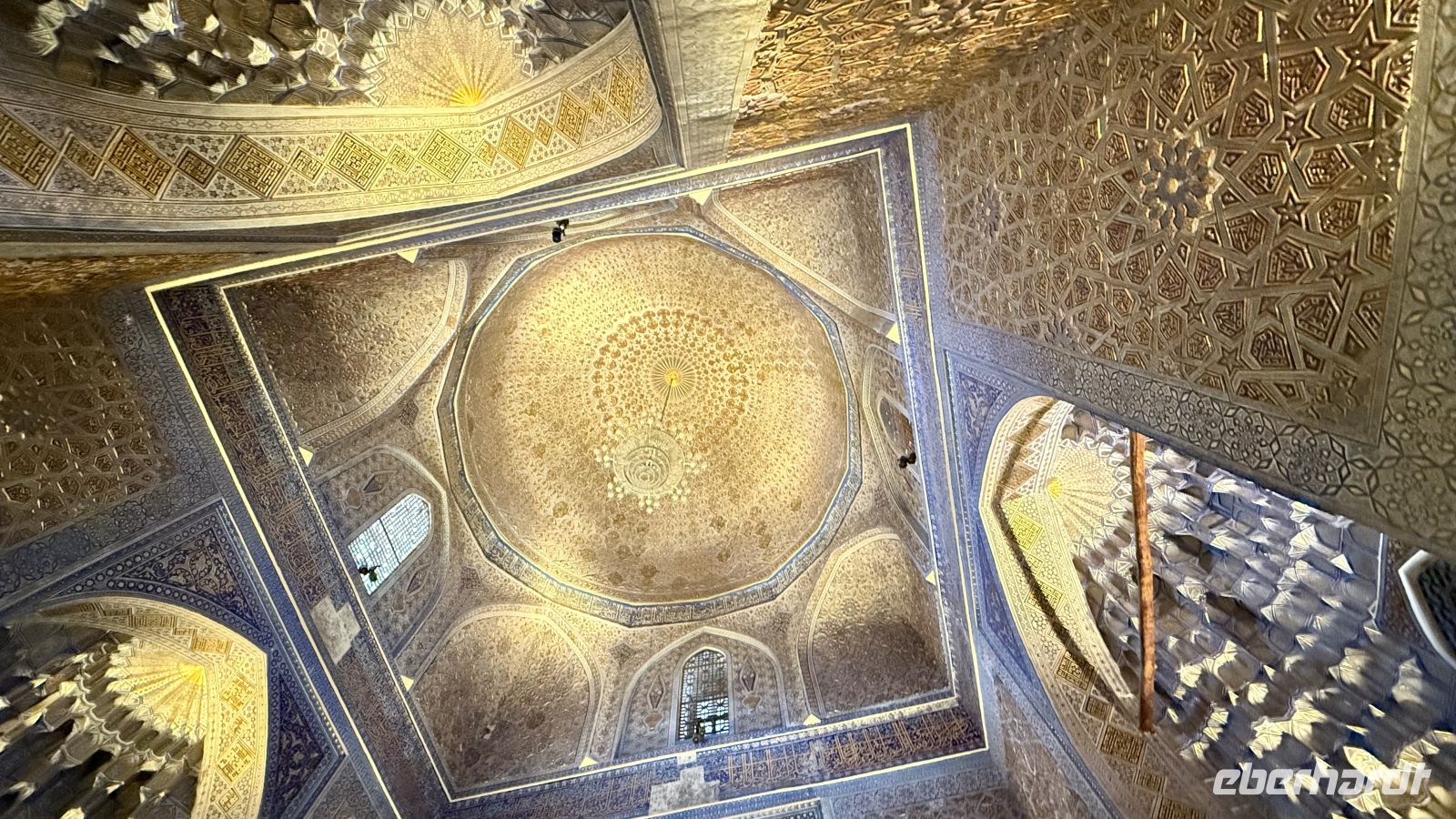 Unser erster Programmpunkt war der Besuch des Mausoleumskomplexes Gur-Emir, der als letzte Ruhestätte Timurs und seiner Nachkommen dient. Das prachtvolle Bauwerk mit seiner türkisblauen Kuppel gilt als eines der schönsten Beispiele timuridischer Architektur. Besonders beeindruckend sind die feinen Stuckarbeiten, Marmorverzierungen und goldenen Ornamente im Inneren. Da wir früh am Morgen dort waren, konnten wir die majestätische Stille dieses Ortes ganz für uns genießen – ein unvergesslicher Moment.