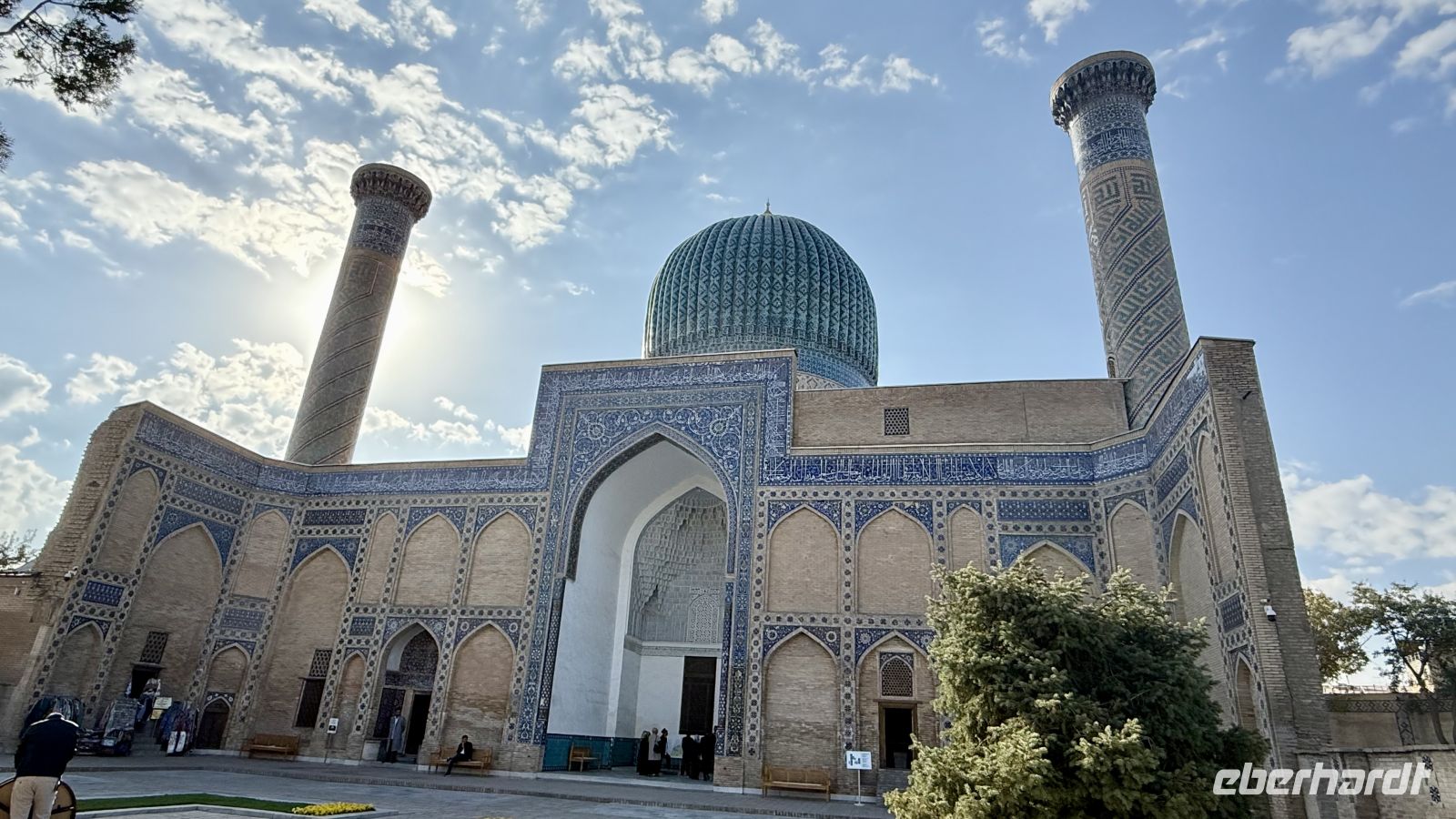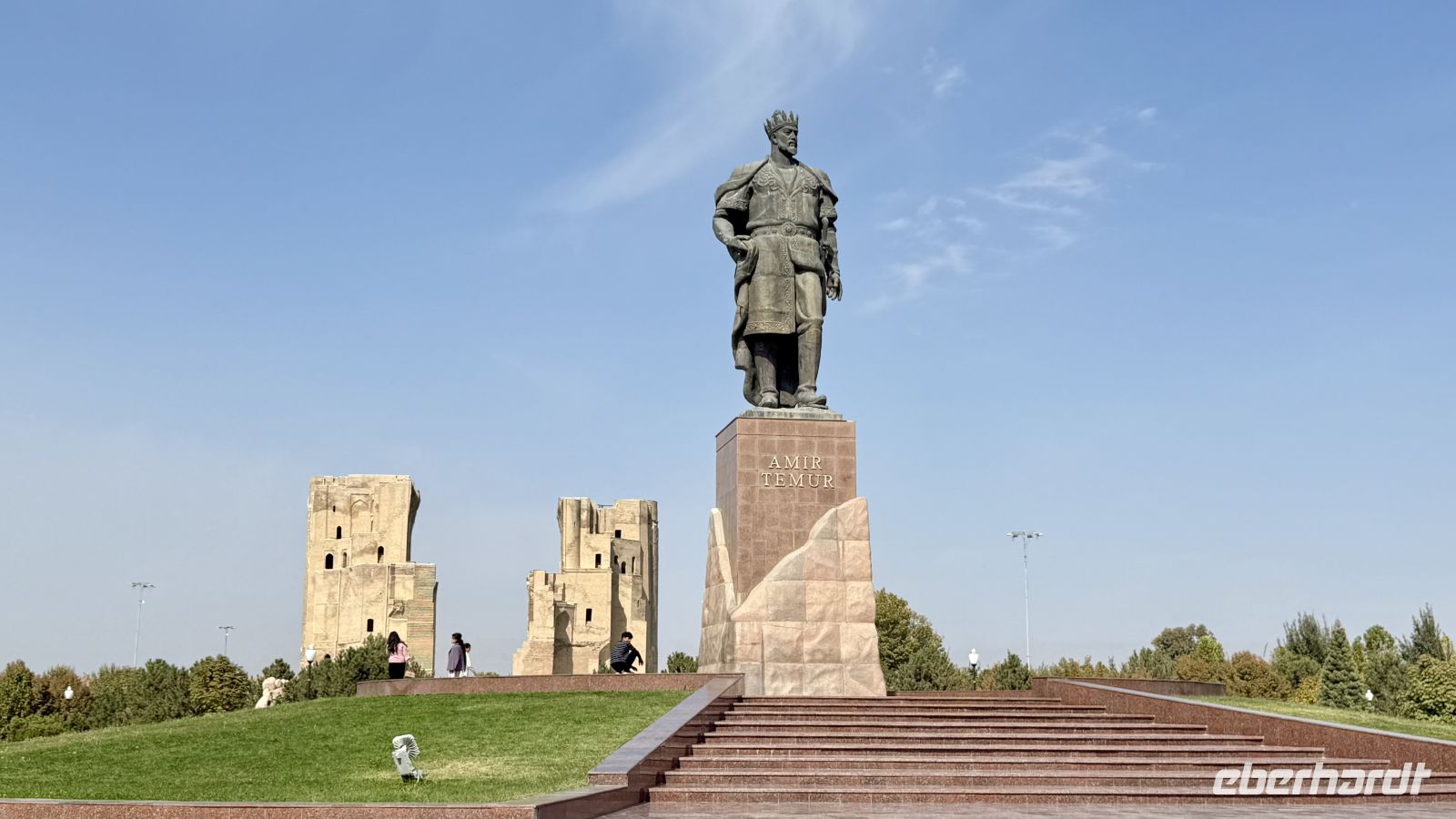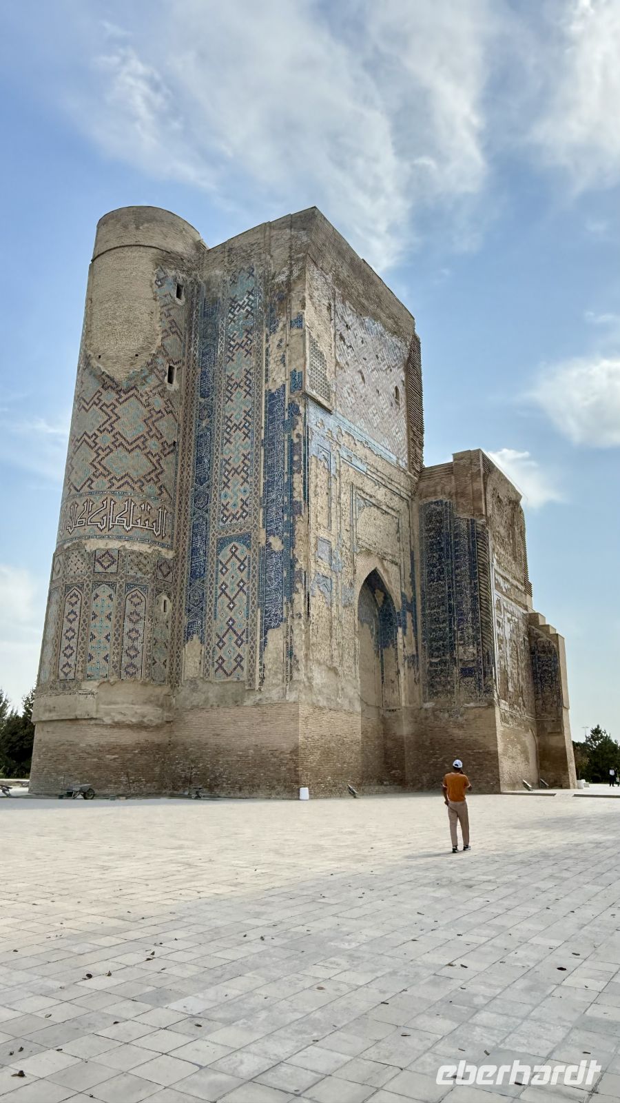 Heute begrüßten wir unseren neuen Reiseleiter Islom. Die Karawane zog weiter und wir ließen Buchara hinter uns. Zunächst fuhren wir mit dem Bus nach Shahrisabz, der Geburtsstadt von Timur (Tamerlan), die mit mehreren Timuridischen Monumenten, historischen Moscheen und mit dem großen Ak-Saray-Palast beeindruckt. Timur Lenk, auch bekannt als Tamerlan (1336–1405), war einer der bedeutendsten Eroberer und Herrscher der islamischen Welt im späten Mittelalter. Er wurde 1336 in der Nähe der heutigen Stadt Shahrisabz im Süden Usbekistans geboren und stammte aus einem turko-mongolischen Adelsgeschlecht, das sich auf Dschingis Khan zurückführte, ohne jedoch direkt von ihm abzustammen. Der Beiname „Lenk“ bedeutet „der Lahme“, da Timur im jungen Alter durch eine Verletzung an Bein und Arm dauerhaft gehbehindert blieb – ein körperliches Handicap, das ihn jedoch nie davon abhielt, zu einem der mächtigsten Männer seiner Zeit zu werden.