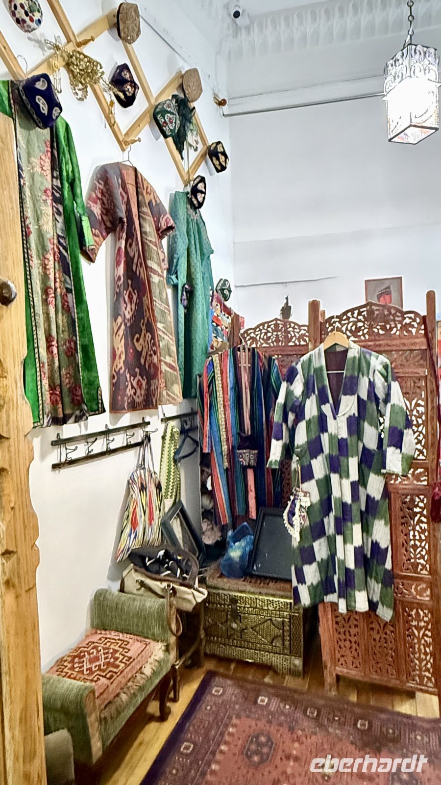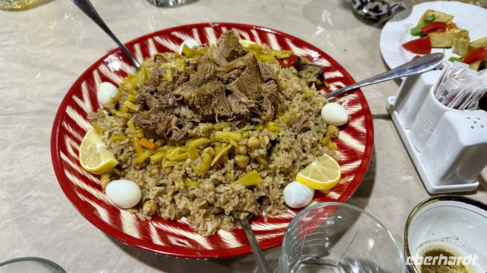 Schließlich erreichten wir unser Hotel. Am Abend besuchten wir die Designerin Elena, die uns in ihrem Atelier kreative und außergewöhnliche Mode-Stücke präsentierte – getragen von Stoffkunst, lokalen Mustern und individueller Handschrift. Danach freuten wir uns auf ein leckeres Abendessen, bei dem wir das usbekische Nationalgericht Plov serviert bekamen – ein aromatisches Reisgericht mit Fleisch, Karotten, Zwiebeln und Gewürzen, das in Usbekistan zu jeder wichtigen Zusammenkunft gehört.