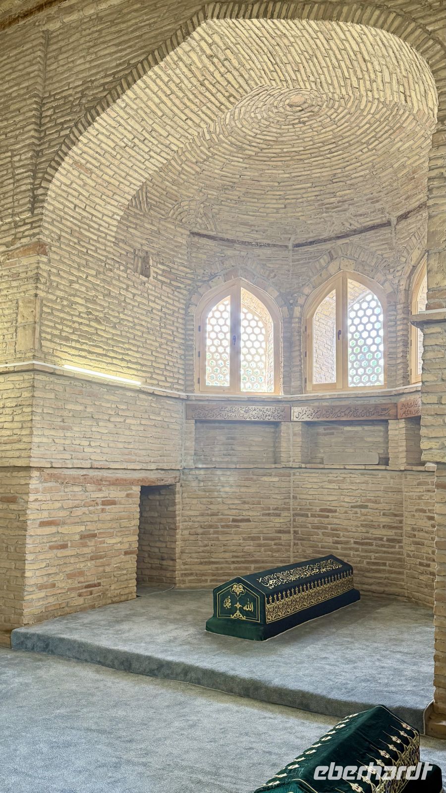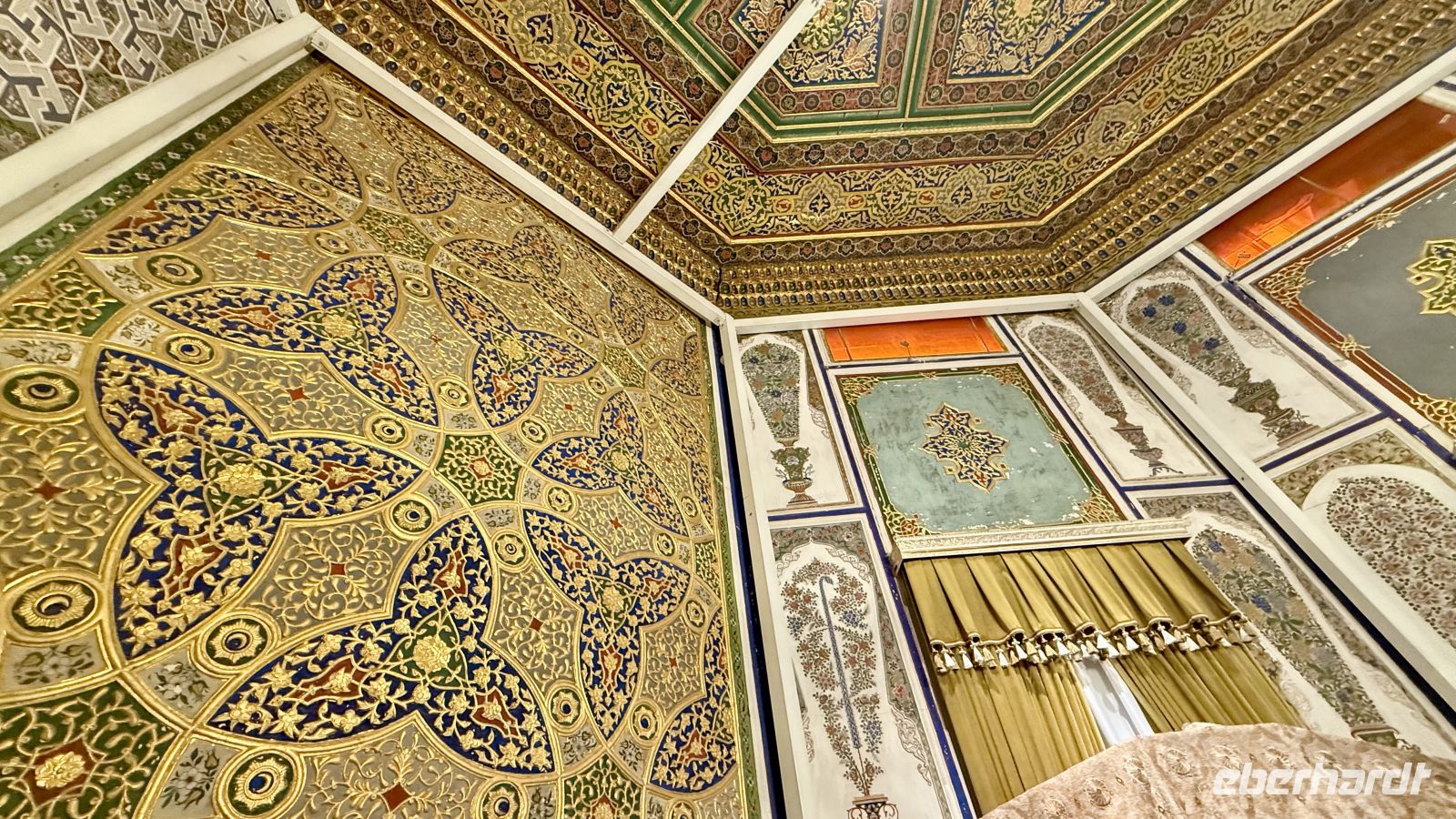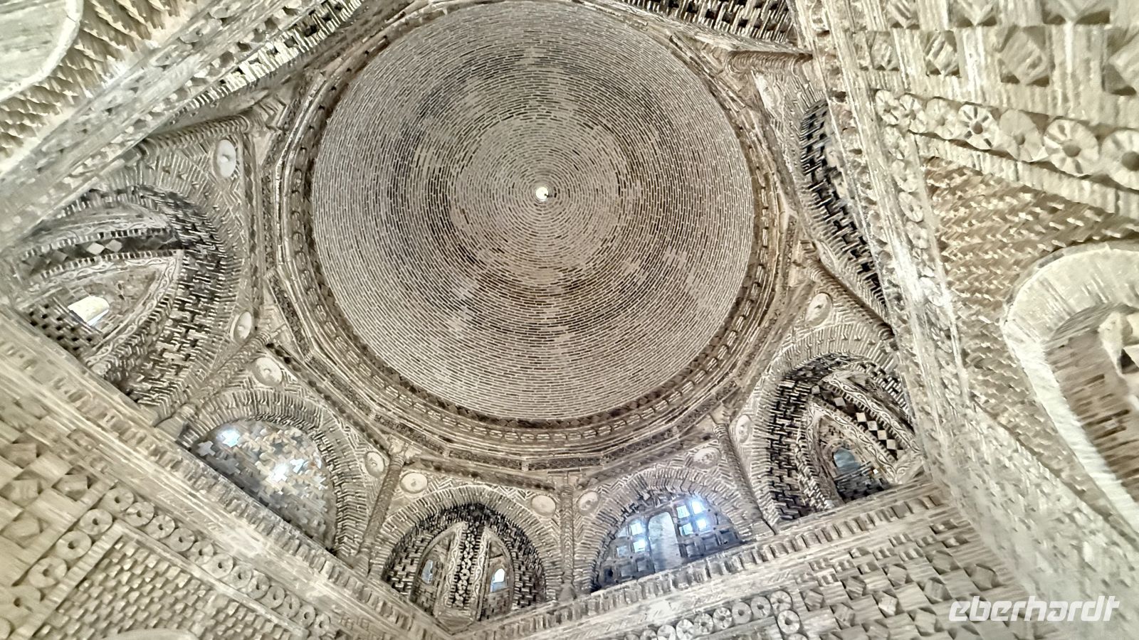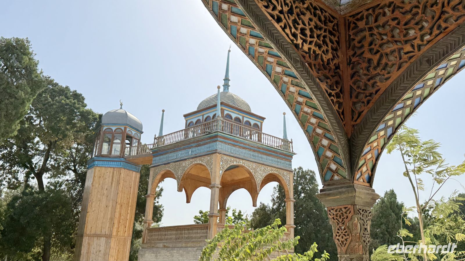 Unser drittes Ziel war das Chor-Bakr-Mausoleum, auch „Stadt der Toten“ genannt. Die Nekropole stammt aus dem 16. Jahrhundert und wurde zur Ehren von Abu Bakr Saad und seinem Bruder Abu Bakr Ahmad errichtet, Nachfahren des Propheten Mohammed. Der weitläufige Komplex besteht aus mehreren Moscheen, Medresen und Grabstätten, die um malerische Innenhöfe gruppiert sind. Zwischen den alten Mauern und schattigen Bäumen herrscht eine fast mystische Ruhe – ein Ort, der zum Nachdenken und Innehalten einlädt.