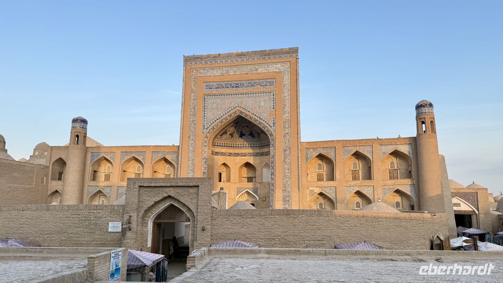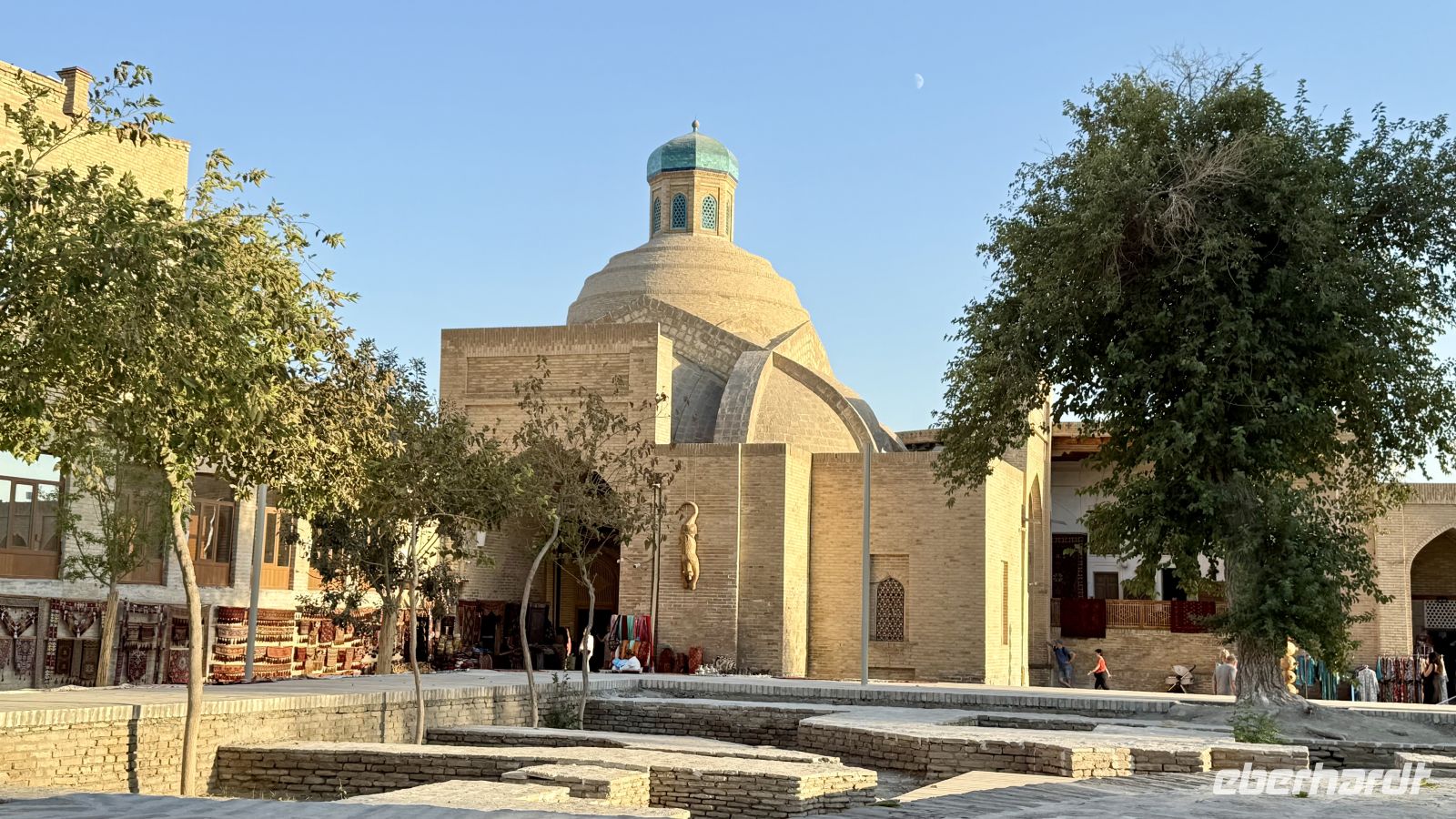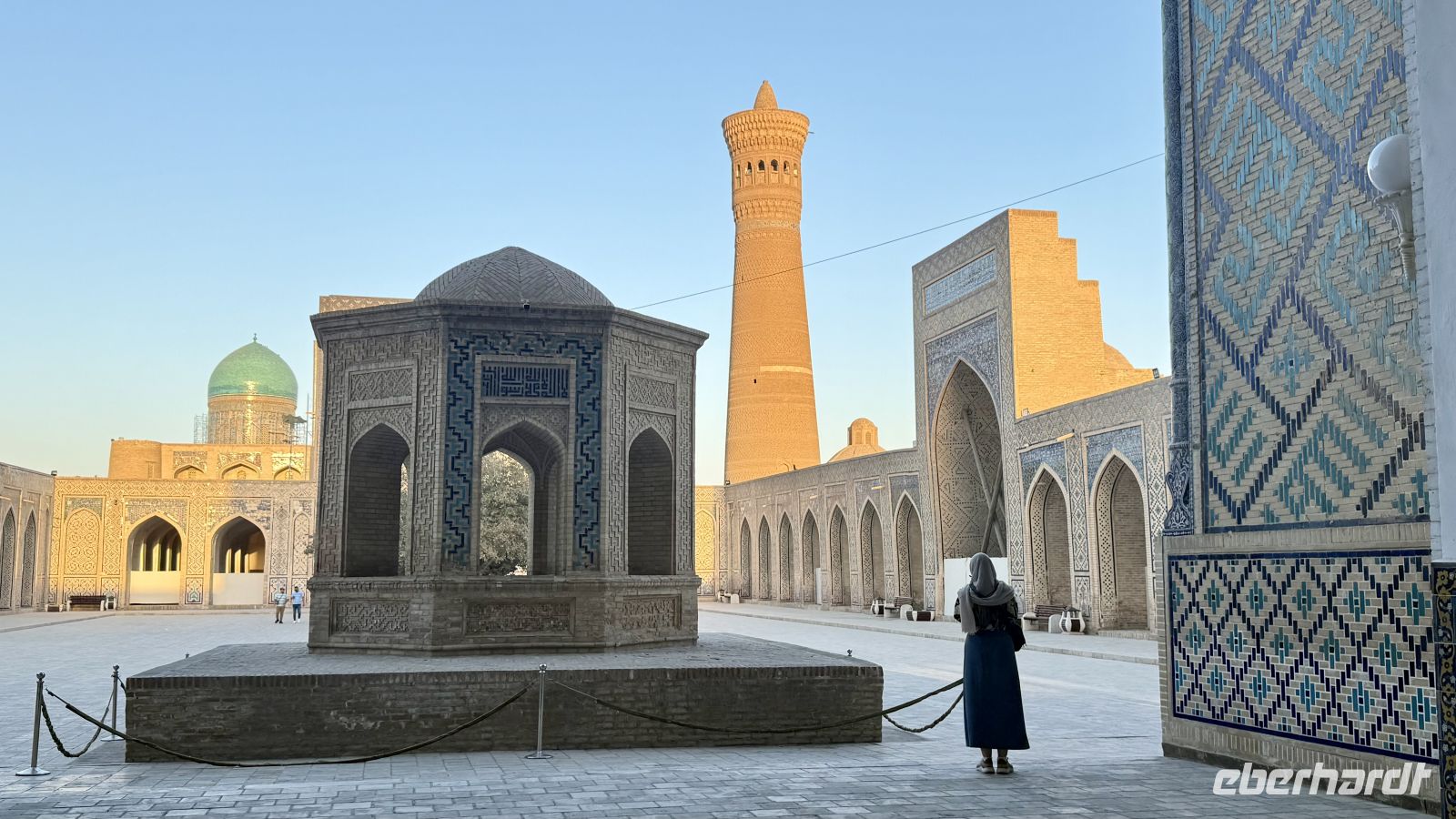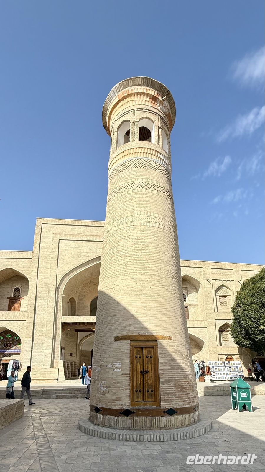 Anschließend besuchten wir die Kalyan-Moschee mit ihrem imposanten Kalyan-Minarett, das rund 46 Meter hoch in den Himmel ragt. Das Minarett stammt aus dem Jahr 1127 und wurde aufgrund seiner Schönheit und Stabilität nie zerstört – selbst Dschingis Khan verschonte es, als er die Stadt einnahm. Die Moschee selbst bietet Platz für bis zu 10.000 Gläubige und ist ein bedeutendes Zentrum des religiösen Lebens in Buchara.