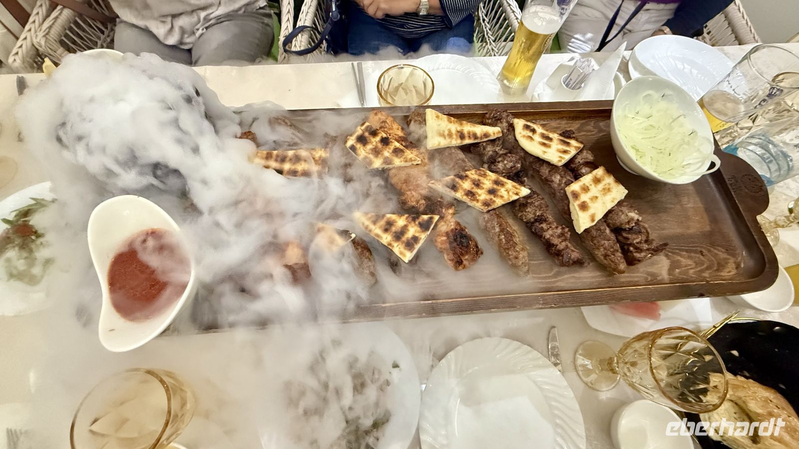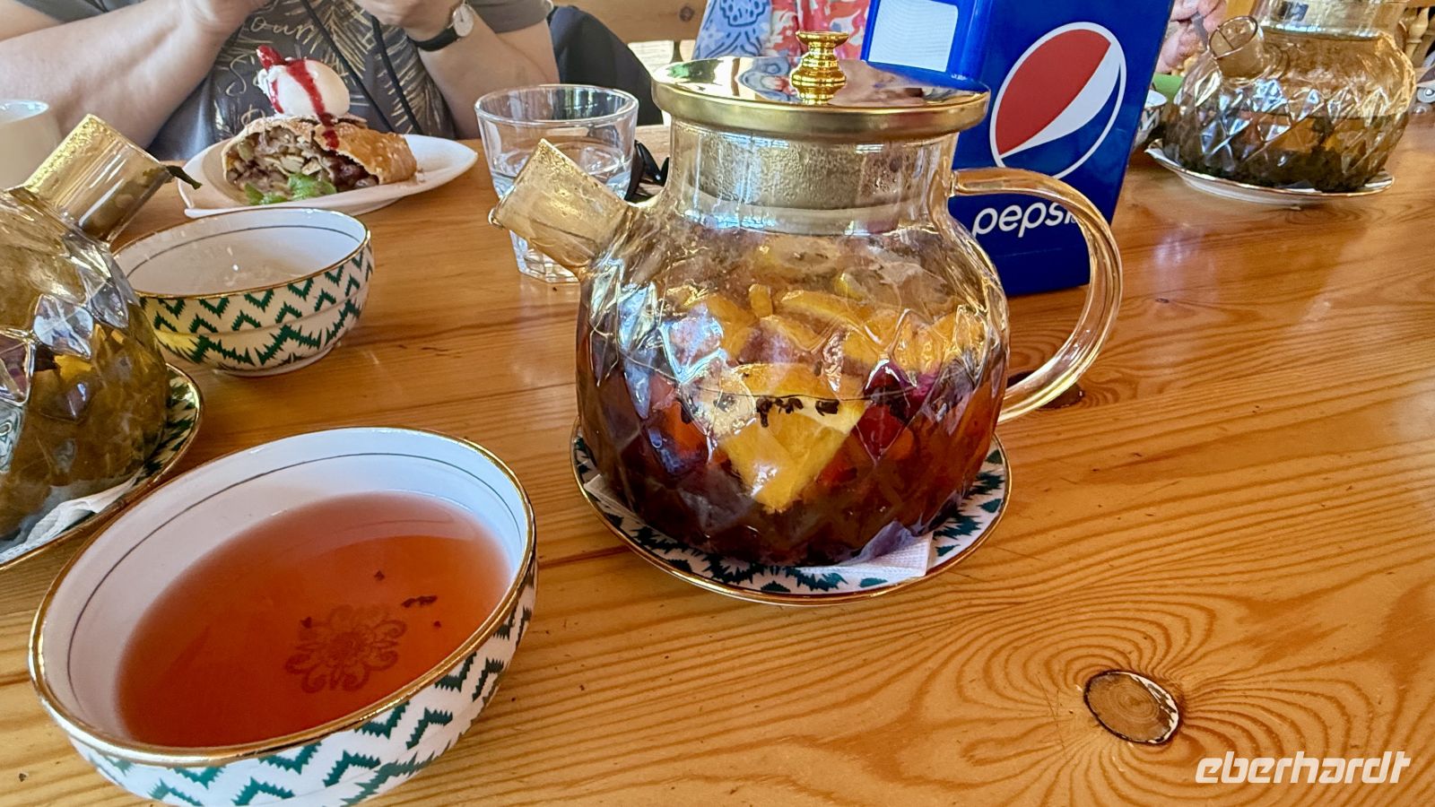 Zum Abschluss des Abends genossen wir ein köstliches Abendessen. Bei Tee und angeregten Gesprächen ließen wir den ereignisreichen Tag ausklingen. Zurück im Hotel verabschiedeten wir uns herzlich von unserem Reiseleiter Alibek, der uns mit seinem Wissen, Humor und seiner Gastfreundschaft während der gesamten Reise begleitet hatte.