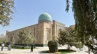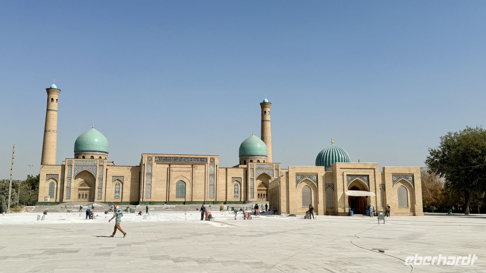Noch etwas verschlafen erreichten wir am Morgen Taschkent, die Hauptstadt Usbekistans. Der Flughafen liegt etwa 13 km vom Stadtzentrum entfernt, und direkt nach der Landung fuhren wir mit dem Bus in die Stadt. Dann fuhren wir zum Hotel und checkten ein. Taschkent, die Hauptstadt Usbekistans, ist mit über drei Millionen Einwohnern die größte Stadt Zentralasiens und das politische, wirtschaftliche und kulturelle Zentrum des Landes. Die Stadt verbindet auf faszinierende Weise Tradition und Moderne: Neben breiten Boulevards, modernen Hochhäusern und eleganten Parks finden sich zahlreiche historische Bauwerke, Moscheen und Medresen. Im Anschluss hatten wir Zeit zum Frühstücken. Gegen Mittag machten wir uns auf den Weg, die Stadt zu besichtigen. Zunächst schauten wir uns das Erdbebendenkmal (Monument of Courage) an, das an das verheerende Erdbeben von 1966 erinnert, bei dem große Teile der Stadt zerstört wurden. Anschließend waren wir alle sehr beeindruckt von der Kukeldash-Medrese, einer mittelalterlichen islamischen Bildungseinrichtung (um 1570 errichtet), die eine traditionelle Architektur mit Innenhof und Studierendenzellen besitzt. Auch die Mui-Mubarak Bibliothek / Koranbibliothek innerhalb des Hazrati-Imam-Komplexes faszinierte uns: In ihr befindet sich unter anderem der sogenannte Uthman-Koran, eine der weltweit ältesten erhaltenen Koranhandschriften. Außerdem besichtigten wir noch das Kaffal-Shashi-Mausoleum, das dem islamischen Gelehrten Abu Bakr Kaffal ash-Shashi gewidmet ist.