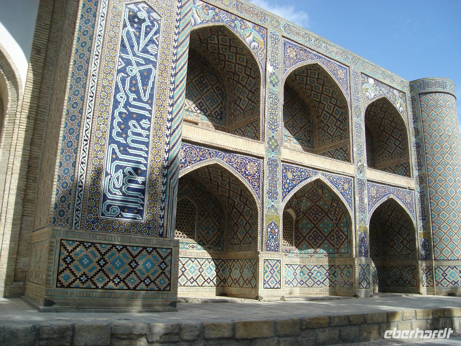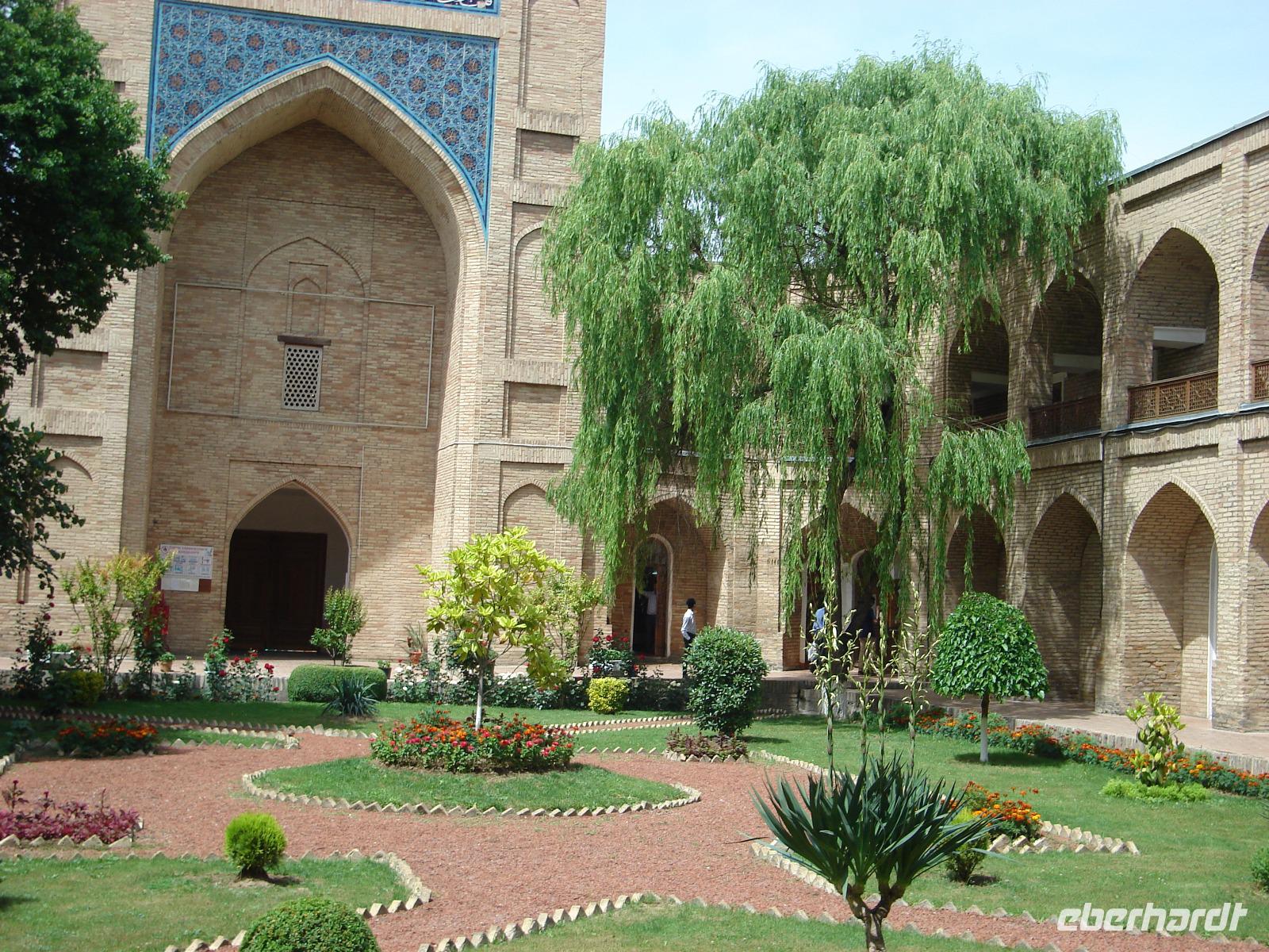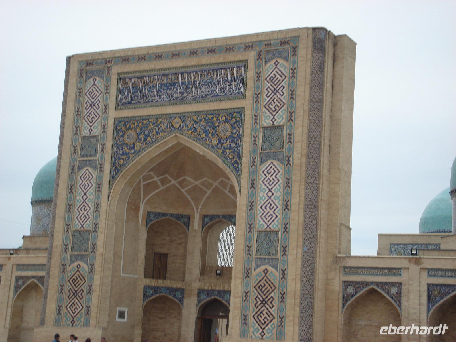 Natürlich zeigt uns Zika die historischen Gebäude, die uns besonders interessieren. Es sind vor allem die Zeugnisse aus orientalischer Zeit: das Kafali-Shash-Mausoleum, die Kukeldasch-Medrese und die berühmte Koran-Bibliothek. Und in einer traditionellen Bäckerei verkosten wir zwischendurch Brot. Es bleibt auch noch Zeit für einen Bummel durch die Markthalle. Eine Fahrt mit der einzigen U-Bahn Mittelasiens muss natürlich sein. Dort sehen wir ganz originelle Stationen. Aber in der Metro ist das Fotografieren verboten. Da kann man nichts machen. Wir prägen uns die Bilder ein.