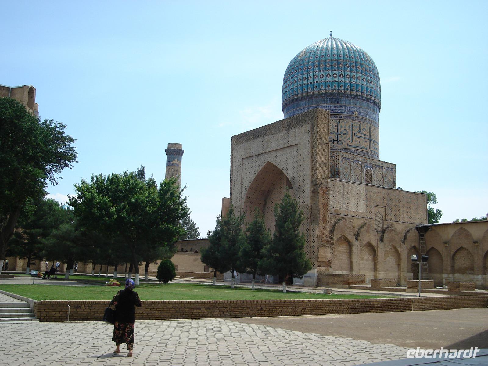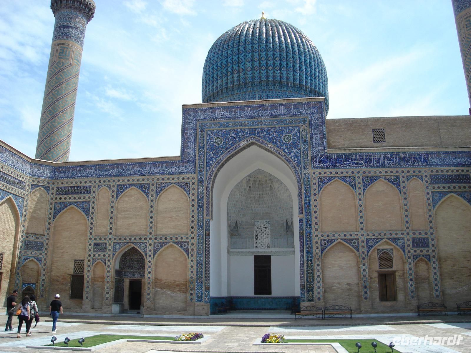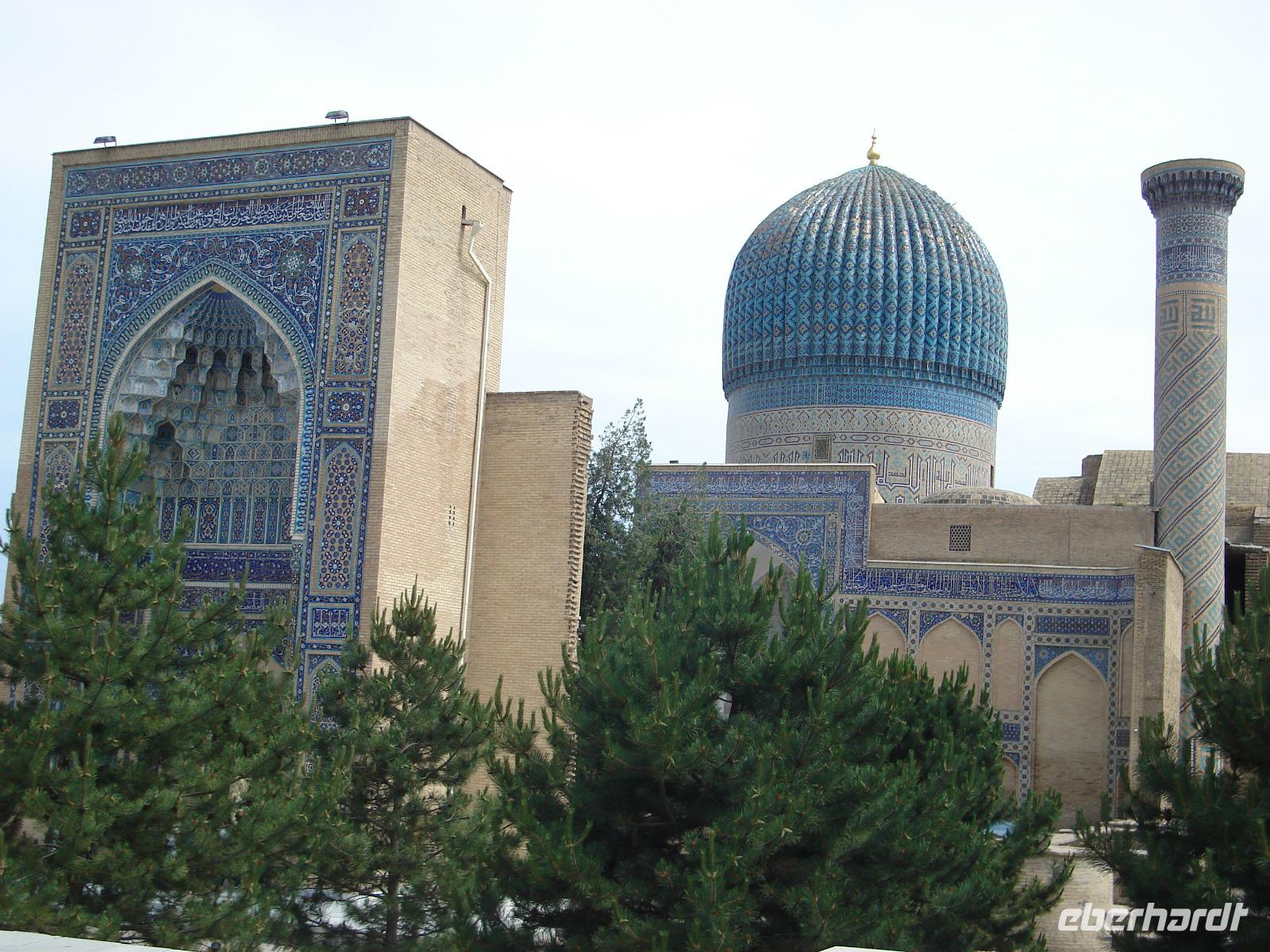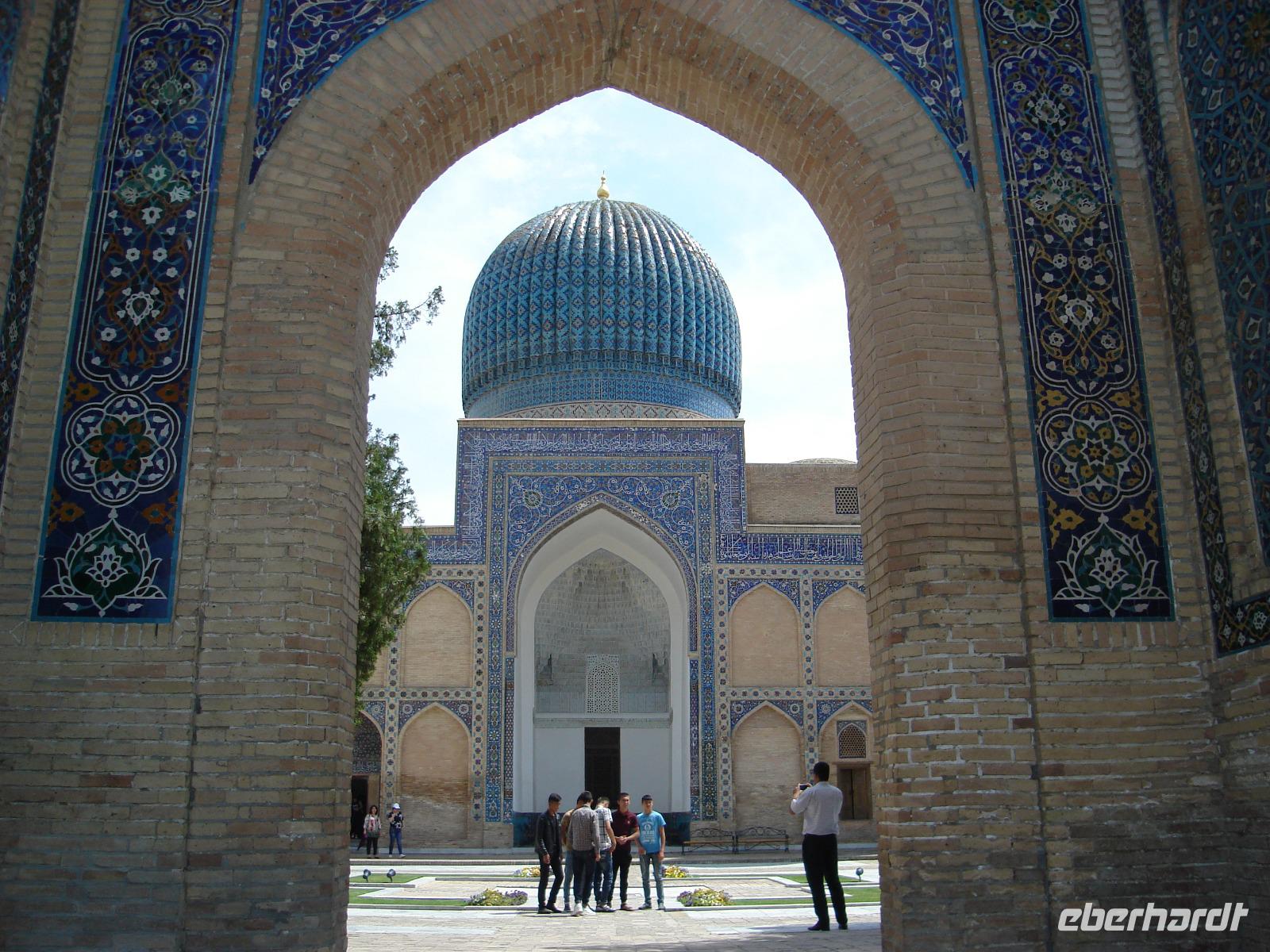 Danach fahren wir noch zum Mausoleumskomplex Gur-Emir mit dem Grab des berühmten Timur Lenk, über den wir inzwischen schon allerhand gehört haben. In der Stadt haben wir sein monumentales Denkmal gesehen.