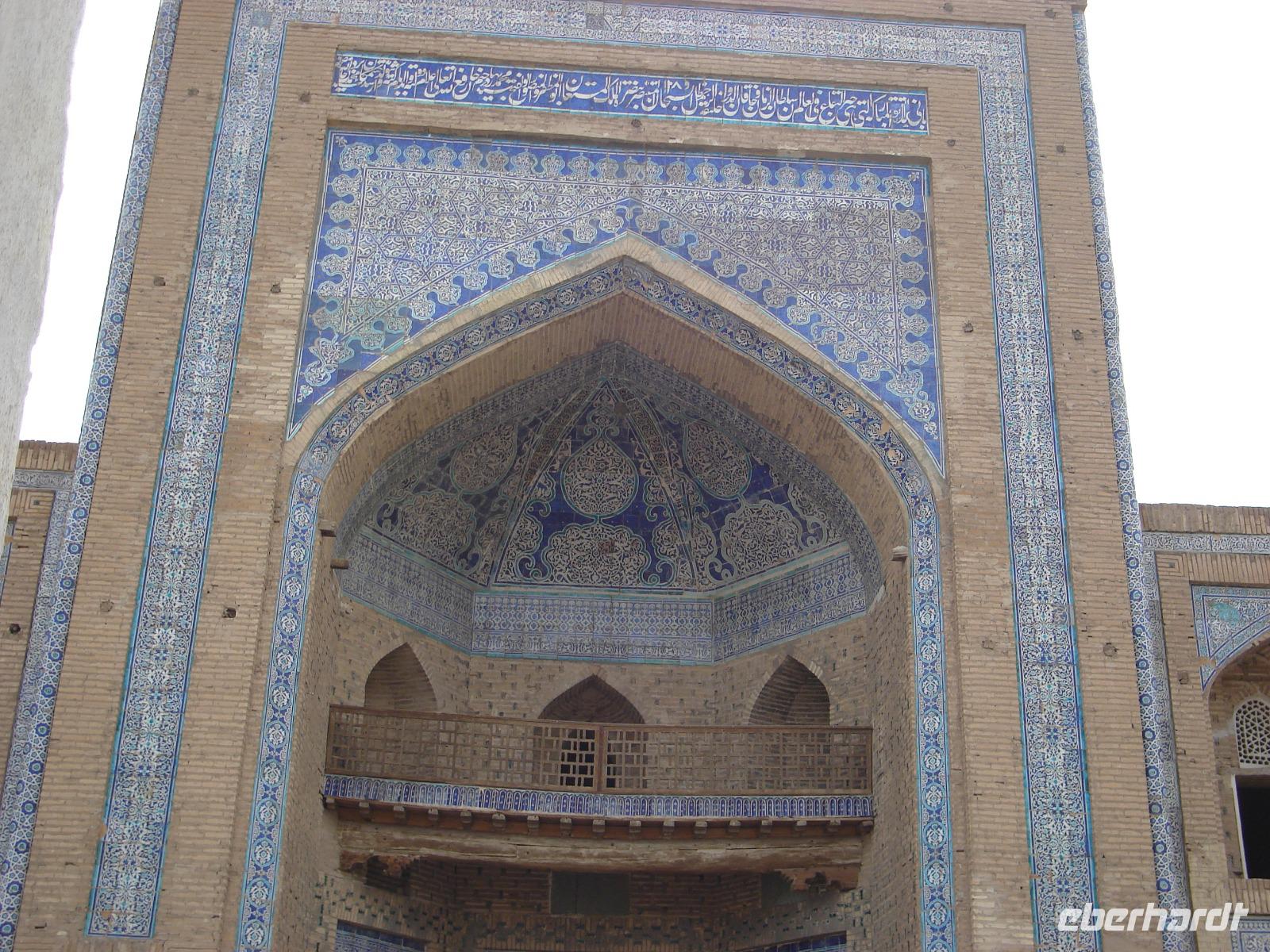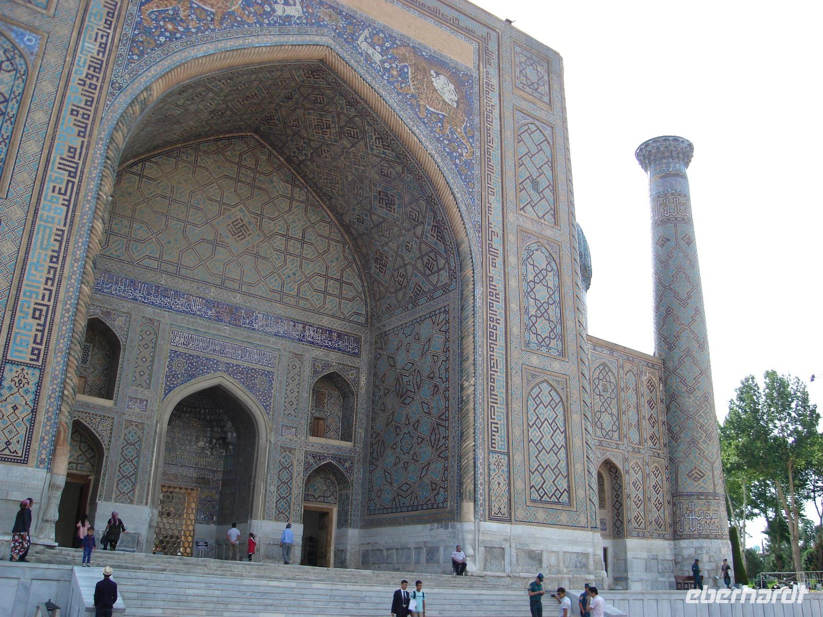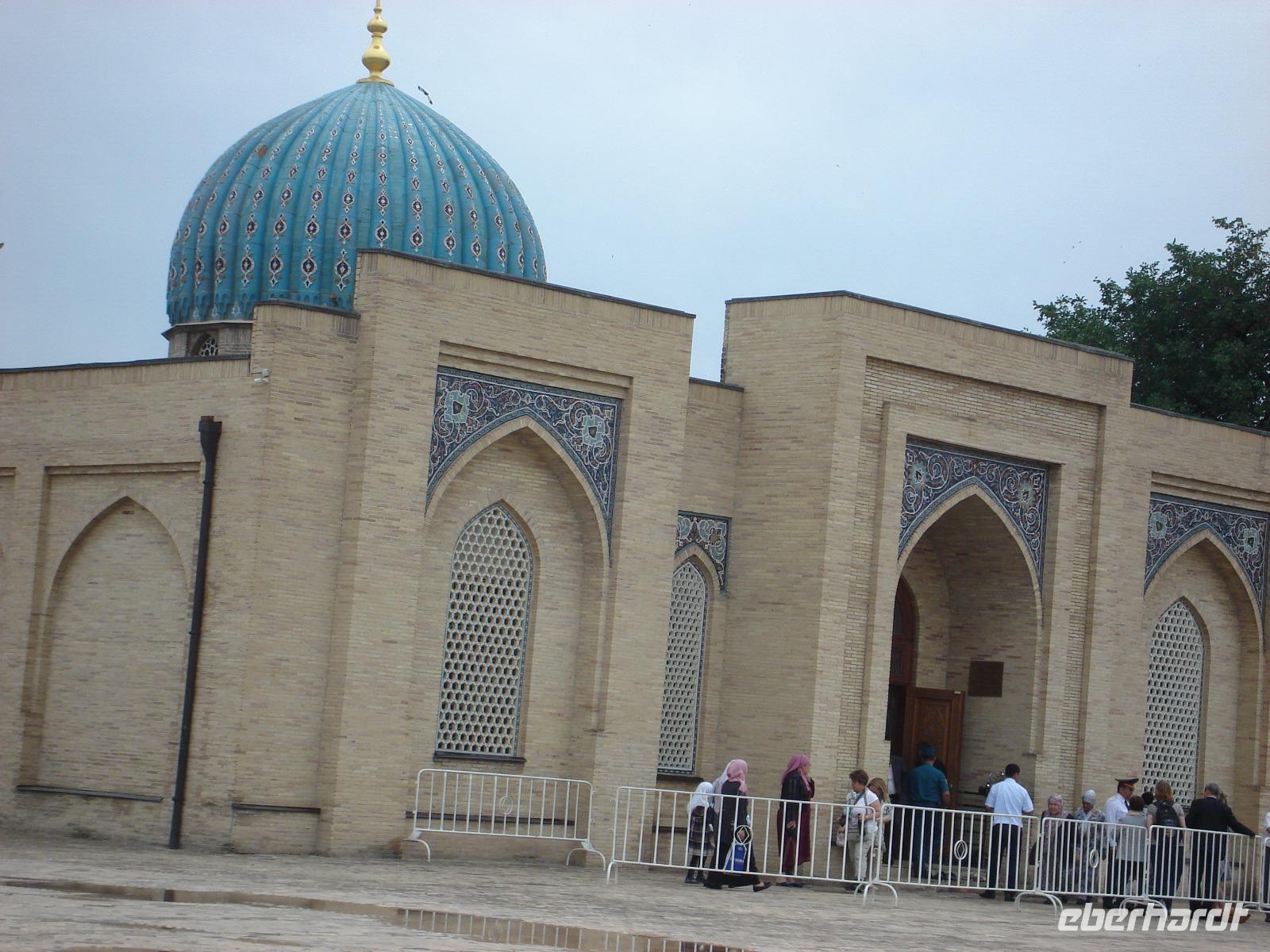 Danach fahren wir noch zum Mausoleumskomplex Gur-Emir mit dem Grab des berühmten Timur Lenk, über den wir inzwischen schon allerhand gehört haben. In der Stadt haben wir sein monumentales Denkmal gesehen.