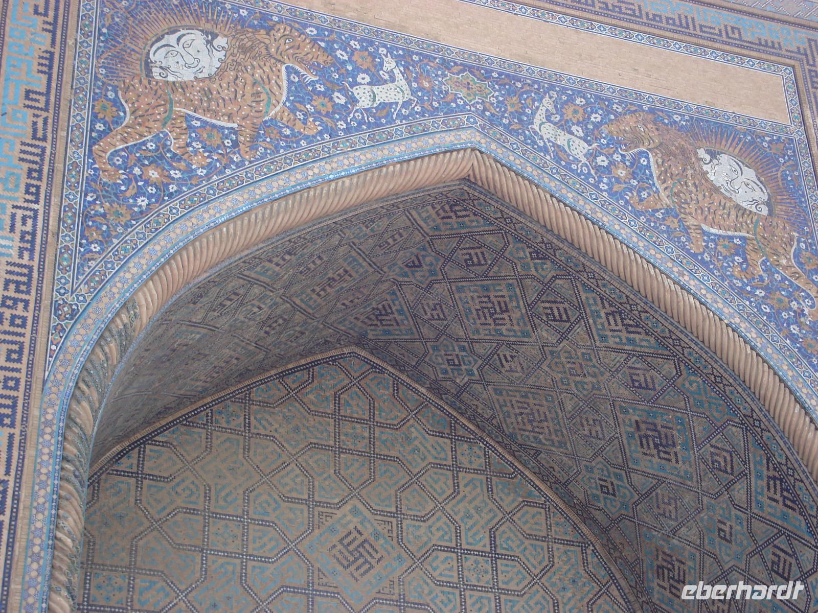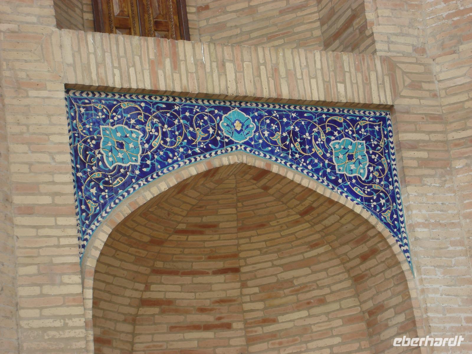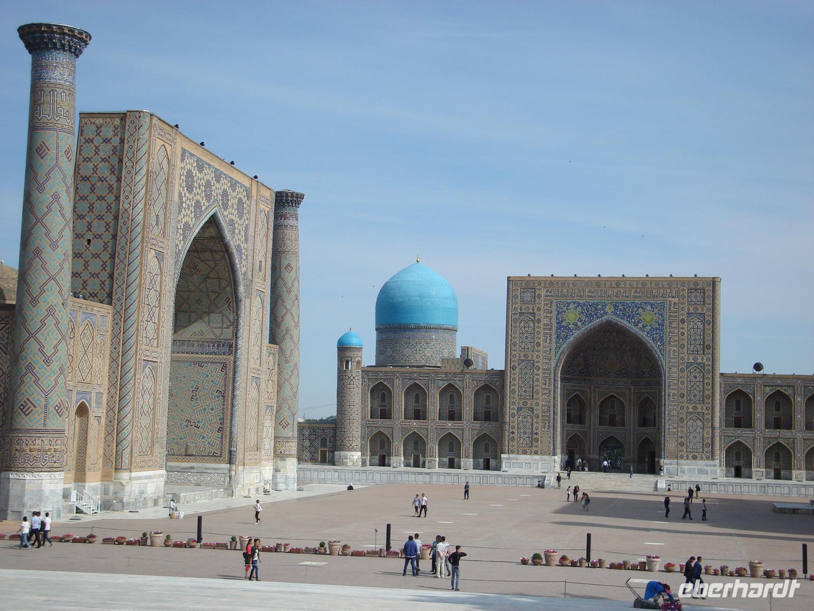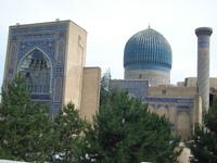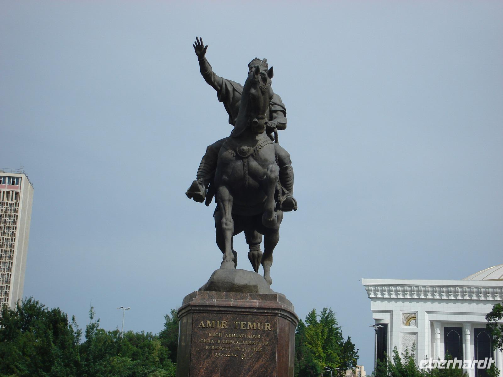 Danach fahren wir noch zum Mausoleumskomplex Gur-Emir mit dem Grab des berühmten Timur Lenk, über den wir inzwischen schon allerhand gehört haben. In der Stadt haben wir sein monumentales Denkmal gesehen.