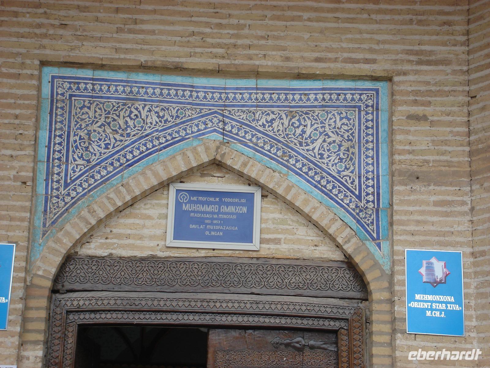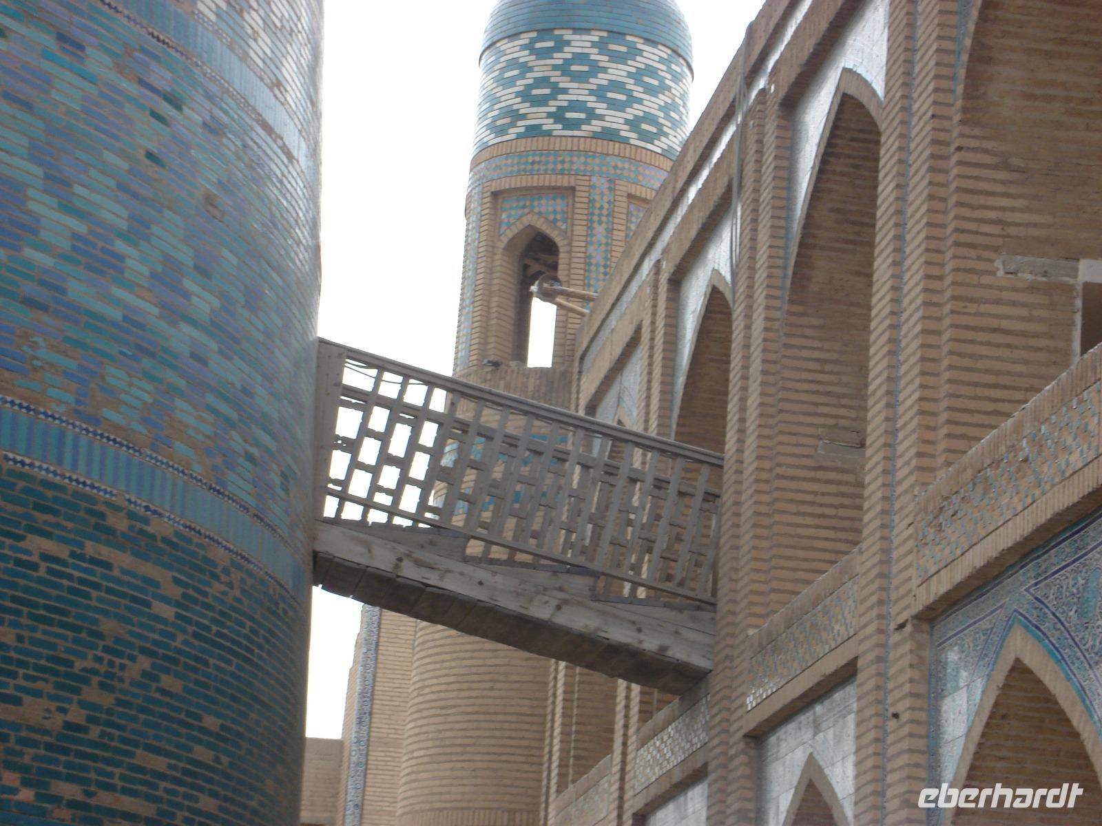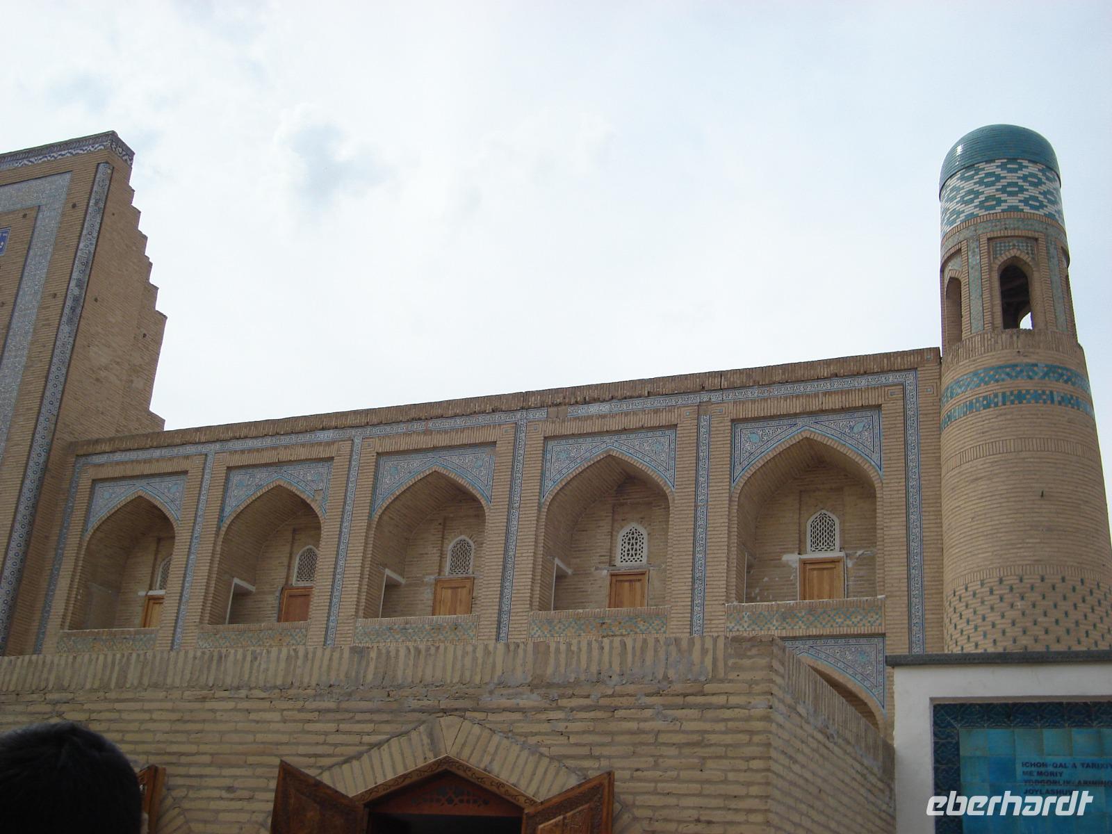 Chiwa war schon sehr früh ein bedeutender Ort an der Seidenstraße. Bereits im 6. Jh. v. Chr. kamen hier Karawanen mit kostbaren Seidenballen aus China vorbei. Prächtig ausgestattete Gebäude wie die Djuma-Moschee, das Islam Khodja-Minarett, Medresen und der Tash Hauli-Palast sind Zeugen der bewegten Geschichte und bilden hier ein riesiges Freilichtmuseum. Wie kommen aus dem Staunen nicht heraus und wollen natürlich alles möglichst im Bild festhalten. Heute ist Sonntag. Da sind besonders viele Einheimische auf Besichtigungstour in Chiwa. Das Wetter ist gut und lockt ins Freie. Und wir müssen immer wieder aufpassen, dass sich die Gruppe nicht verliert. Die Ablenkung ist wirklich groß.