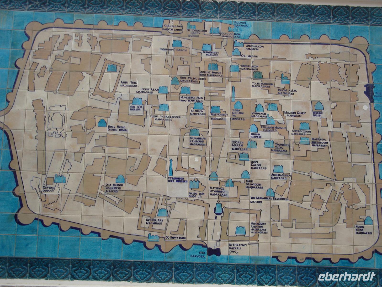 Heute besteigen wir wieder ein Flugzeug. Es geht zunächst nach Urgentsch [usbekisch: Urganç, russisch: Urganc], dann mit dem Bus nach Chiwa [usbekisch: Xiva, russisch: Chiva]. Hier fahren wir zunächst zum Hotel, einem wirklich schönen Gebäude, welches sich direkt neben der alten Stadtmauer befindet. Auch das Umfeld dieses früh erwähnten Ortes ist für uns interessant: wir sehen die Wüste, und um uns herum ist endlose Weite. Das konnte man auf dem Flug nach Urgentsch schon gut aus der Luft sehen.