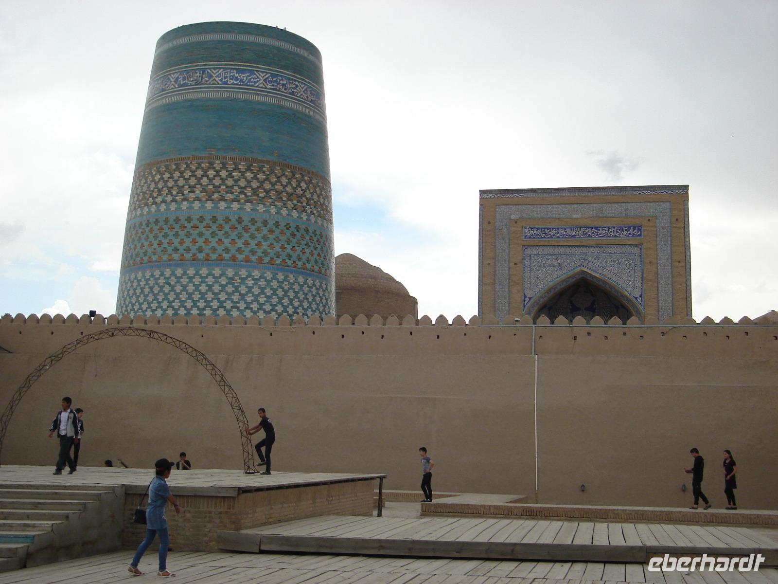 Zika geht mit uns auf einen Rundgang zu den Sehenswürdigkeiten Chiwas. Dabei lernen wir auch das dortige Kunsthandwerk näher kennen. Später steht der Besuch bei der Zirkusfamilie Darbozschi in der Medrese Feruz Khan auf dem Programm. Es gibt eine kleine Darbietung für uns, bei der schon der Zirkus-Nachwuchs sein Talent und Können zeigen kann. Wir applaudieren kräftig.