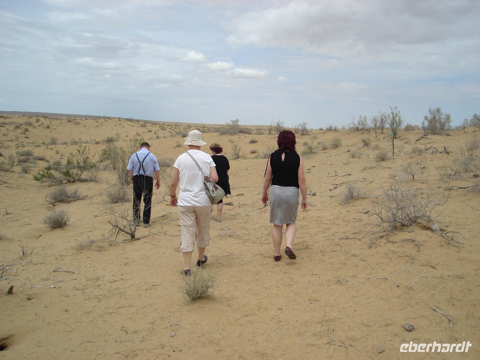 Heute rücken wir weiter, schließlich sind wir auf einer Rundreise. Nach dem Frühstück verlassen wir das uns schnell vertraut gewordene Chiwa und fahren durch einen Teil der riesigen Wüste Kizilkum, auf den Spuren mongolischer Steppenreiter. Teilweise geht es entlang des Amudarja-Flusses [usbekisch: Amudarjja, russisch: Amudar'ja] sowie durch endlose, eindrucksvolle Halbwüsten- und Steppenlandschaft.