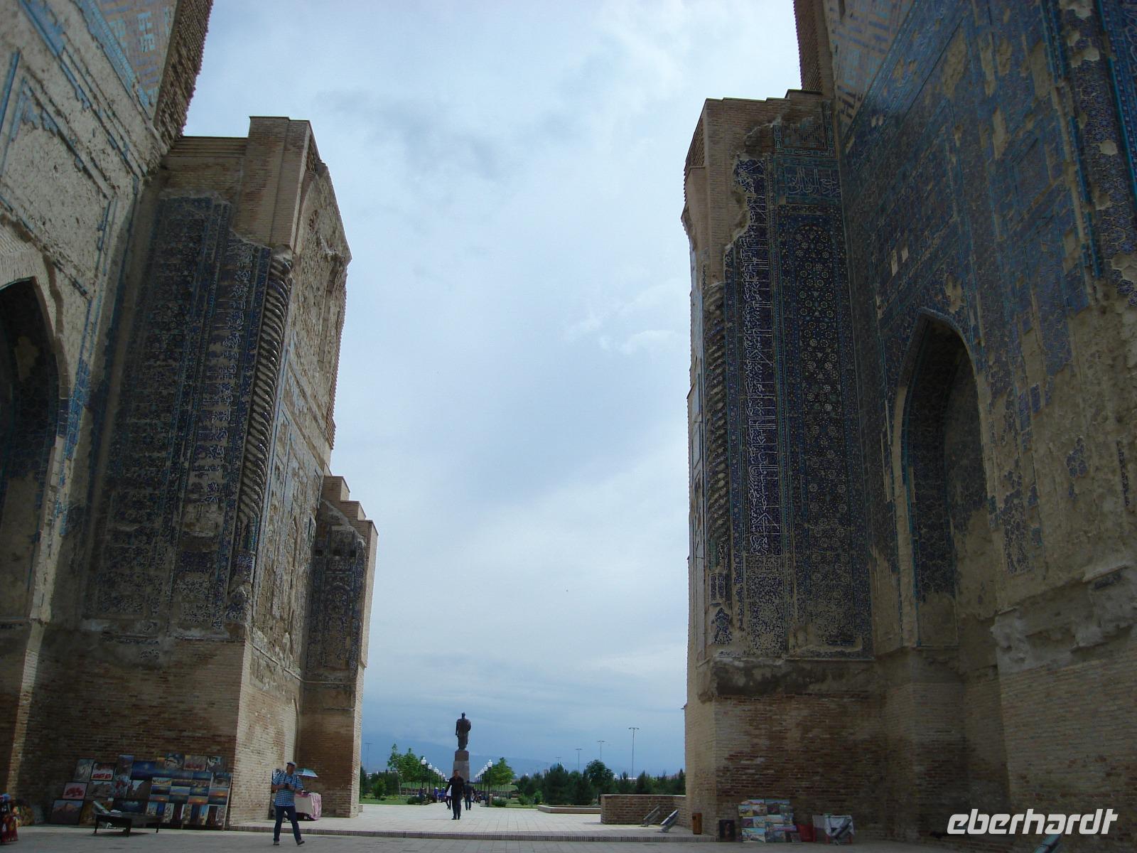 Heute ziehen auch wir wieder weiter. Unser Ziel ist Schahrisabs, die Geburtsstätte von Timur Lenk, der vielen auch als Tamerlan bekannt ist. Er war ein zentralasiatischer Militärführer und Eroberer islamischen Glaubens am Ende des 14. Jh., der Herrscher der Goldenen Horde und einer der letzten Kaiser der Mongolen. Seine Herrschaft ist gekennzeichnet durch Brutalität und Tyrannei, aber er ist gleichzeitig auch als großzügiger Kunst- und Literaturförderer bekannt geworden. Allein die Ruinen des Ak Saray (Weißes Schloss), einem einst großartig angelegten Palast, vermitteln noch heute einen überwältigenden Eindruck.