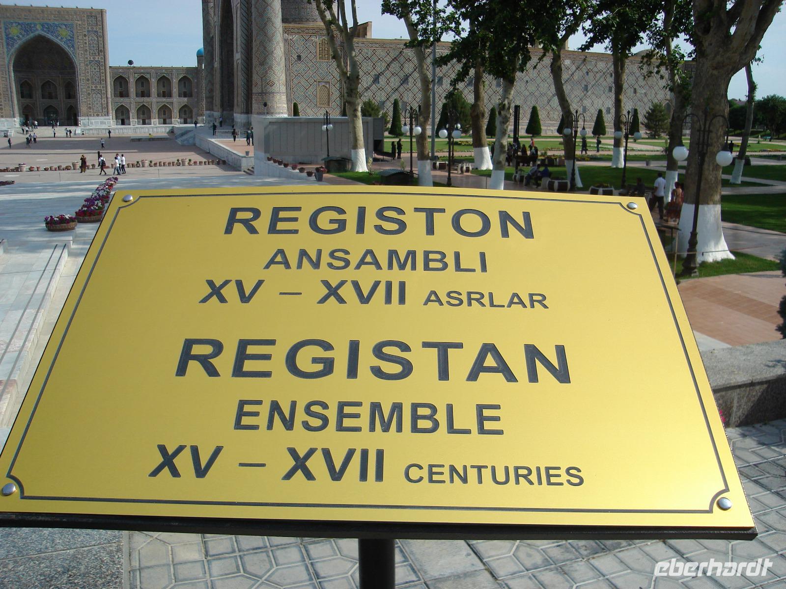 Aber nun wartet schon Samarkand auf uns, eine der schönsten Städte des Orients. Unter der Herrschaft von Timur Lenk wurde es 1369 zur Hauptstadt seines Reiches. Wieder sind wir sehr gespannt. Die Stadt liegt in einer Fluss-Oase der Sarafschan-Berge [usbekisch: Zarafson, russisch: Zarafšan].